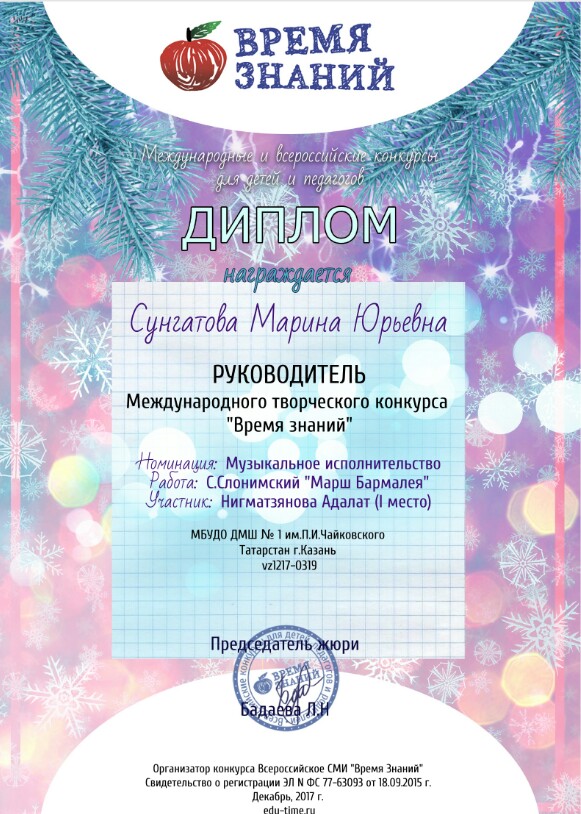 Международный творческий конкурс "Время знаний" - Сунгатова М.Ю., Диплом;