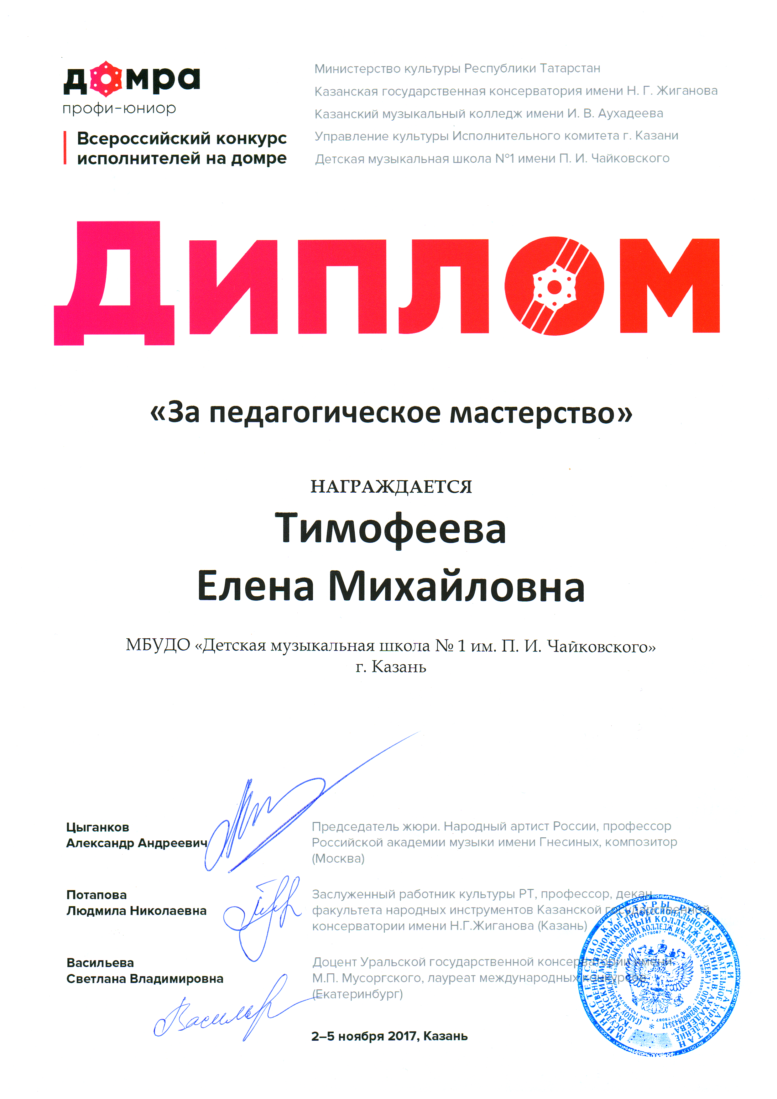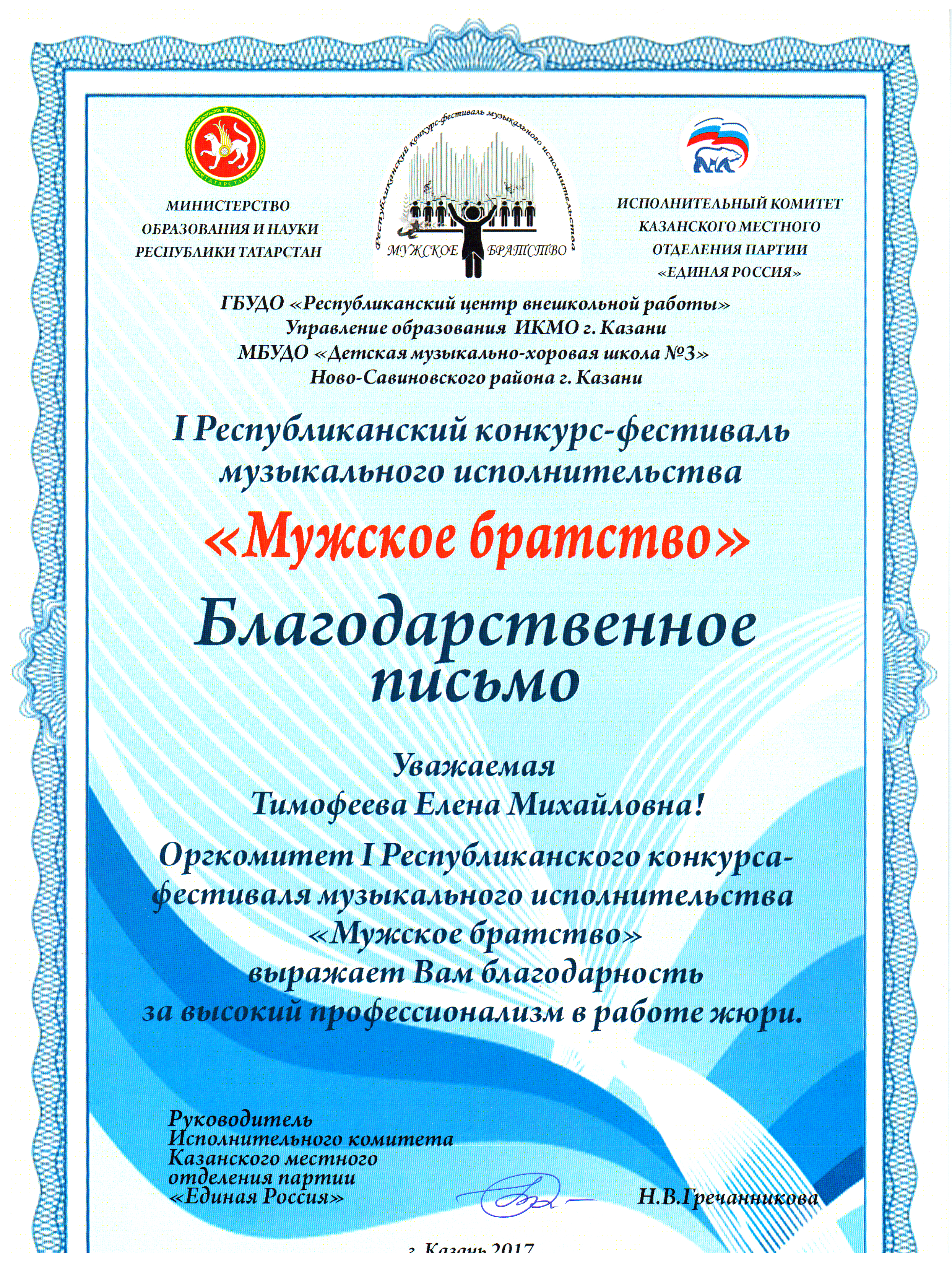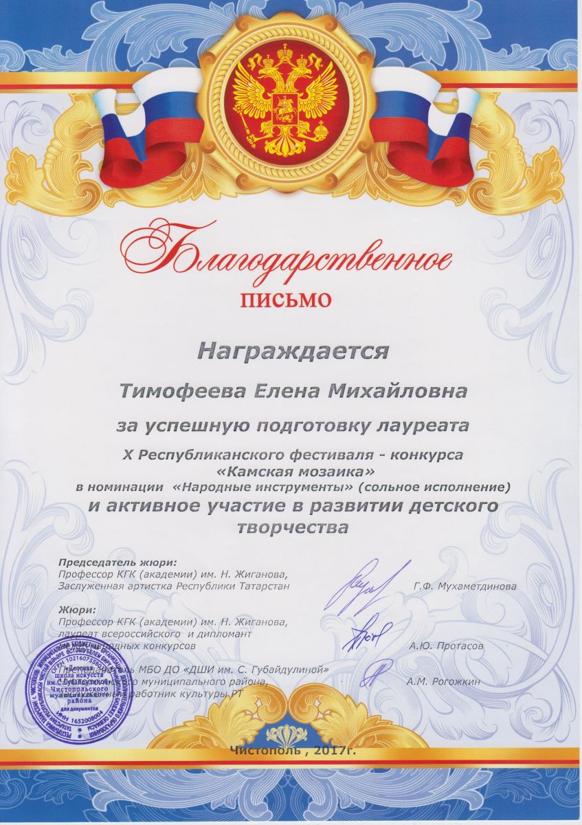 Х Республиканский фестиваль-конкурс "Камская мозаика" - Тимофеева Е.М., Благодарственное письмо;