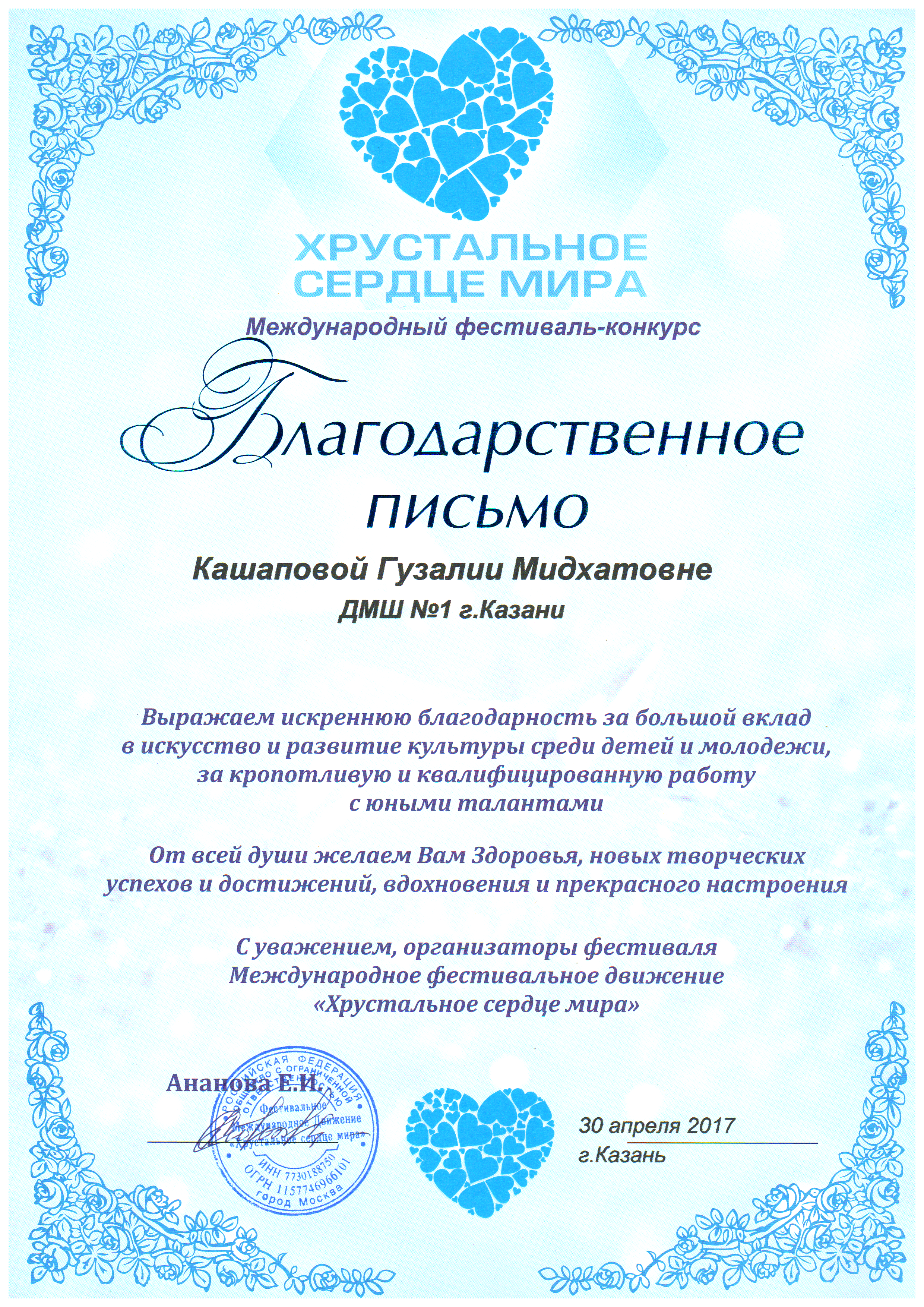 Международный фестиваль-конкурс "Хрустальное сердце мира" - Кашапова Г.М., Благодарность;