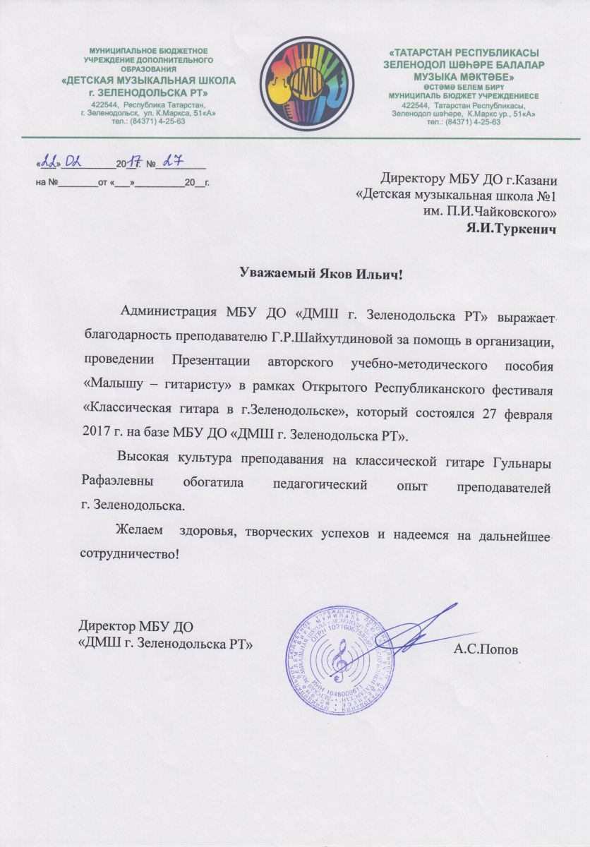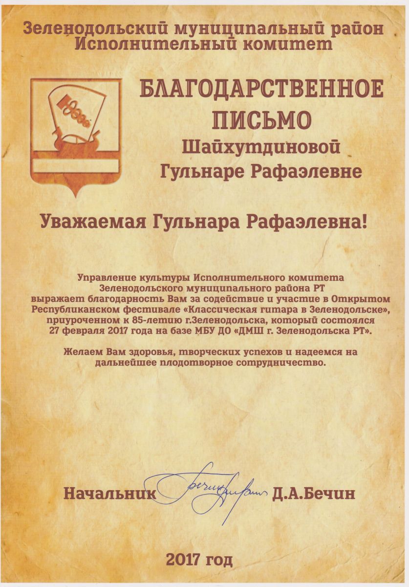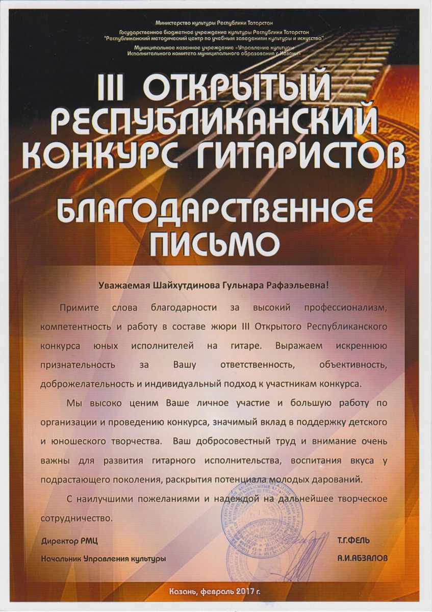 III Открытый Республиканский конкурс гитаристов - Шайхутдинова Г.Р., Благодарственное письмо;