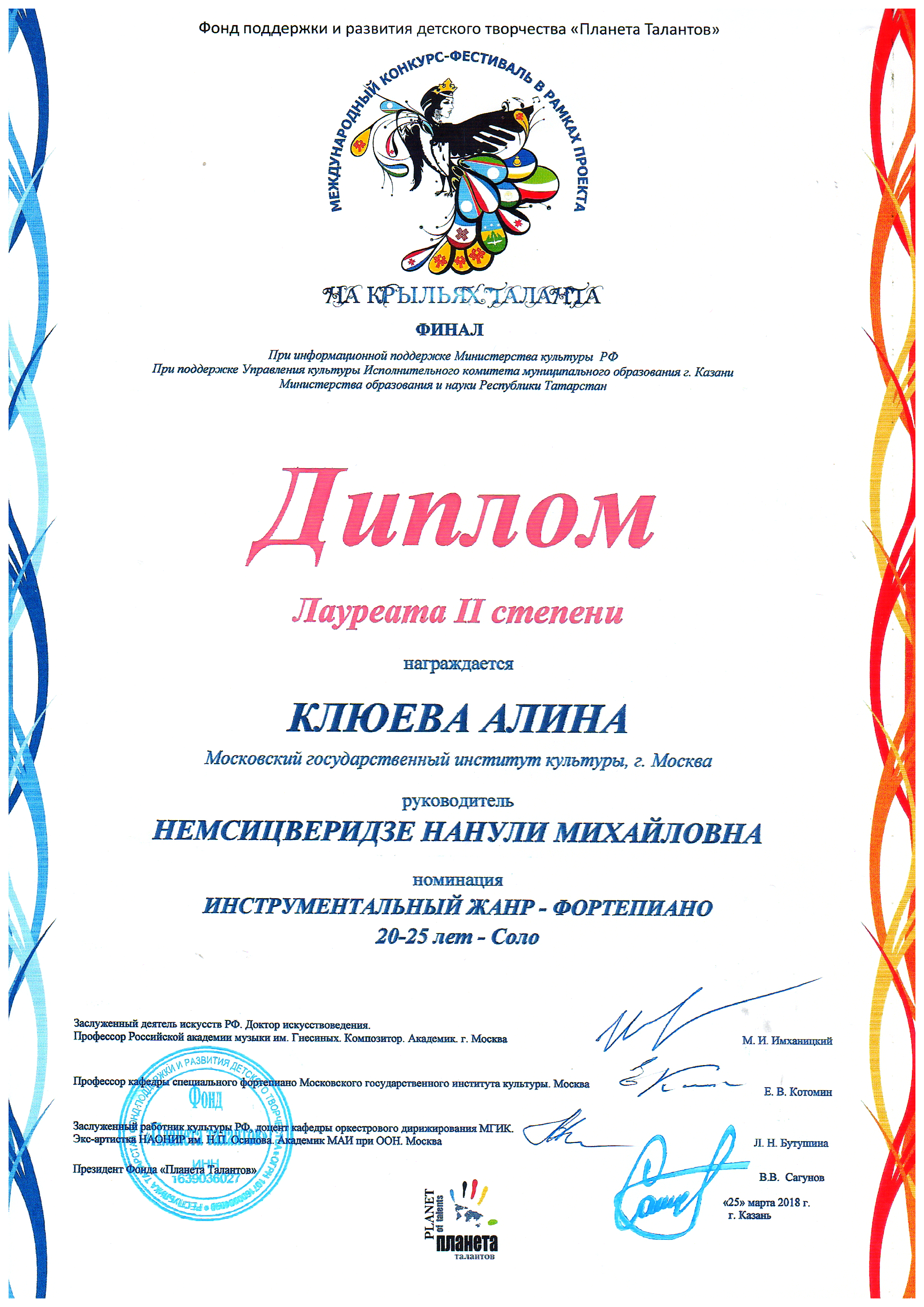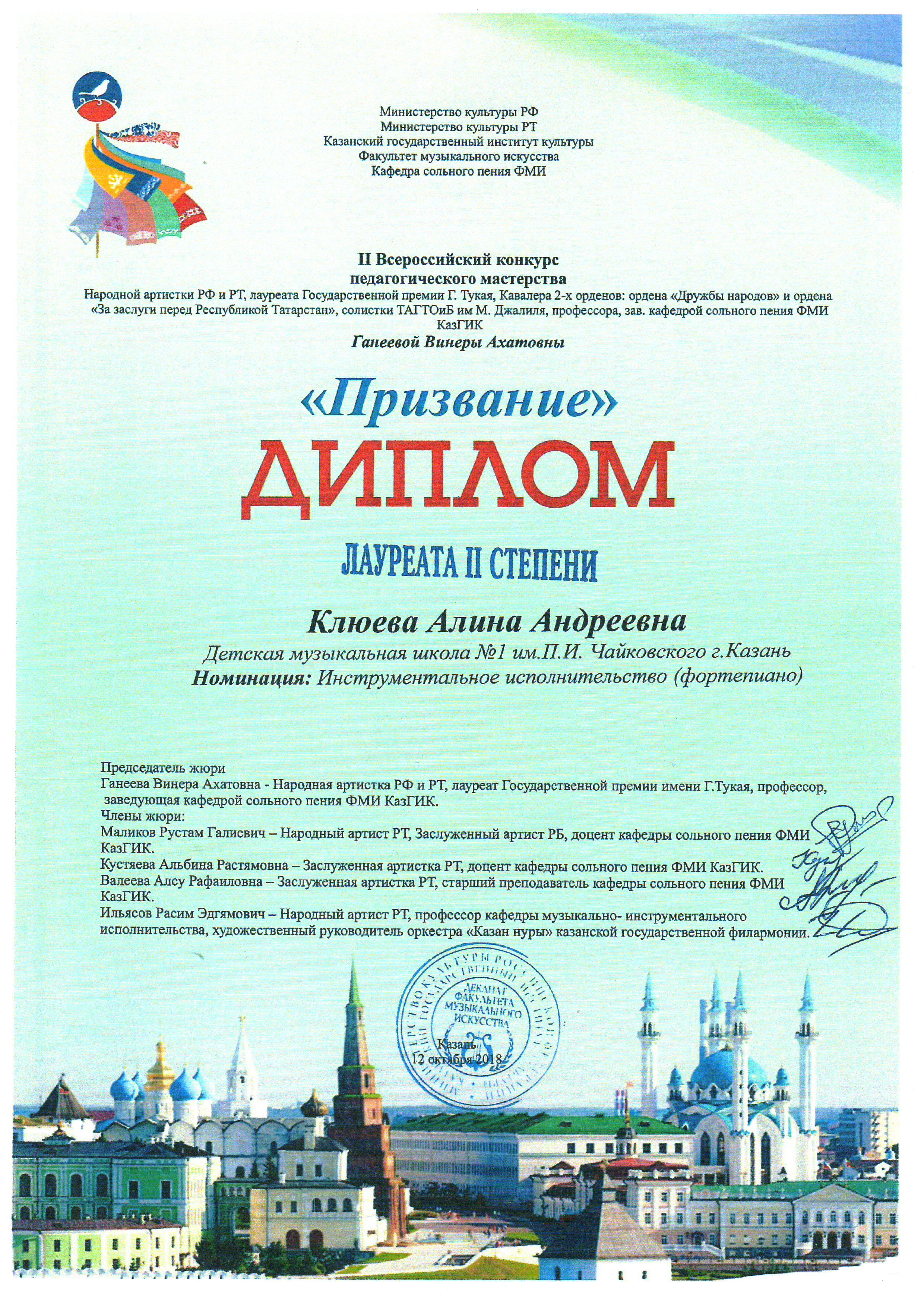 II Всероссийский конкурс педагогического мастерства "Призвание" - Клюева А.А., Лауреат II степени;