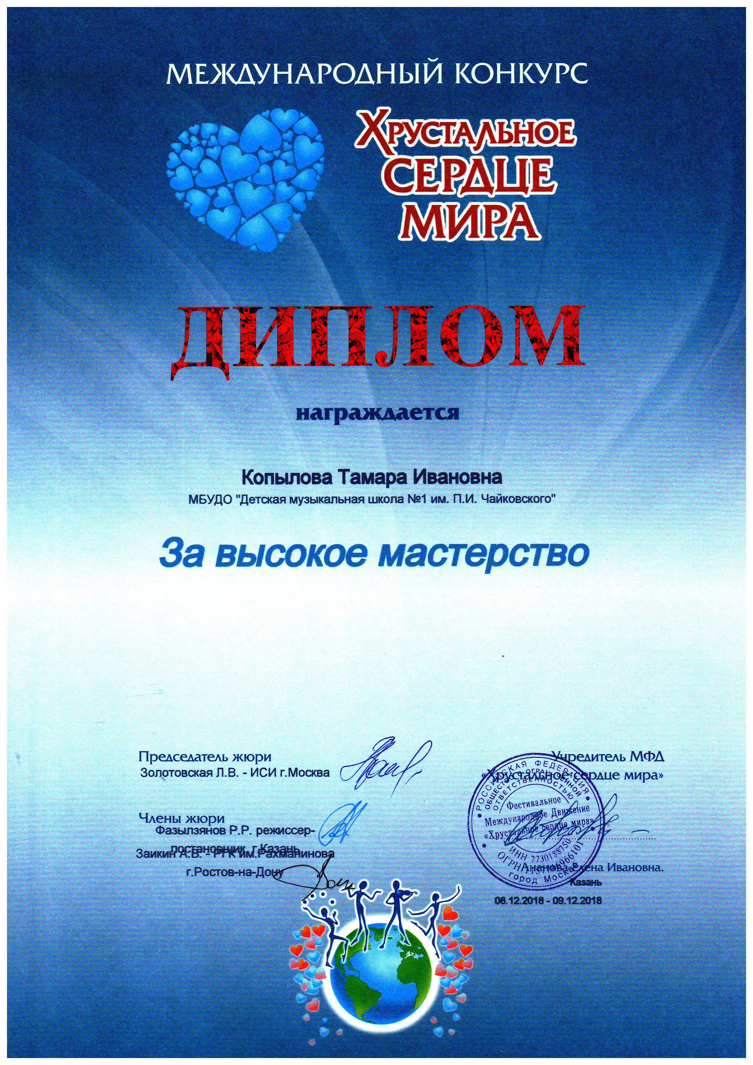 Международный конкурс "Хрустальное сердце мира" - Копылова Т.И., Диплом "За высокое мастерство";