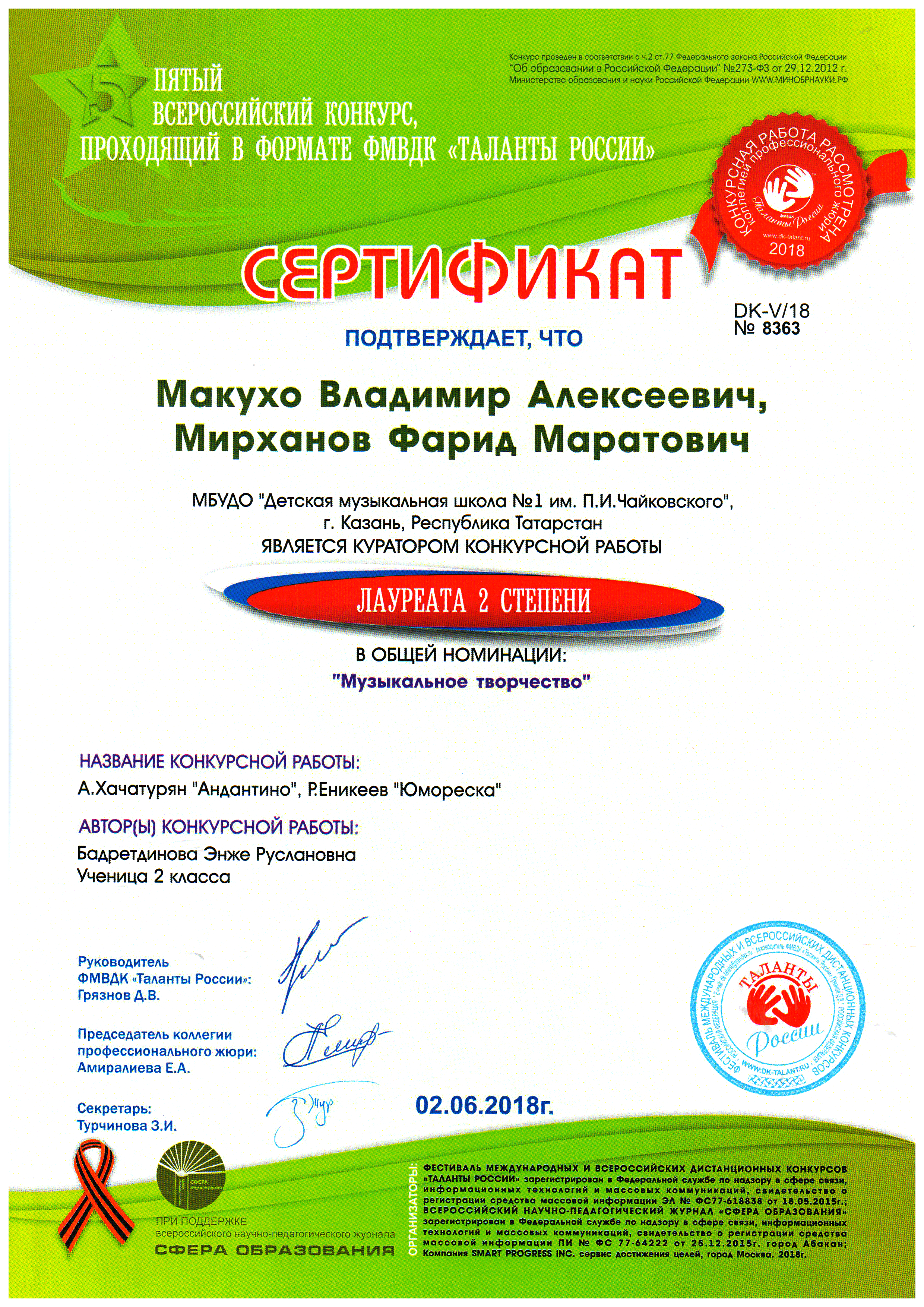 Пятый Всероссийский конкурс "Таланты России" - Макухо В.А., Мирханов Ф.М., Лауреат II степени;