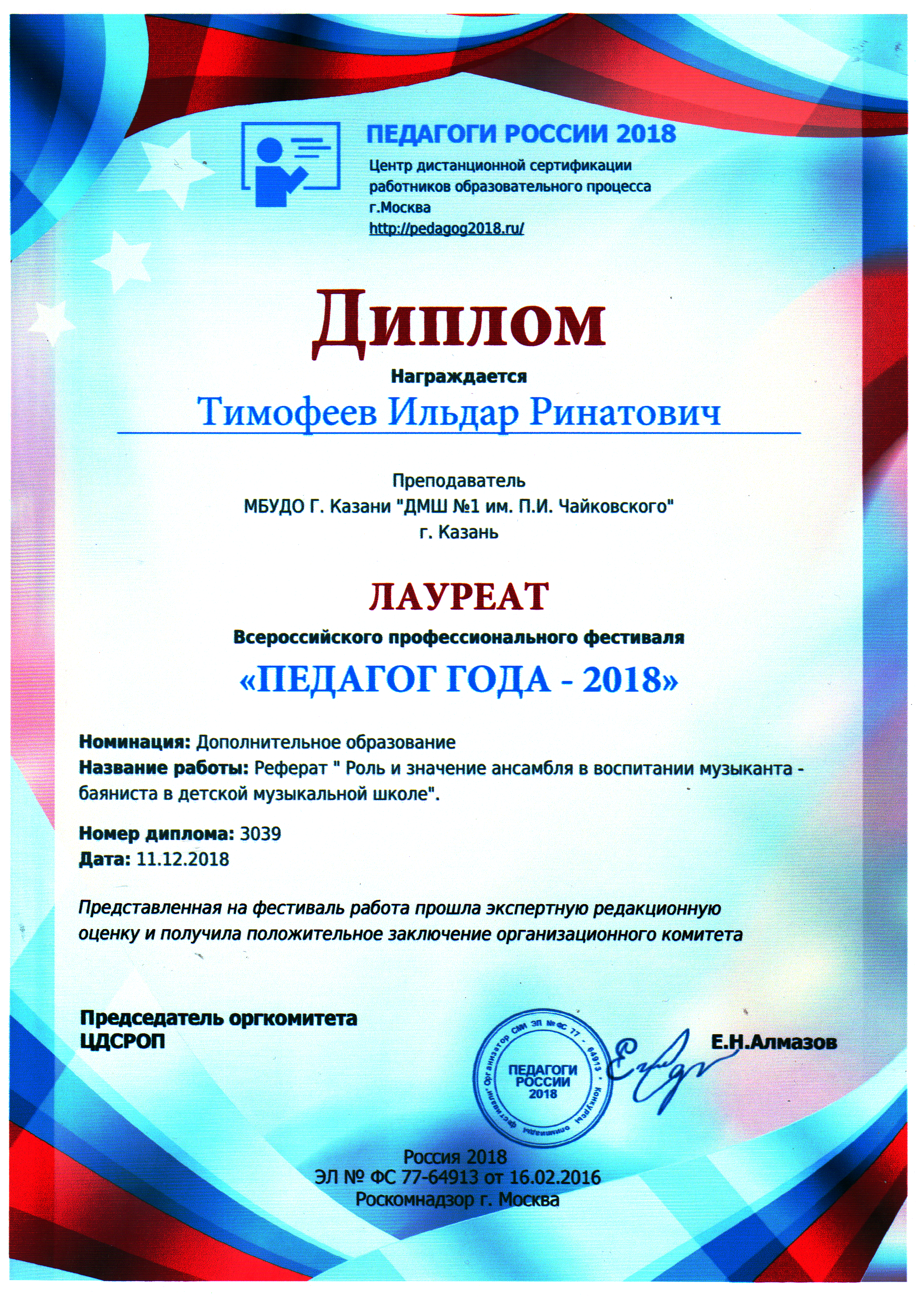Всероссийский профессиональный фестиваль "Педагог года" - Тимофеев И.Р., Лауреат;