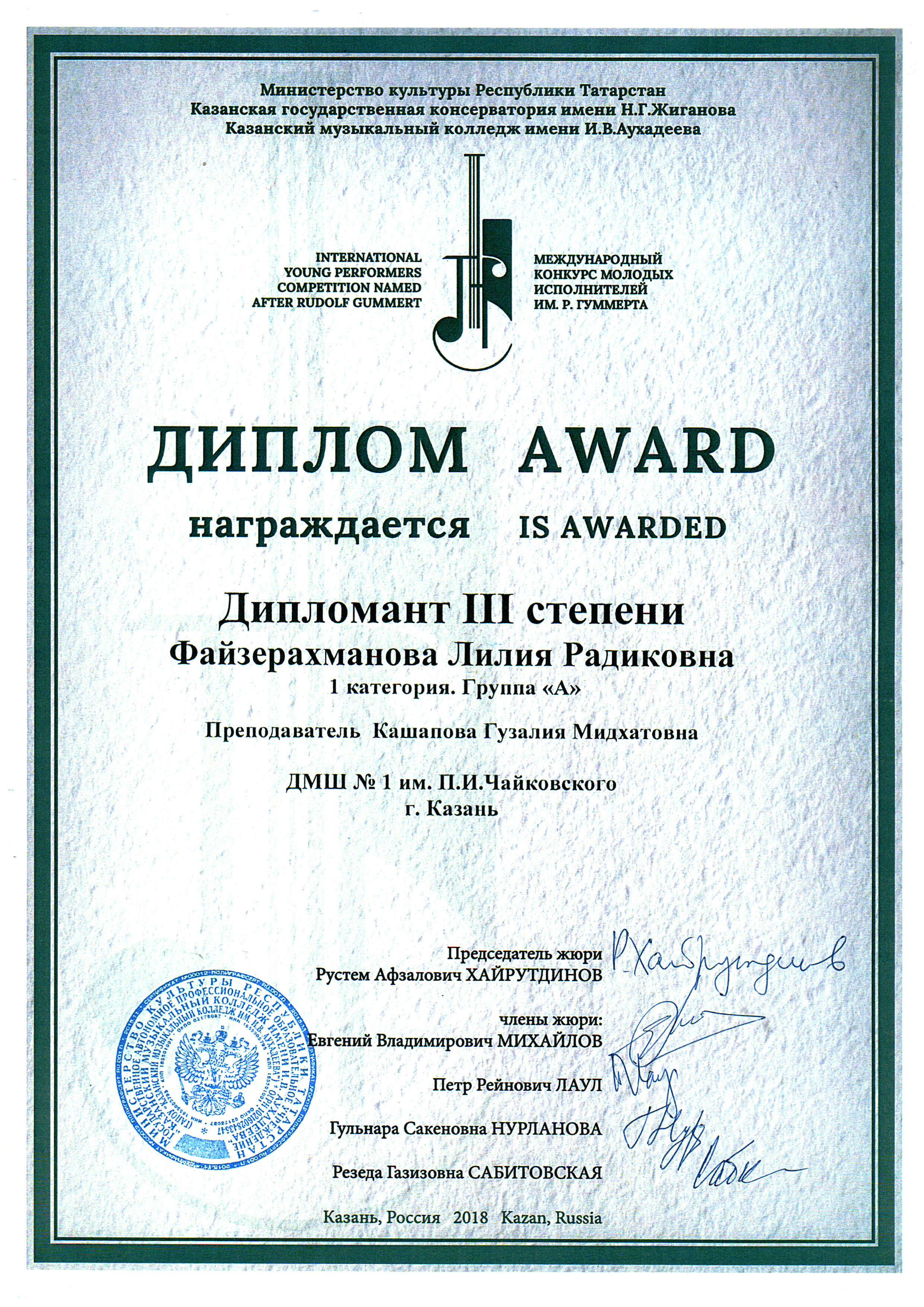 Третий Международный конкурс "Таланты России" - Бадретдинова Энже, Лауреат III степени;
