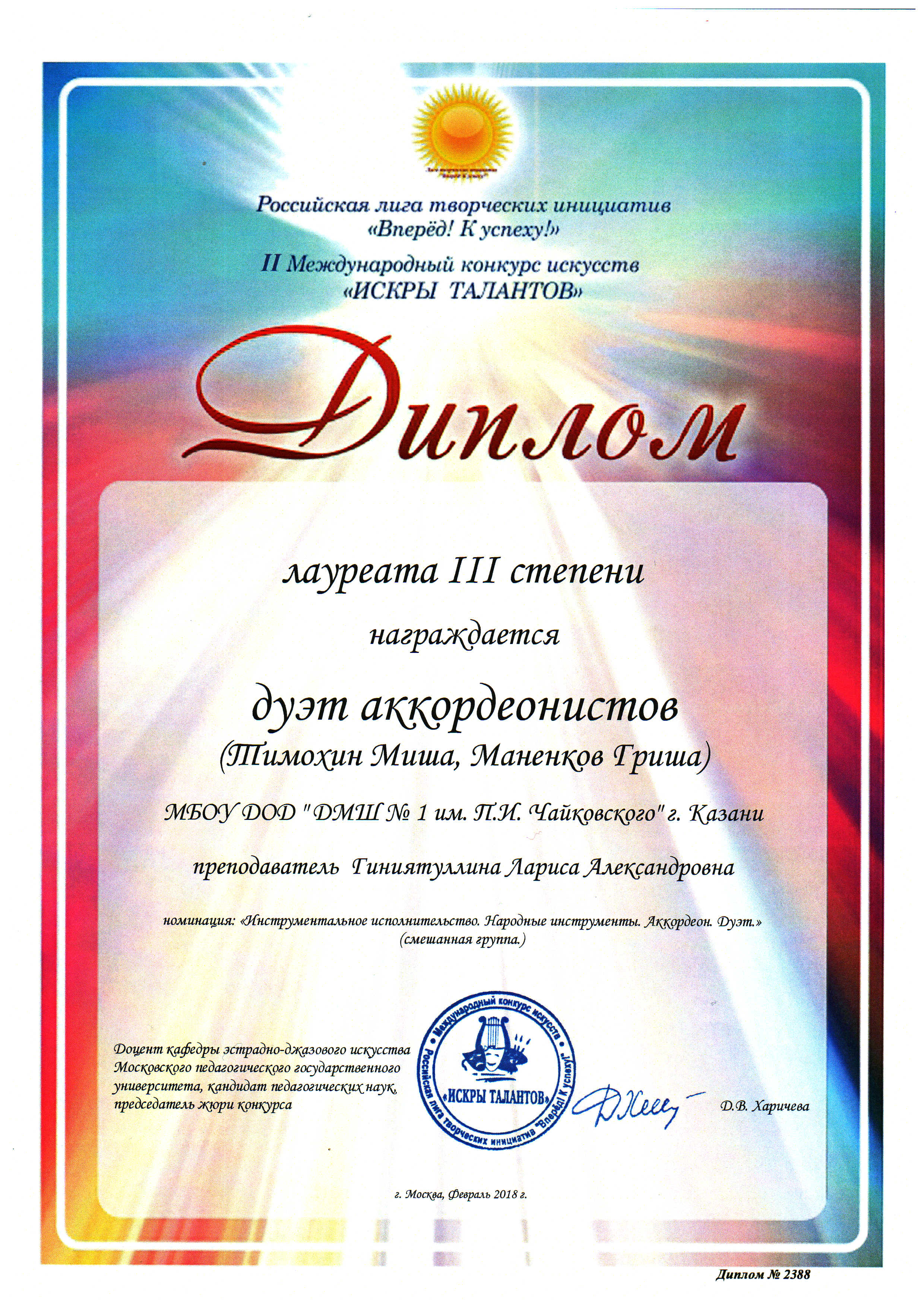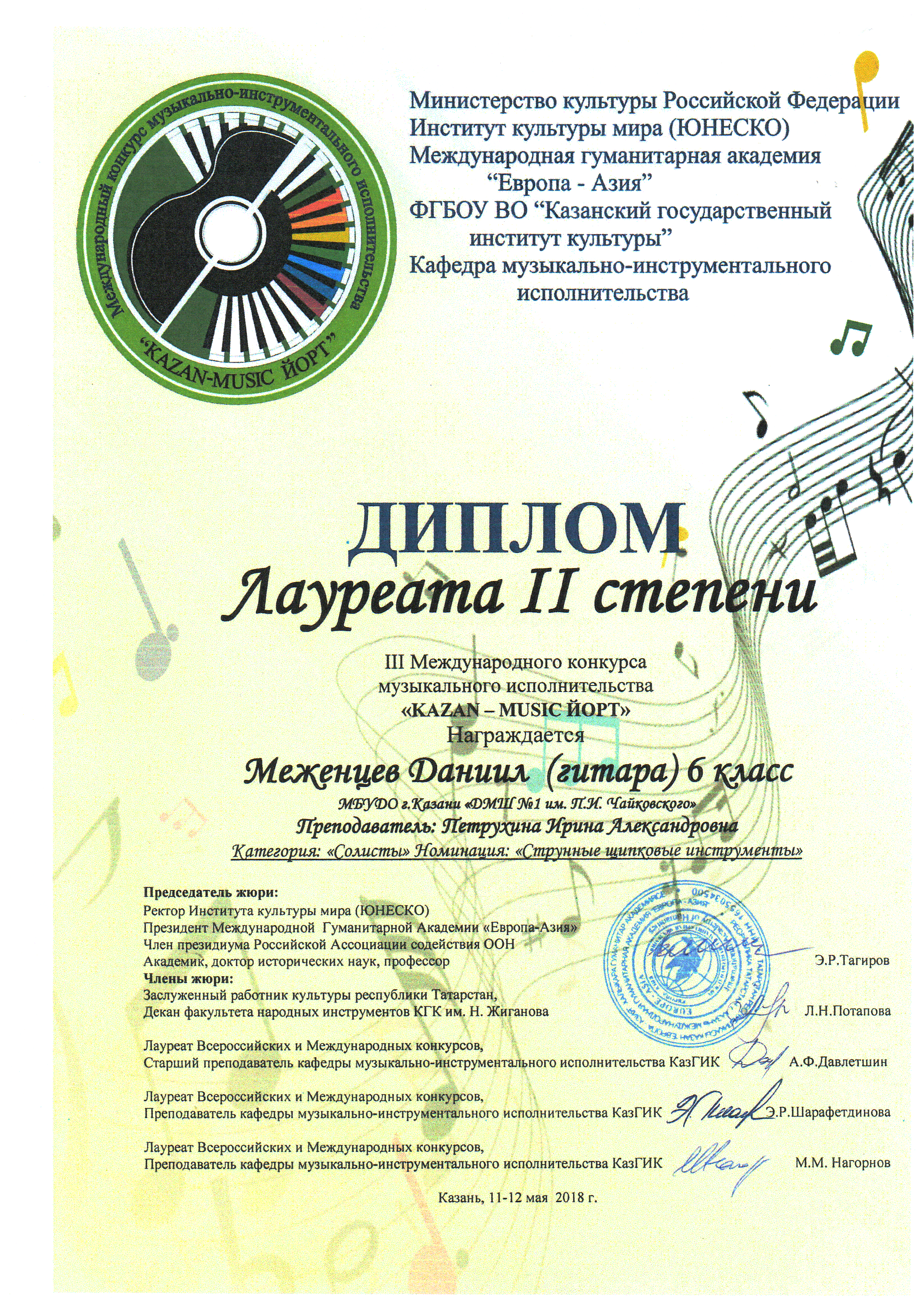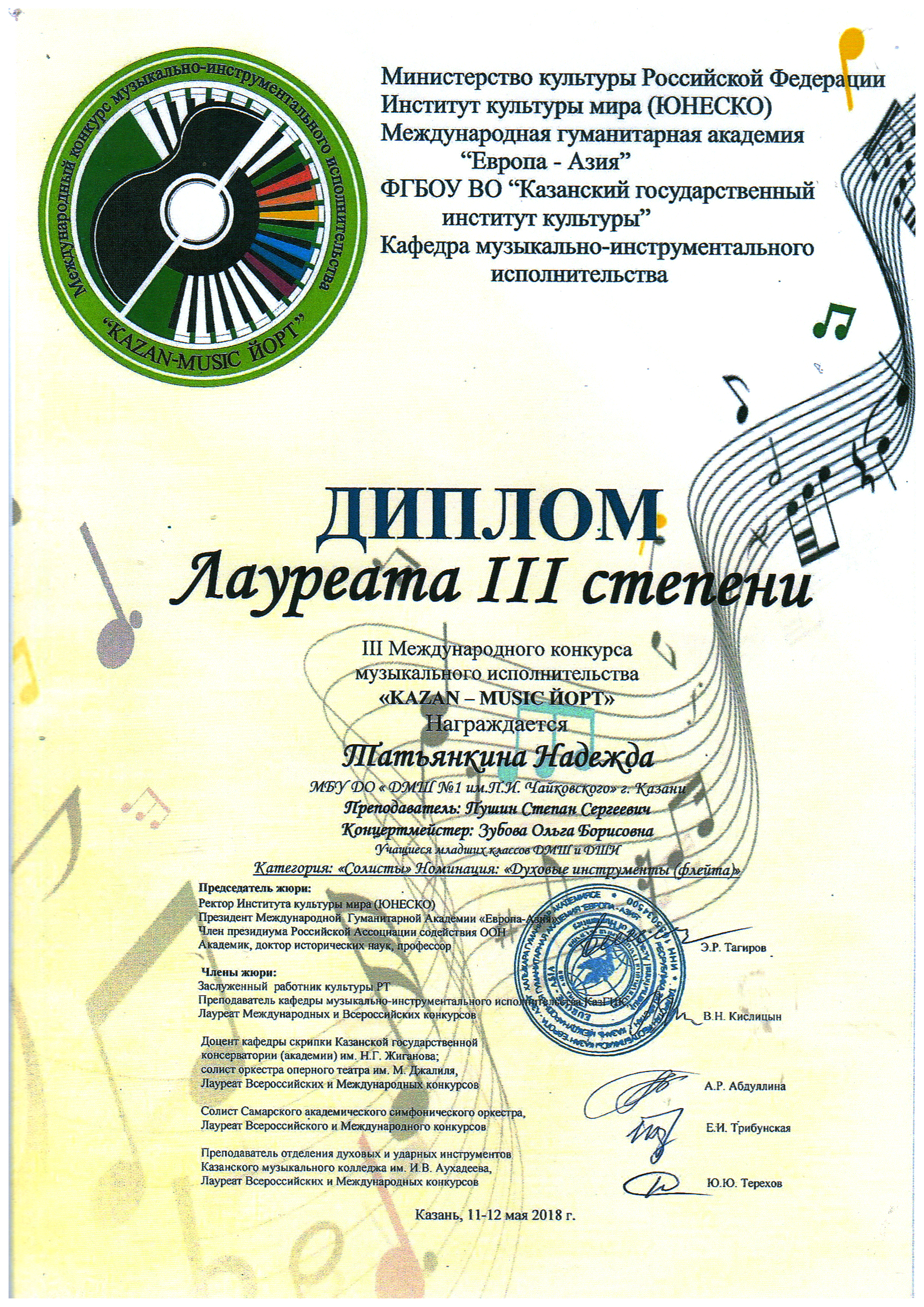 Второй Международный конкурс "Таланты России" - Сингатуллина Эмилия, Лауреат III степени;