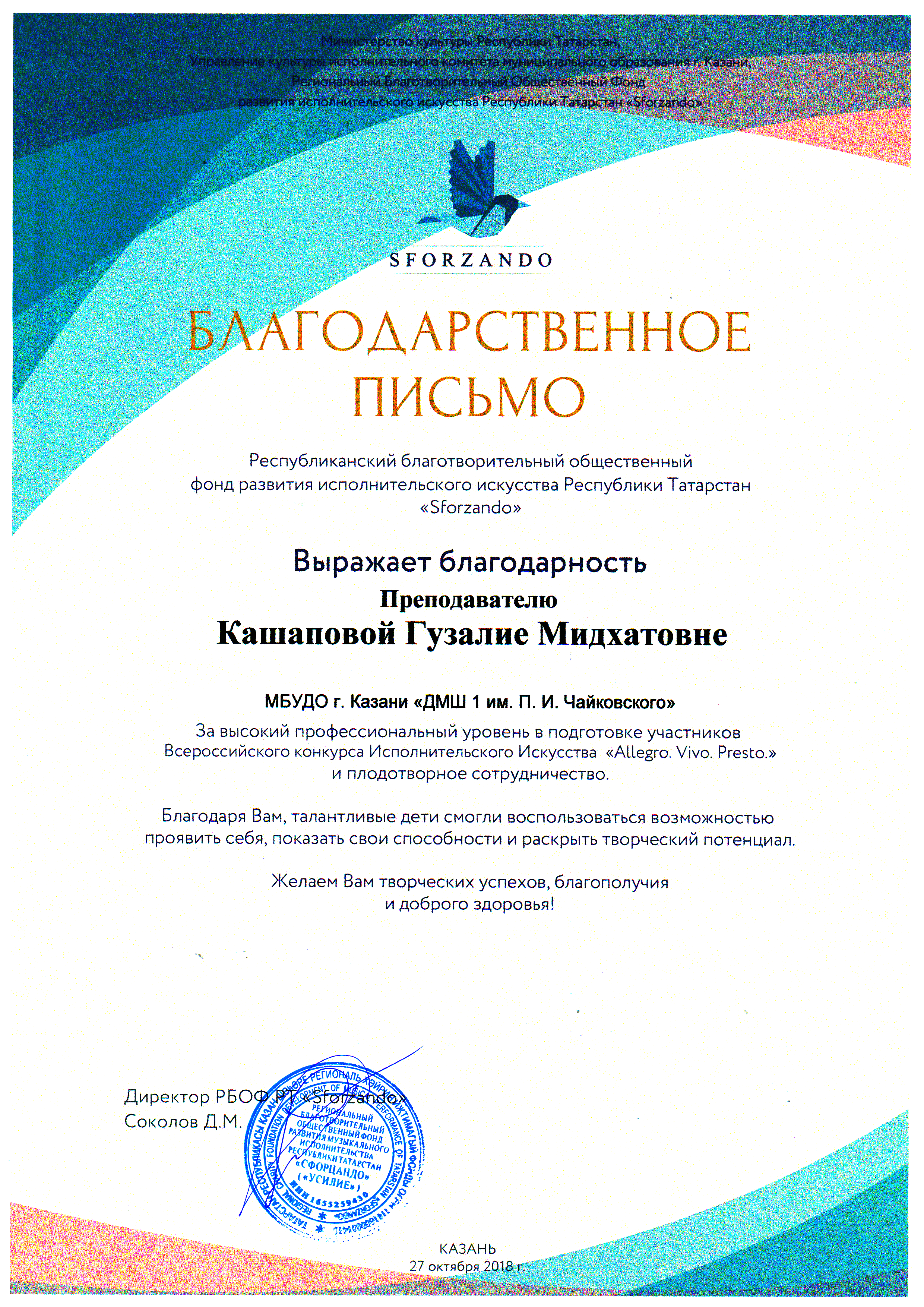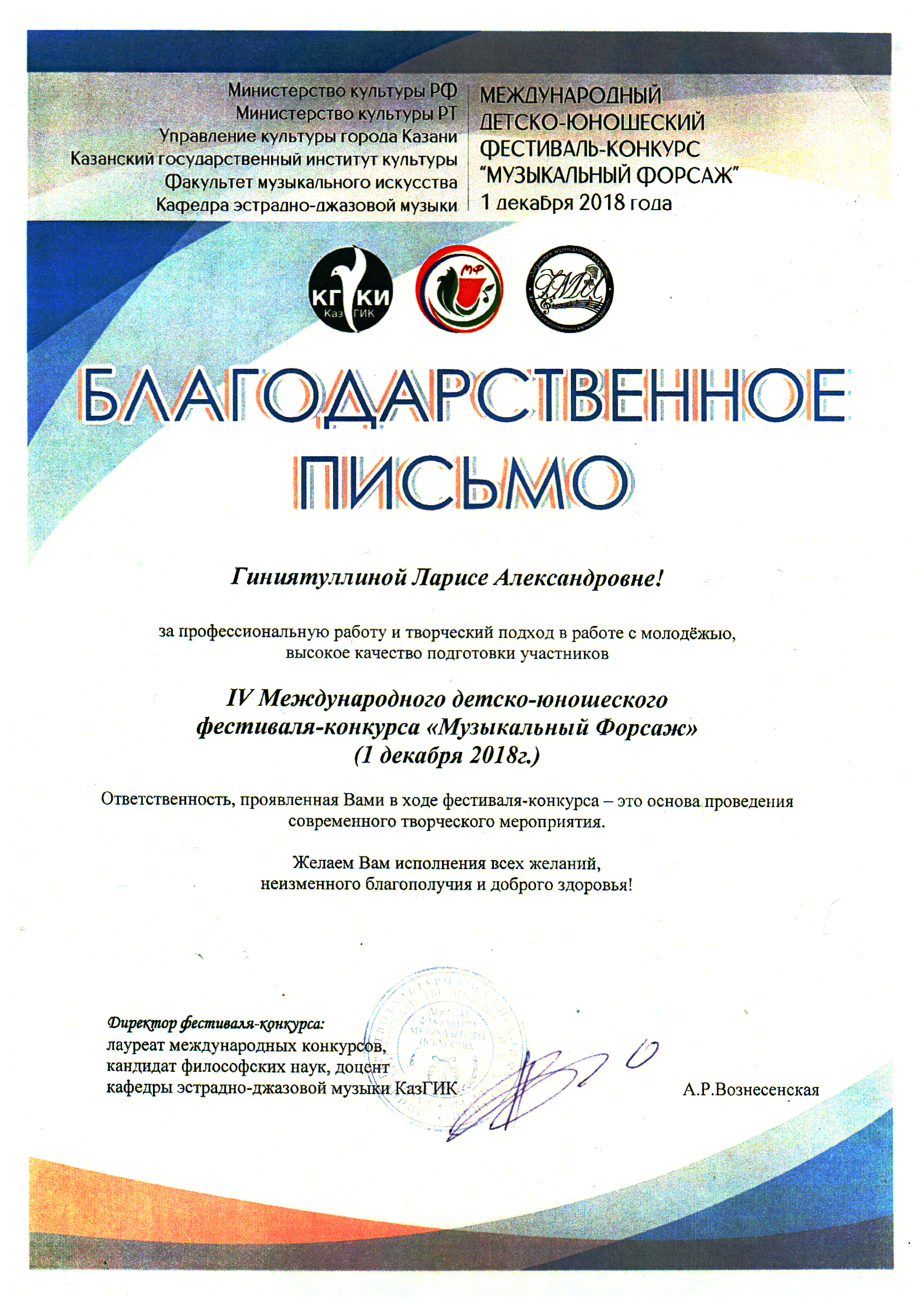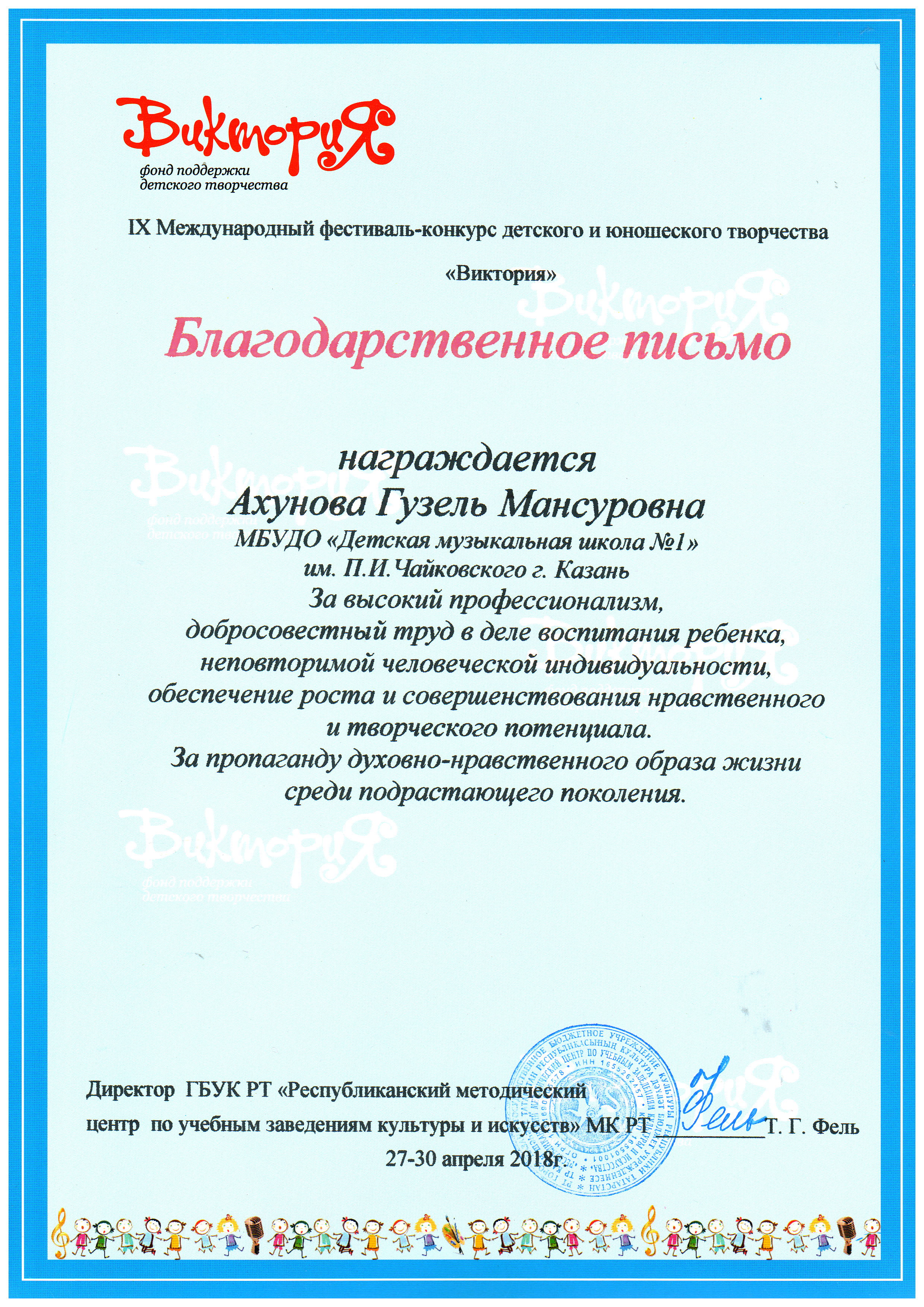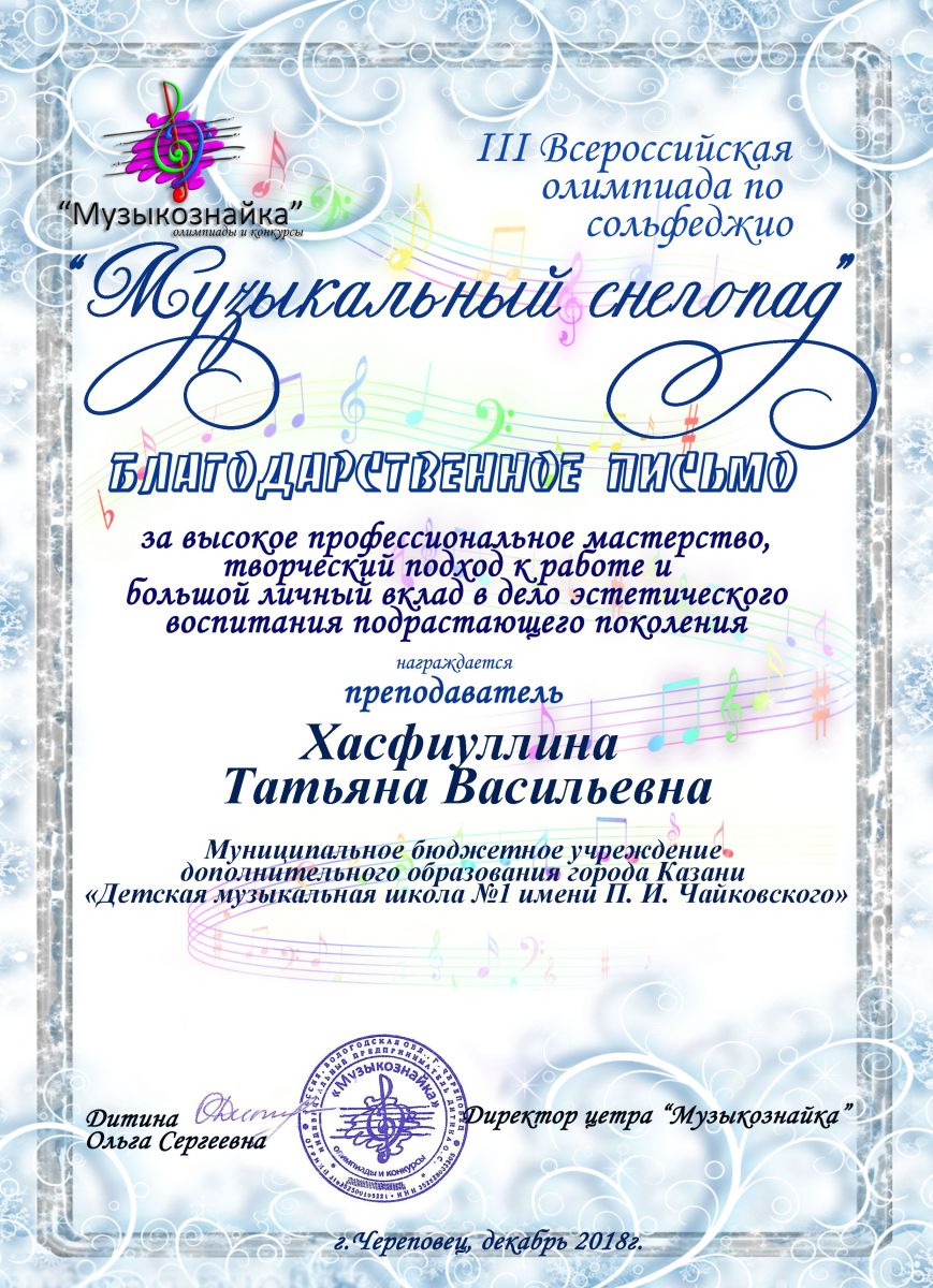 VIII Региональный конкурс по сольфеджио для младших и средних классов "Забавное сольфеджио"- Хасфиуллина Т.В., Благодарственное письмо;