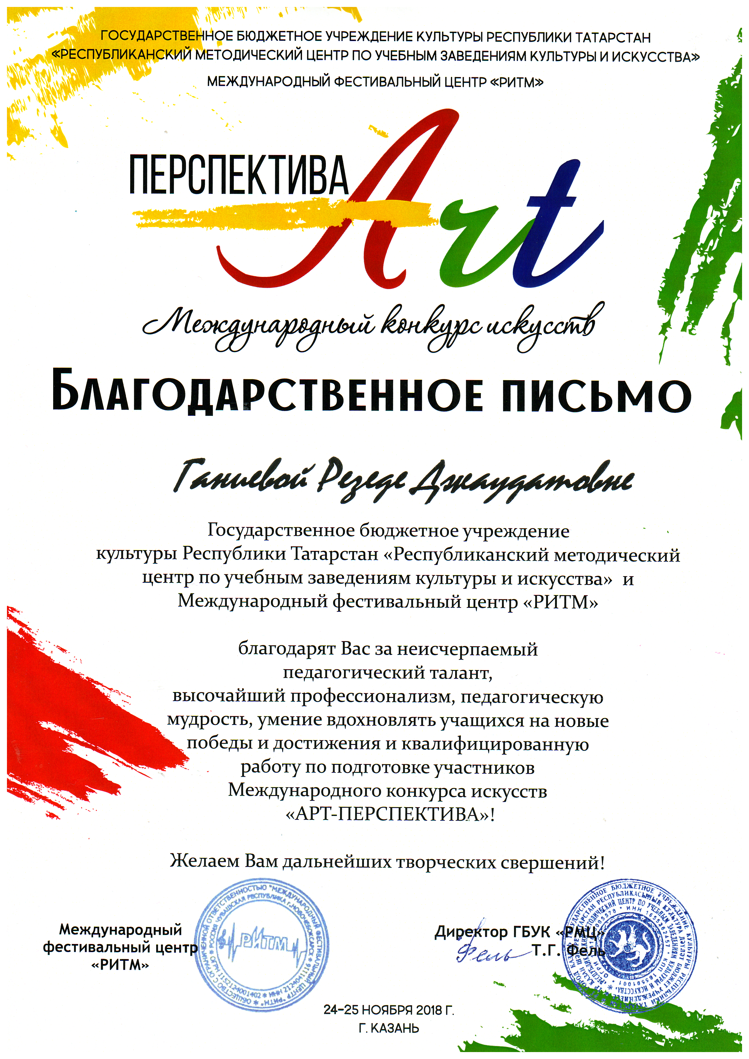 Международный конкурс искусств "ART Перспектива" - Ганиева Р.Д., Благодартсвенное письмо;