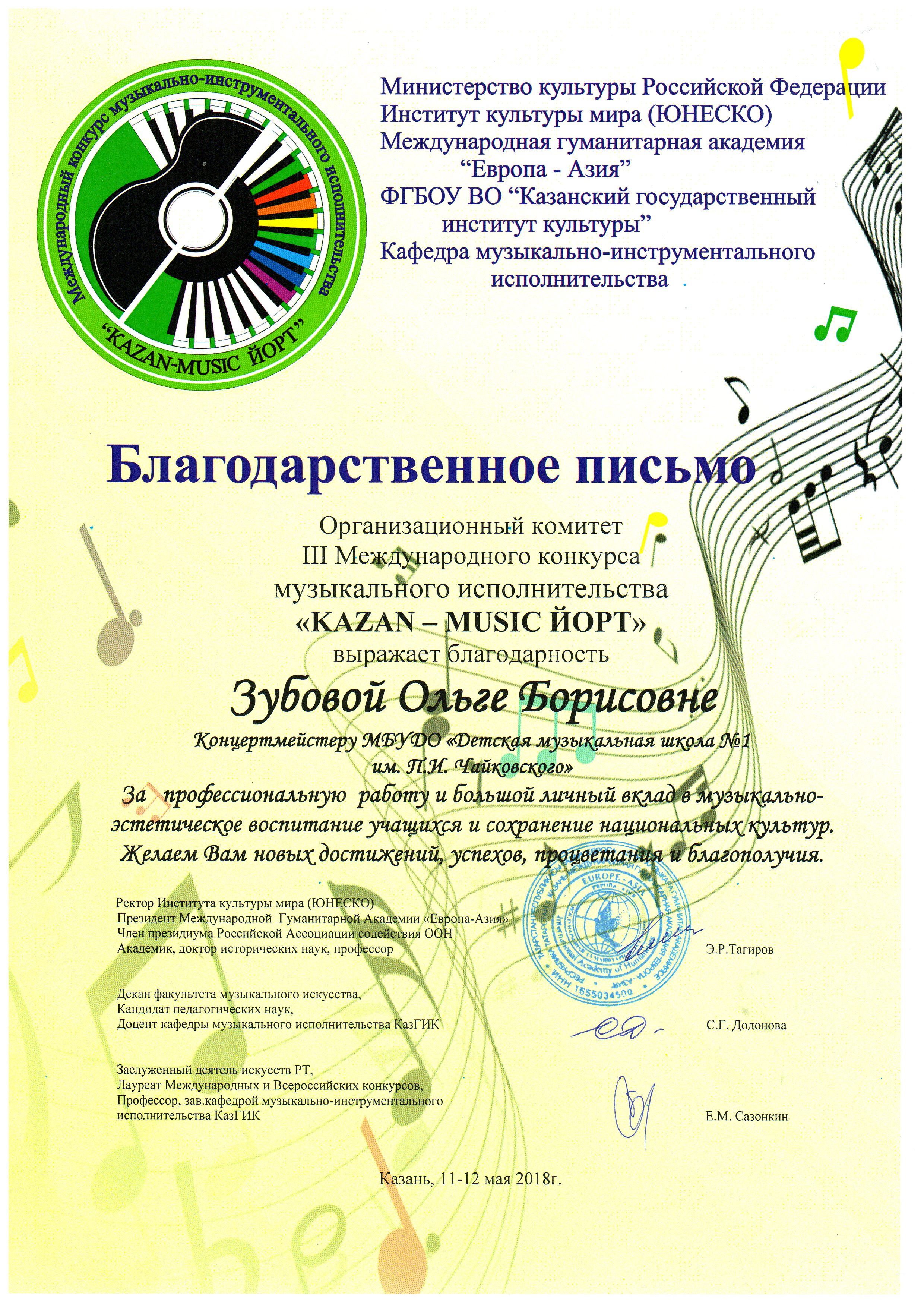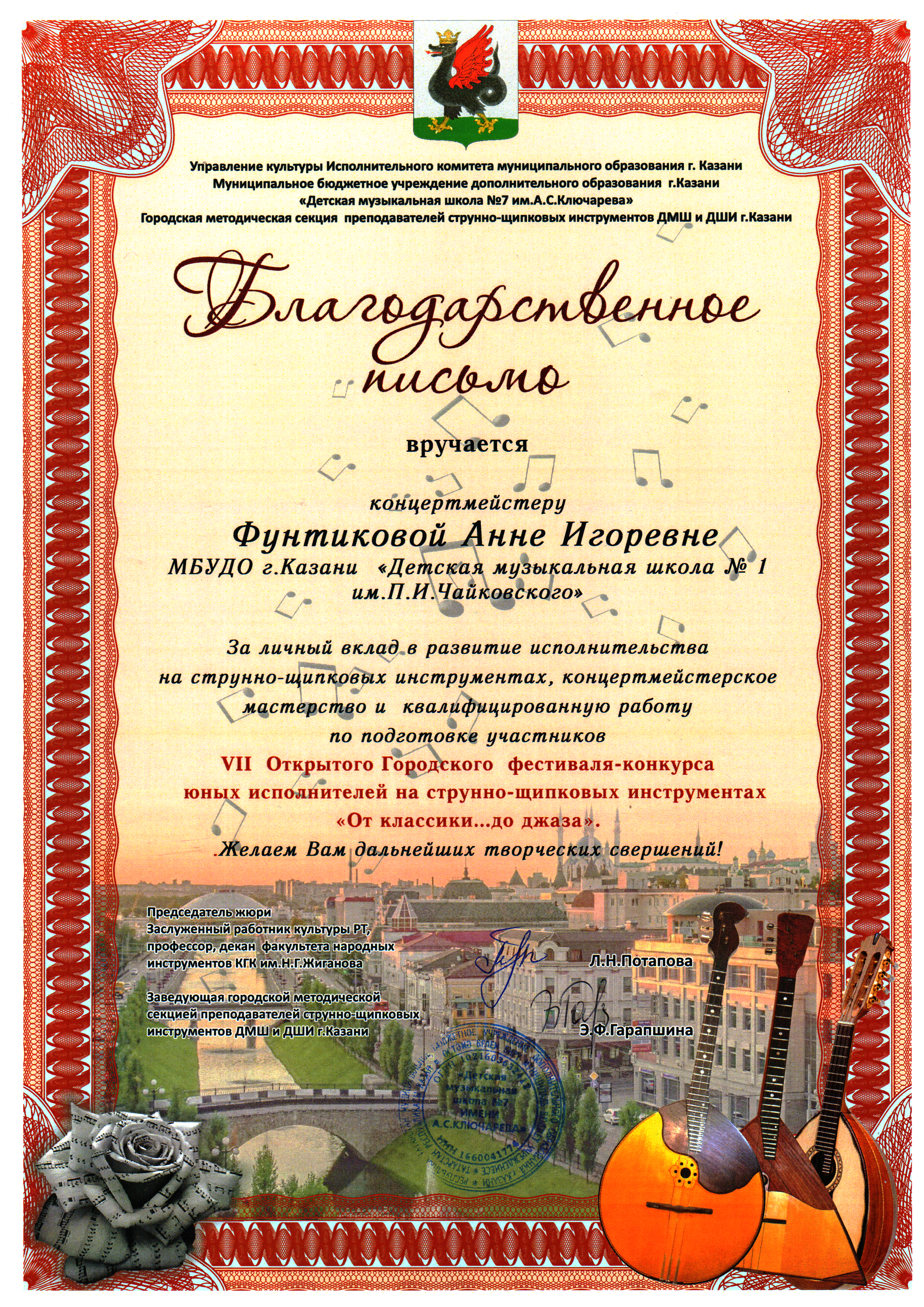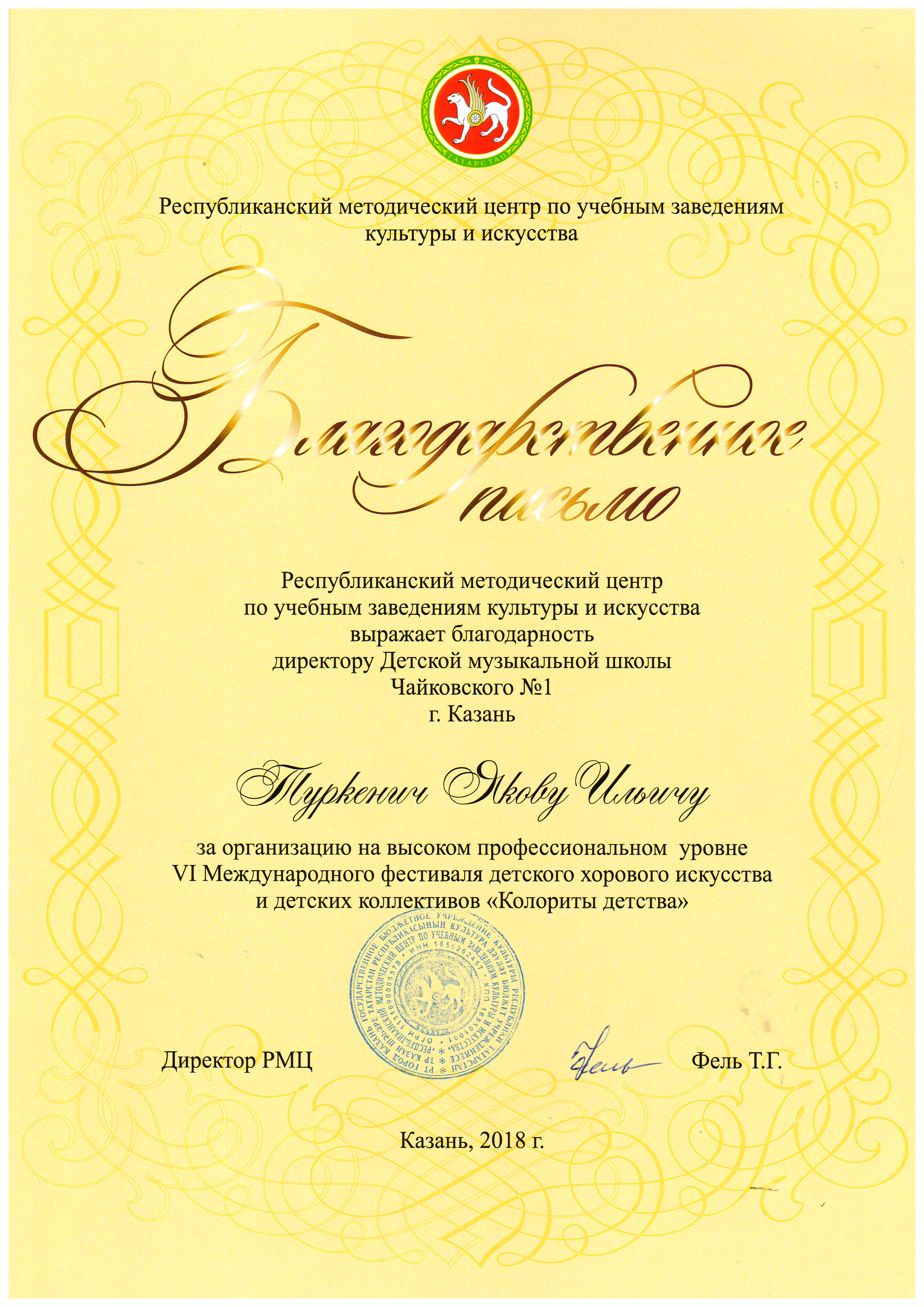 ДШИ "Гармония" г.о. Тольятти - Туркенич Я.И., Благодарственное письмо;