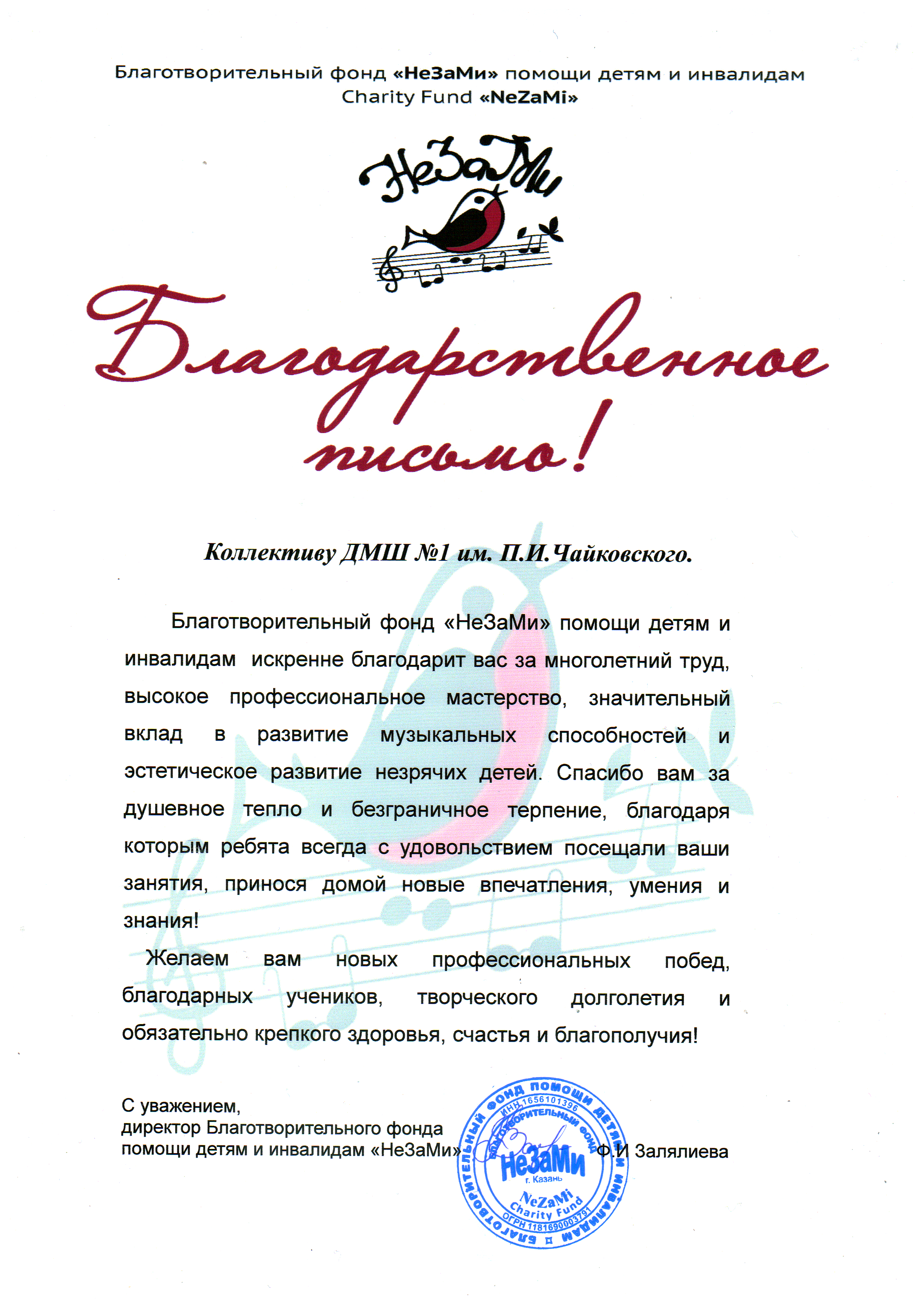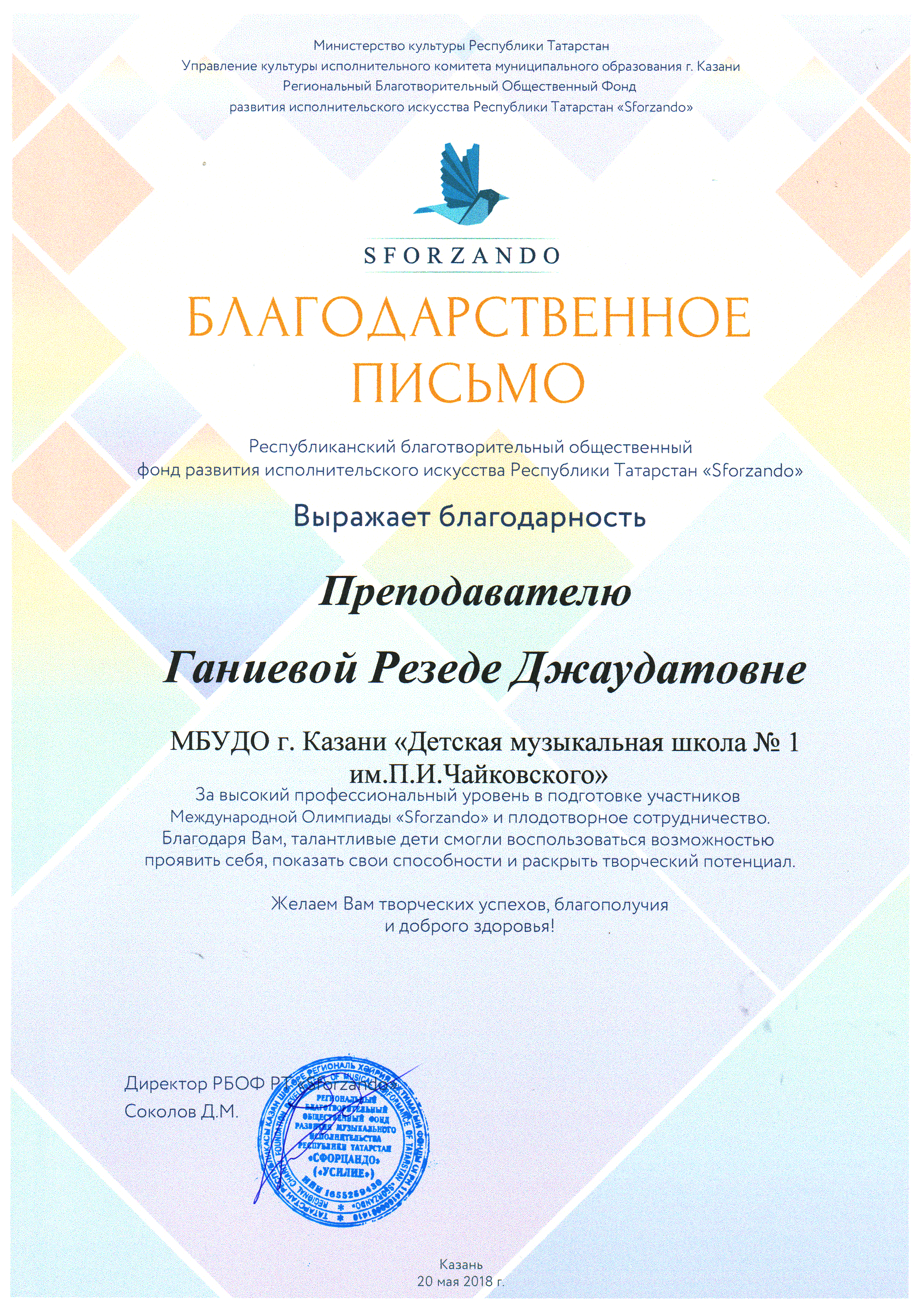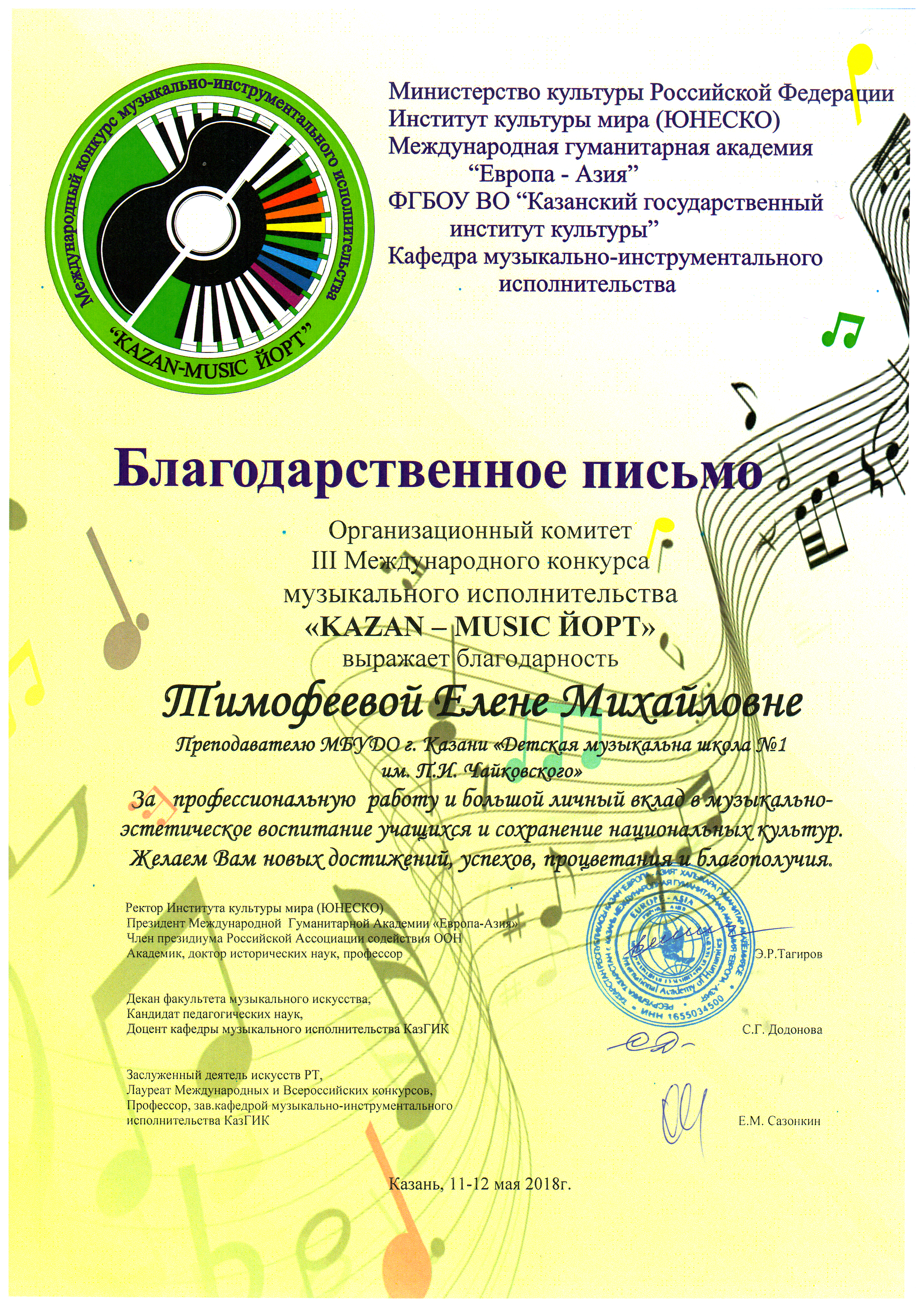 ДШИ "Гармония" г.о. Тольятти - Туркенич Я.И., Благодарственное письмо;