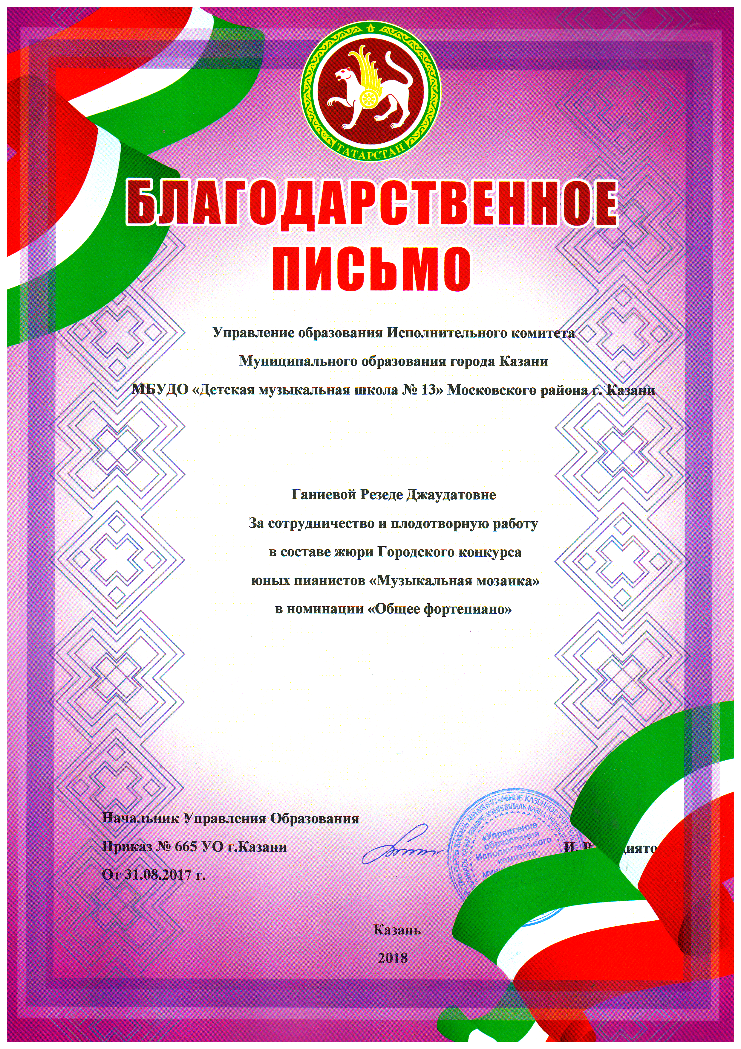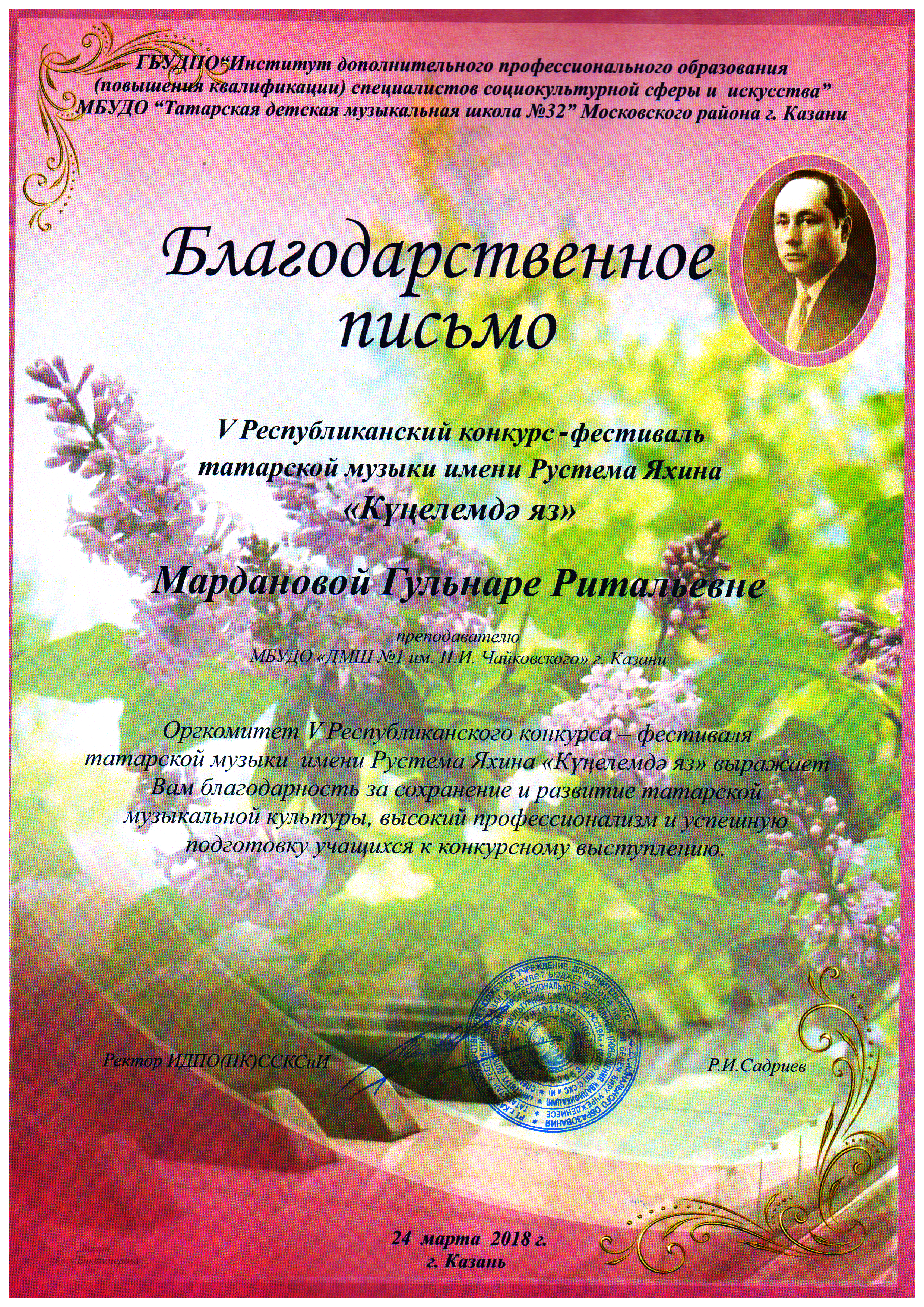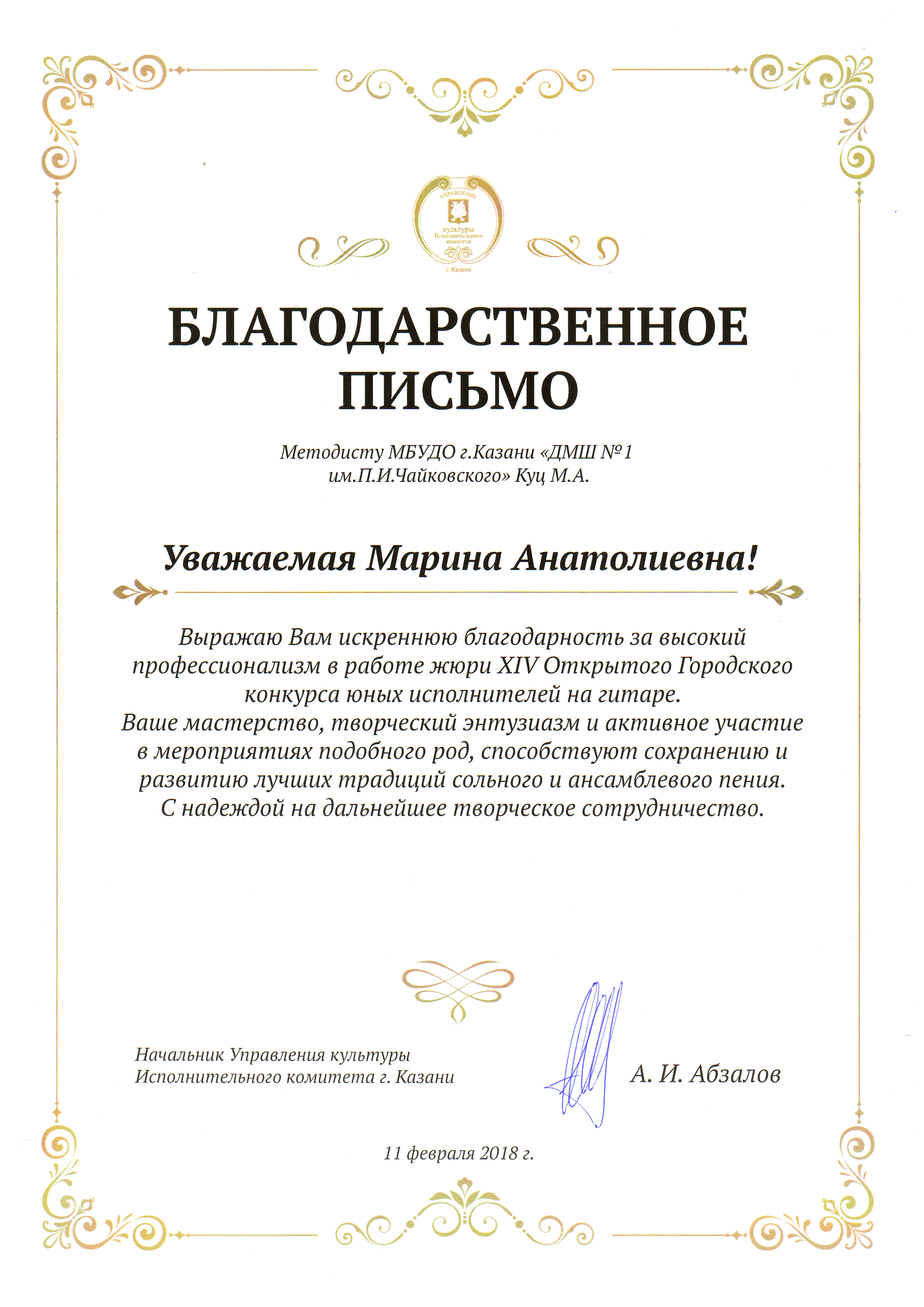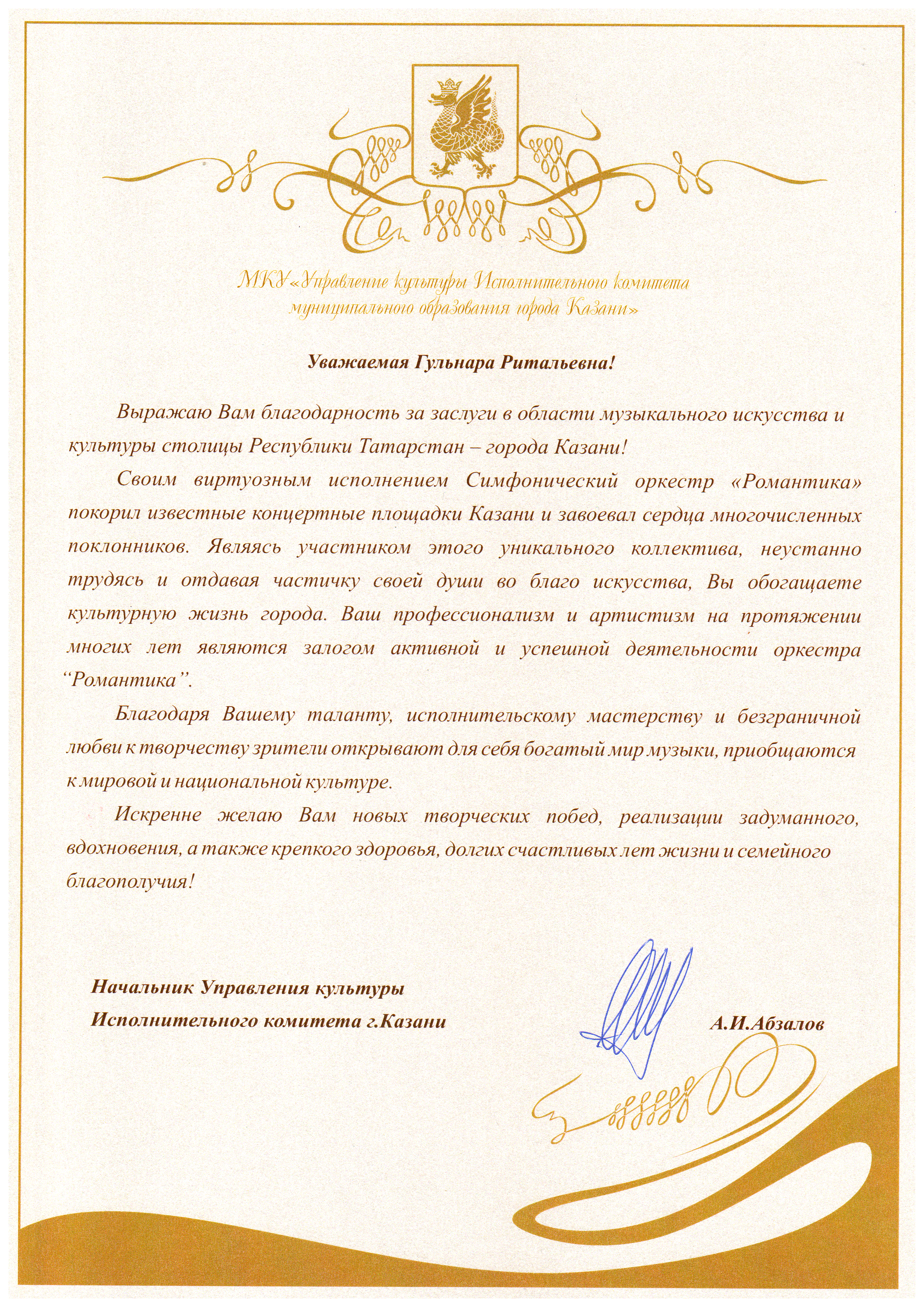 Управление культуры ИКМО г.Казани - Марданова Г.Р., Благодарственное письмо;