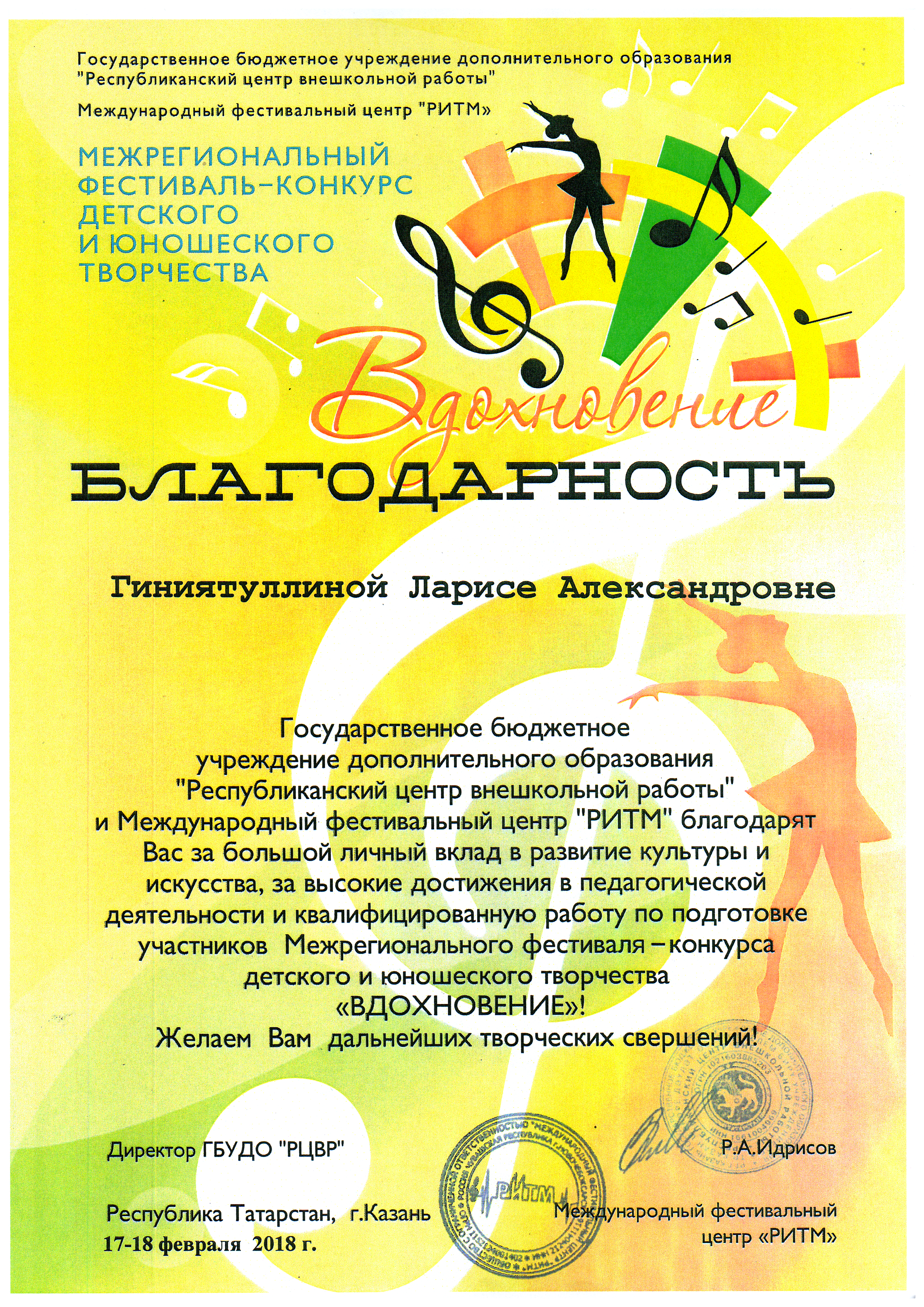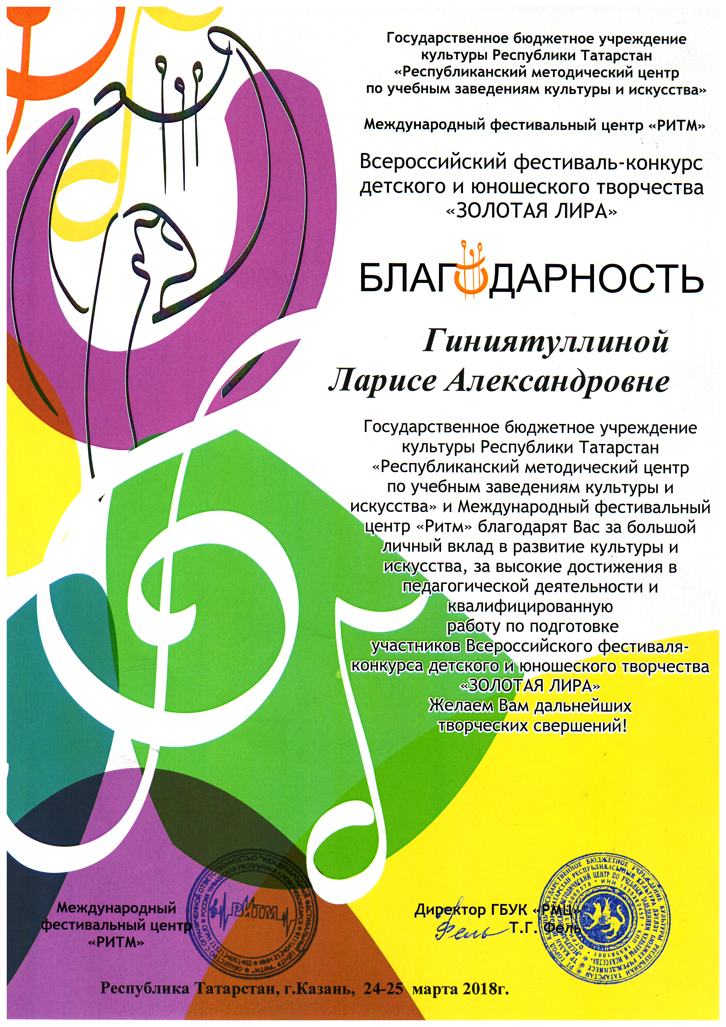 Всероссийский конкурс искусств "Новогодняя планета" - Гиниятуллина Л.А., Благодарственное письмо;