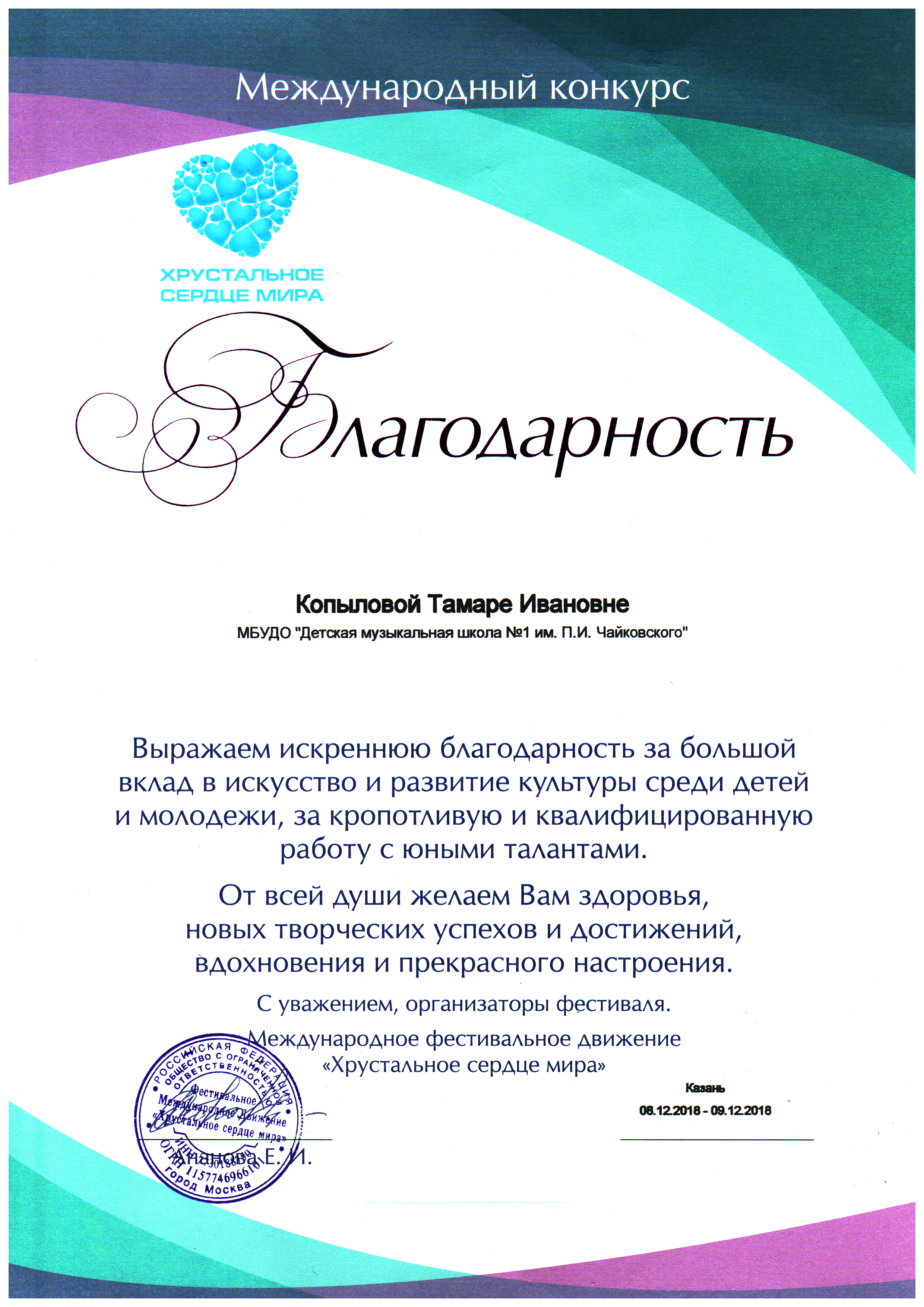 Международный конкурс "Хрустальное сердце мира" - Копылова Т.И., Благодарность;