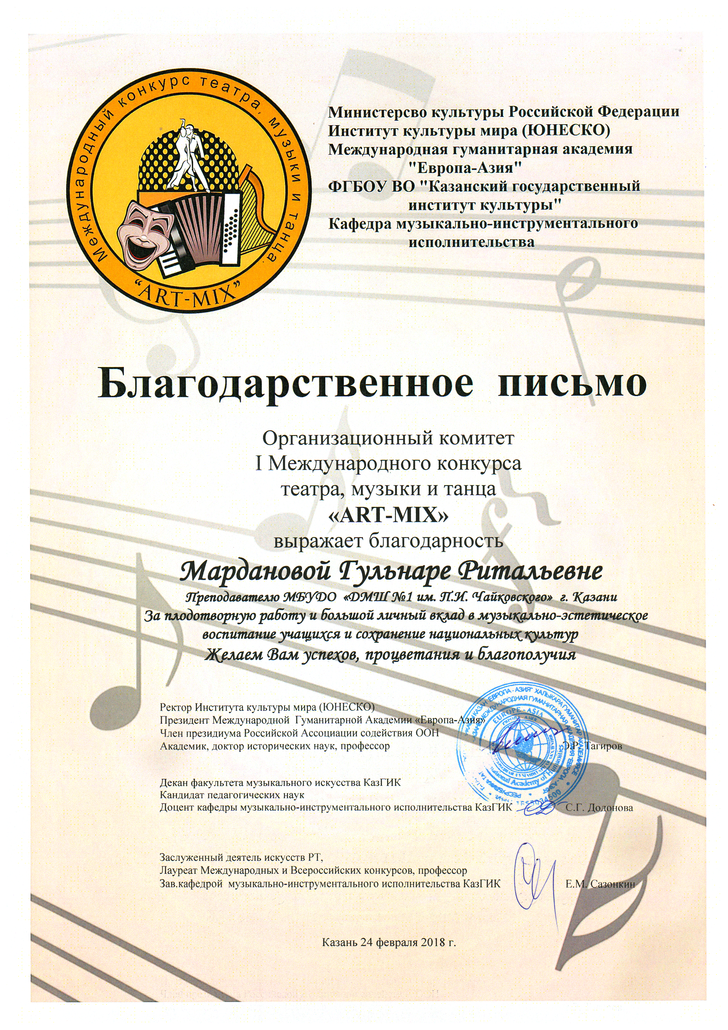 I Международный конкурс театра, музыки и танца "ART-MIX" - Марданова Г.Р., Благодарность;