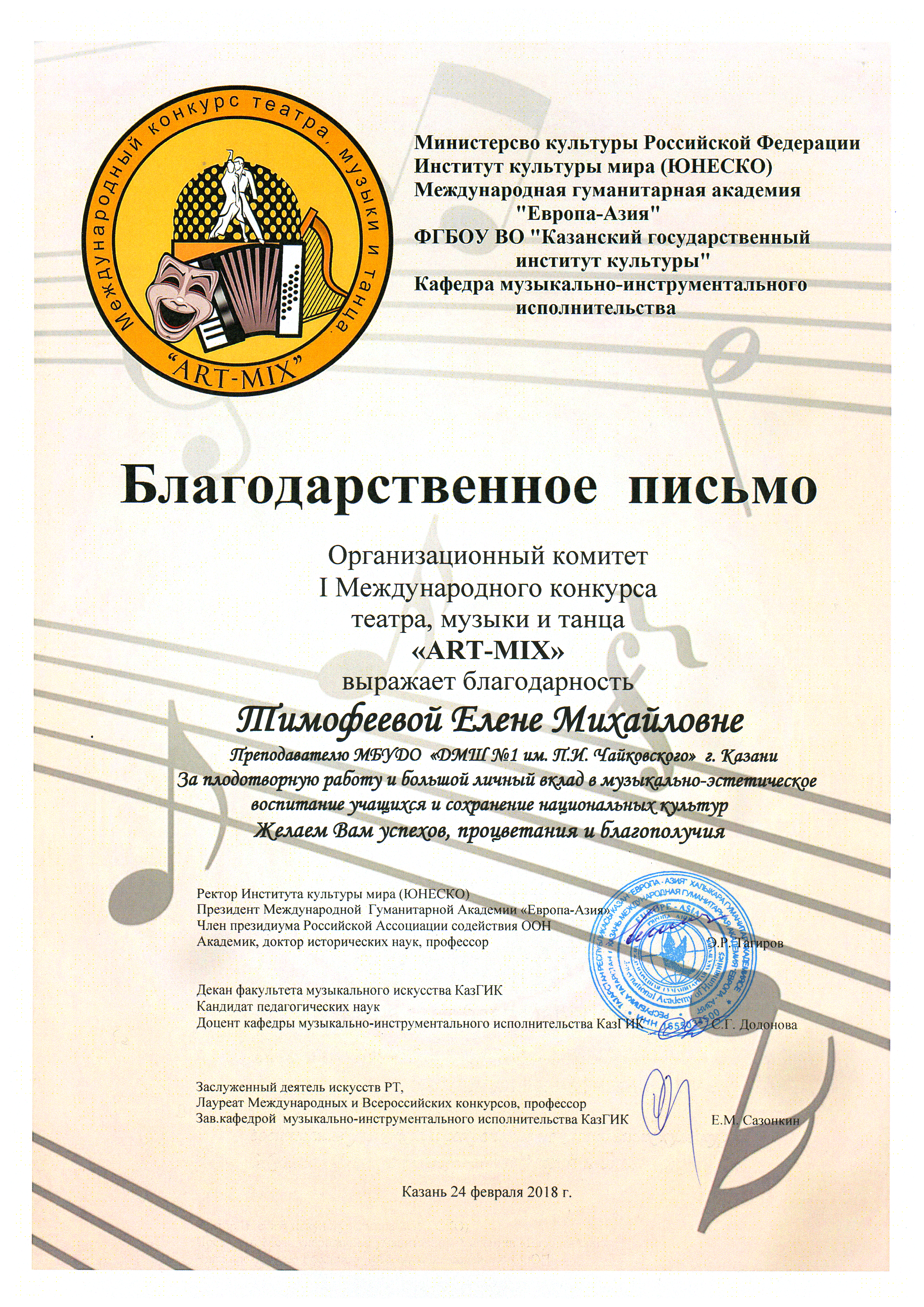 I Международный конкурс театра, музыки и танца "ART-MIX" - Тимофеева Е.М., Благодарственное письмо;
