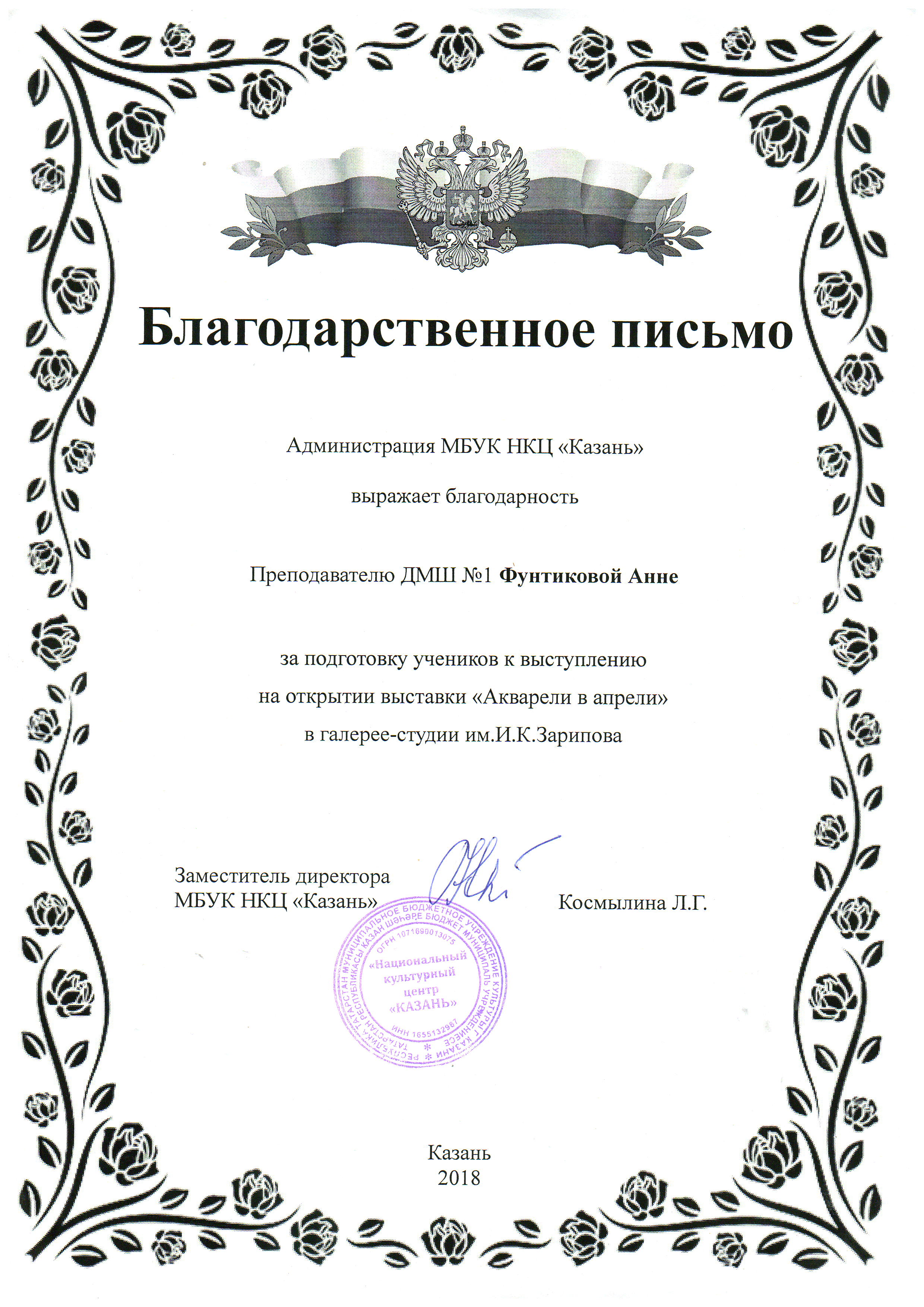 Галерея-студия им.И.К.Зарипова, выставка "Акварели в апреле" - Фунтикова А.А., Благодарственное письмо;