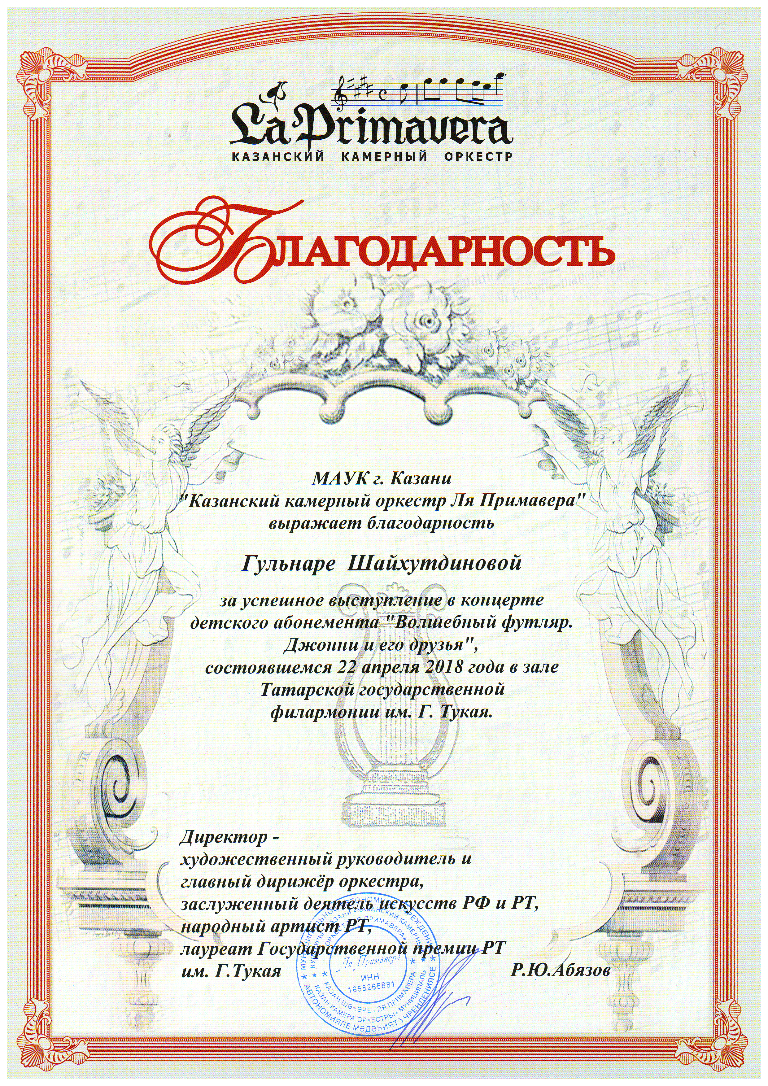 Концерт камерного оркестра La Primavera "Звёзды из завтра" - Кулеева Л.А., Благодарность за успрешную подготовку ученицы;