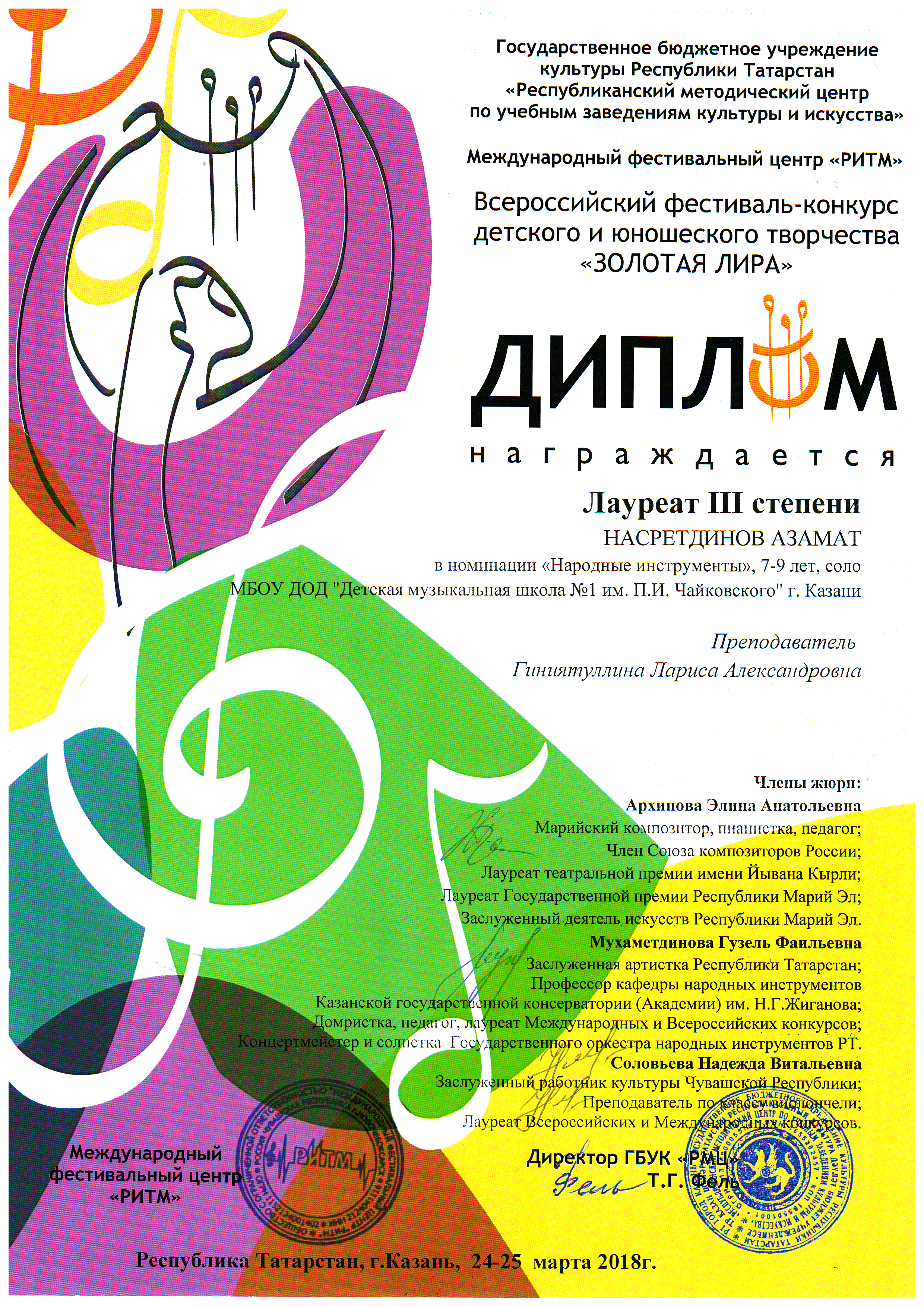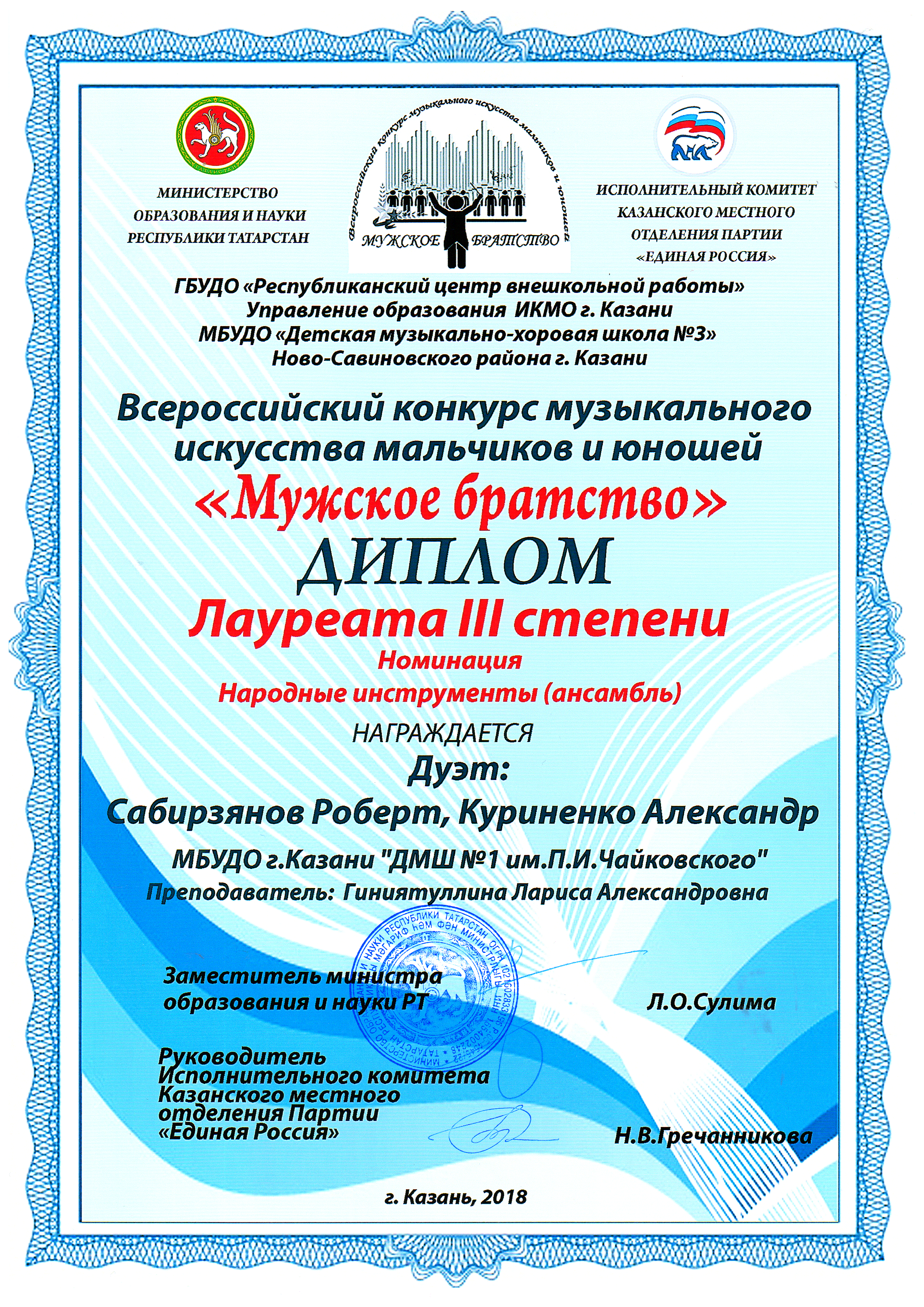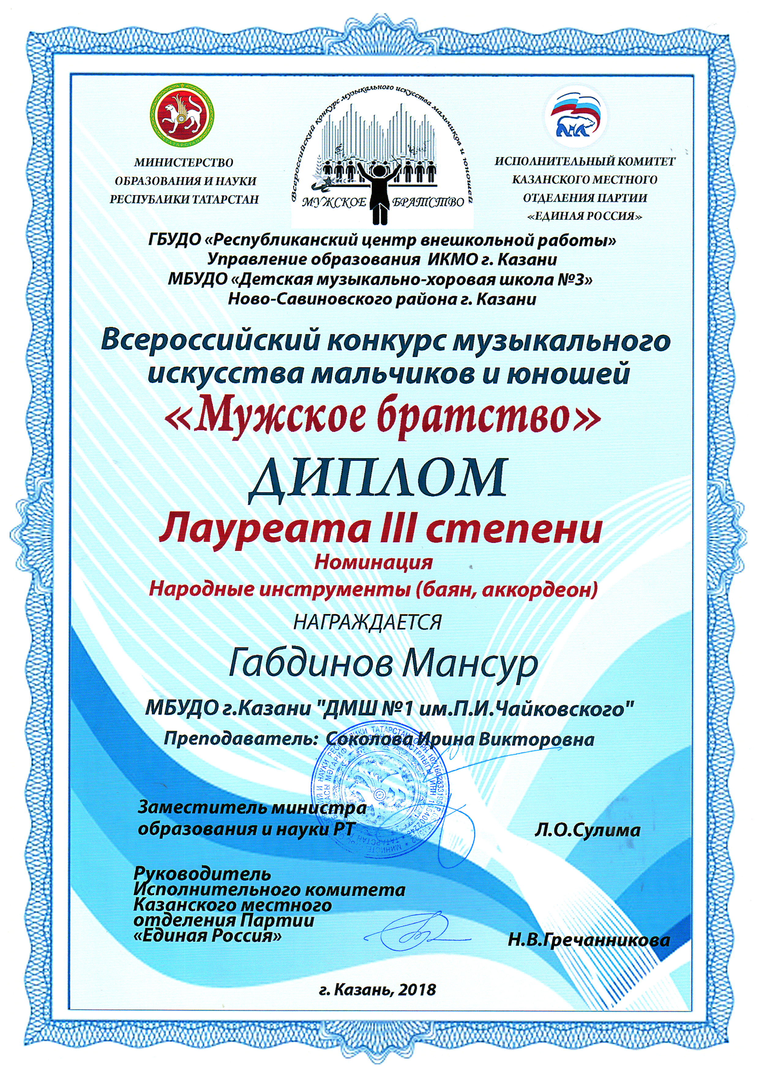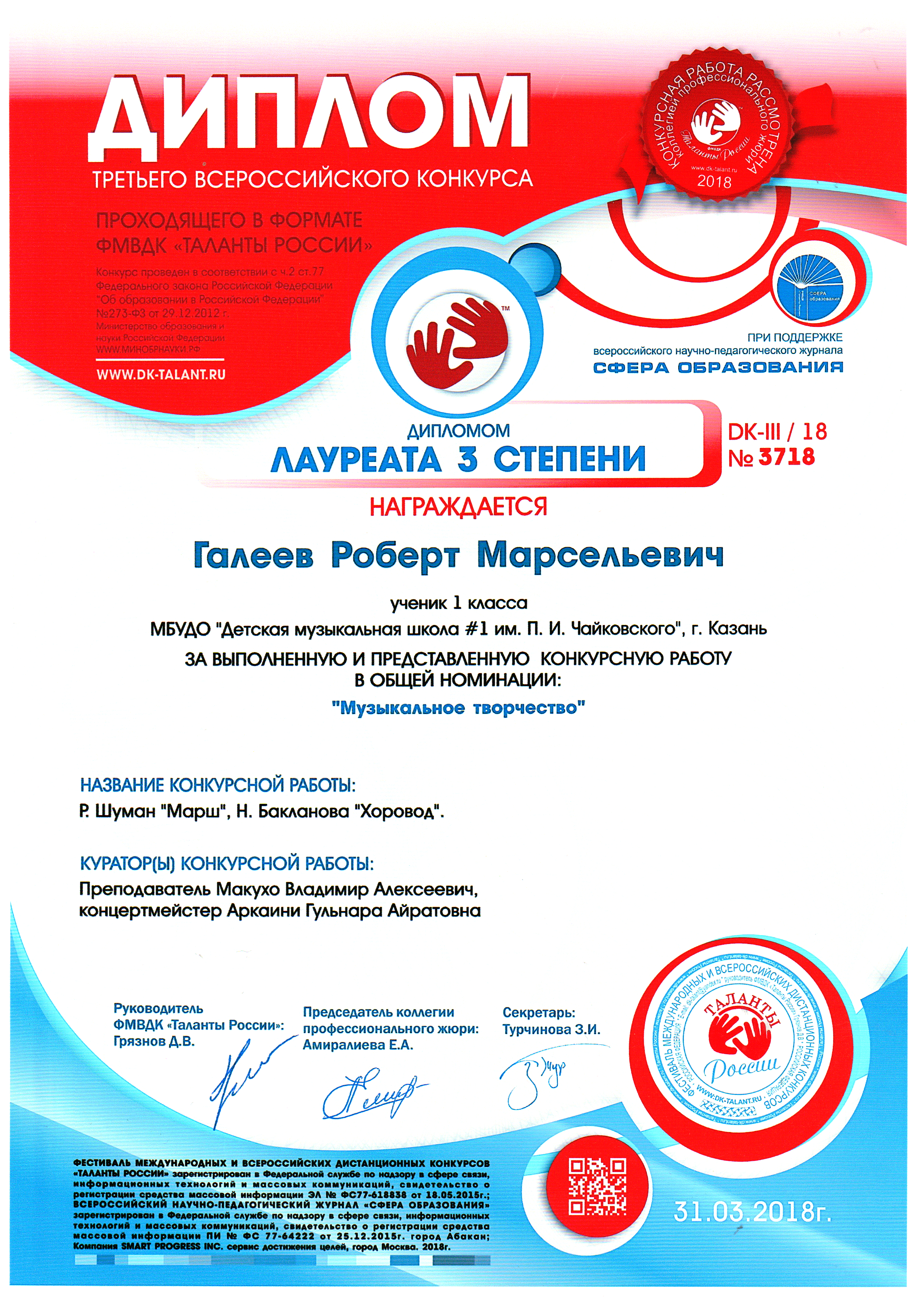 Третий Всероссийский конкурс "Таланты России" - Галеев Роберт, Лауреат III степени;