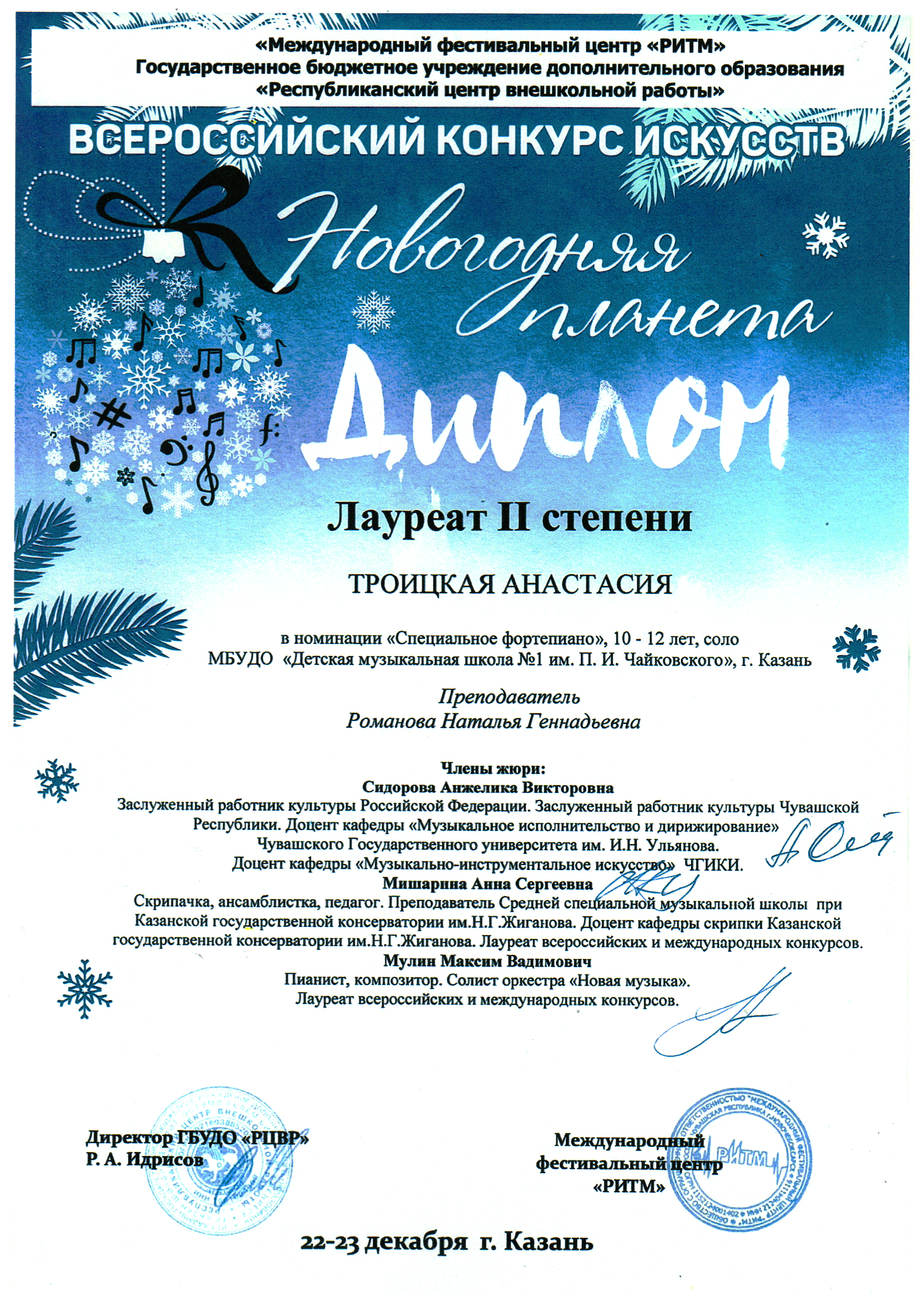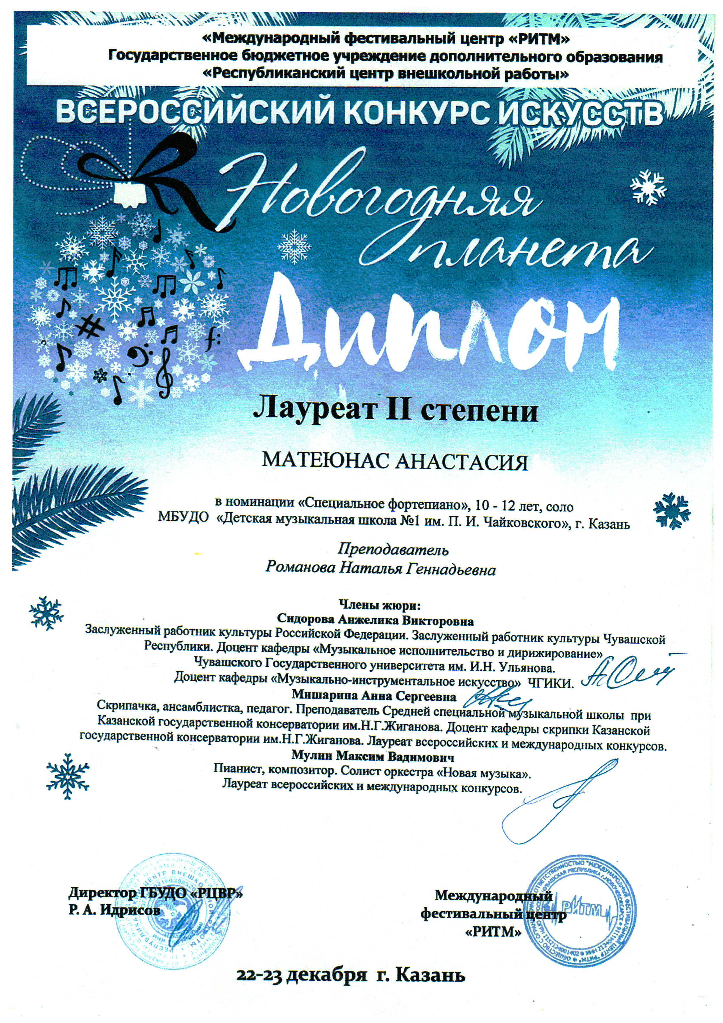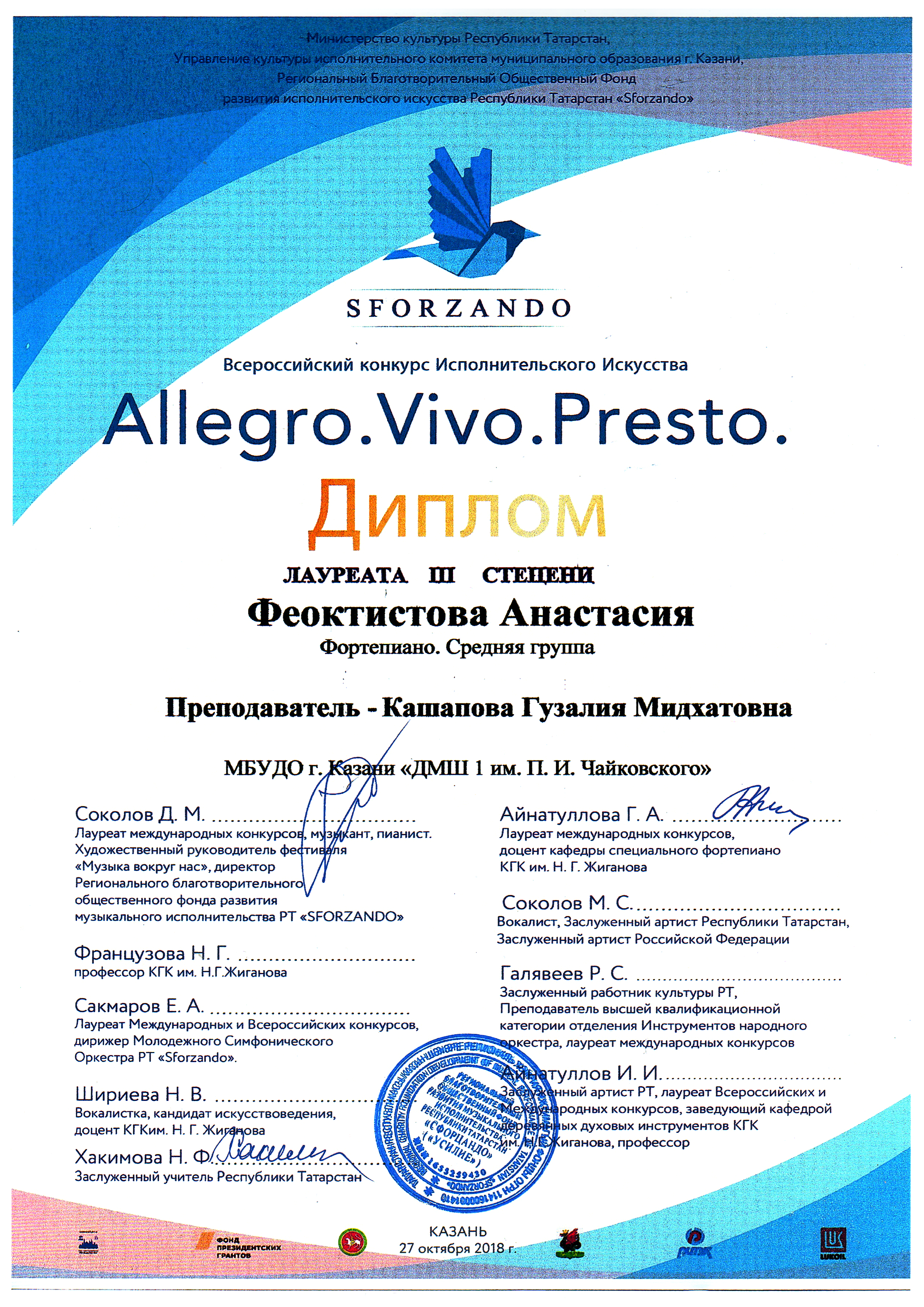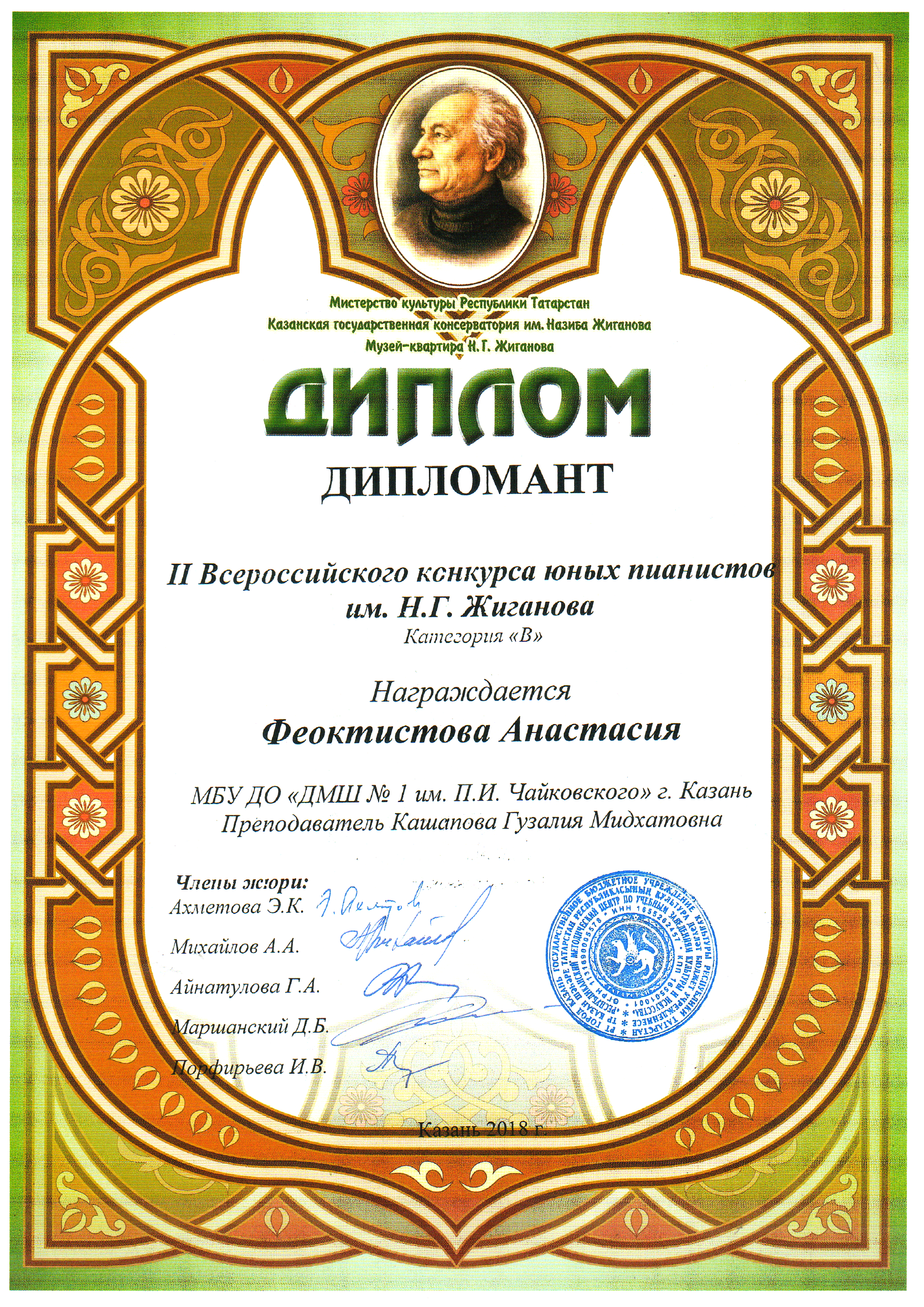 II Всероссийский конкурс юных пианистов им.Н.Г.Жиганова - Феоктистова Анастасия, Дипломант;