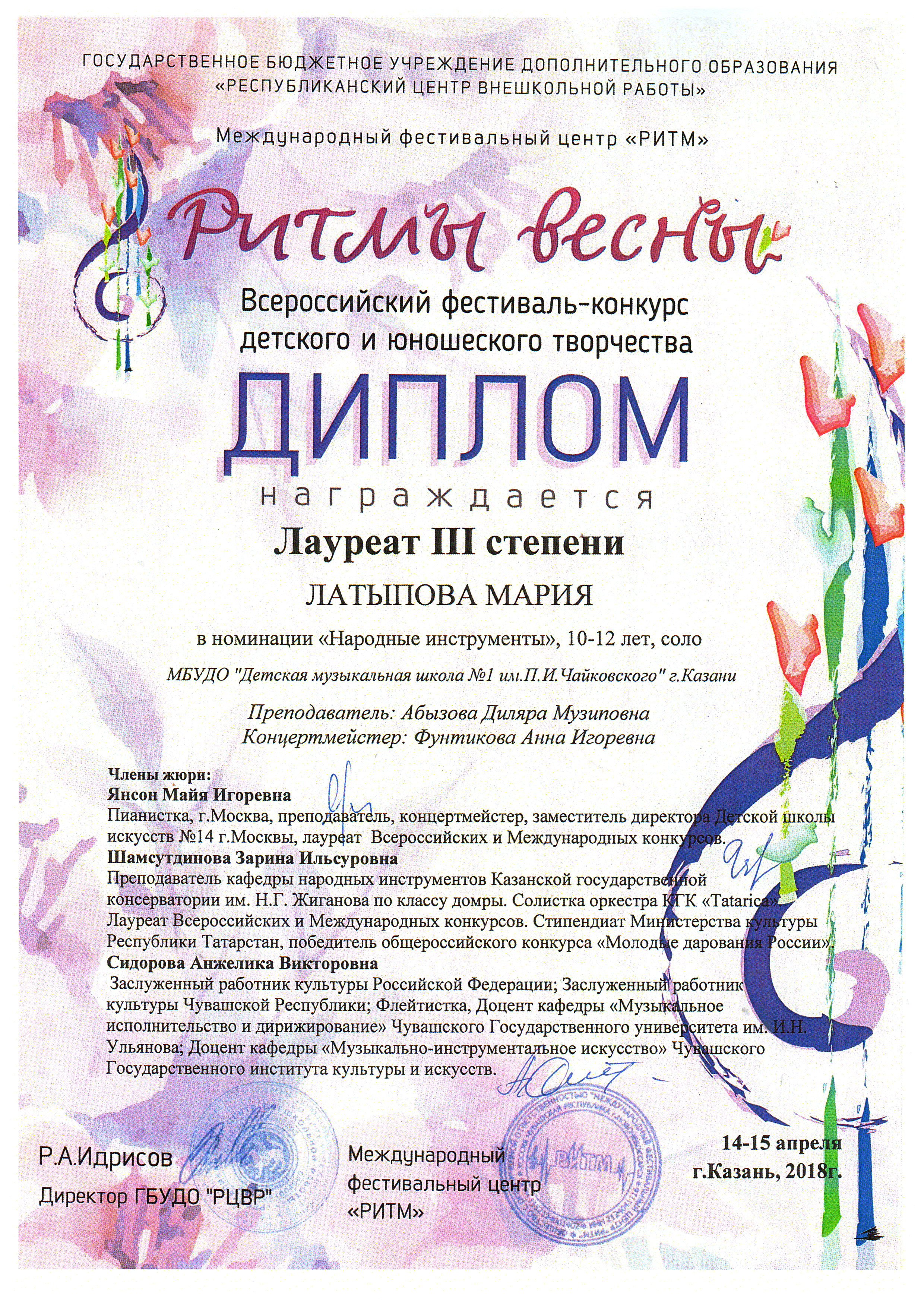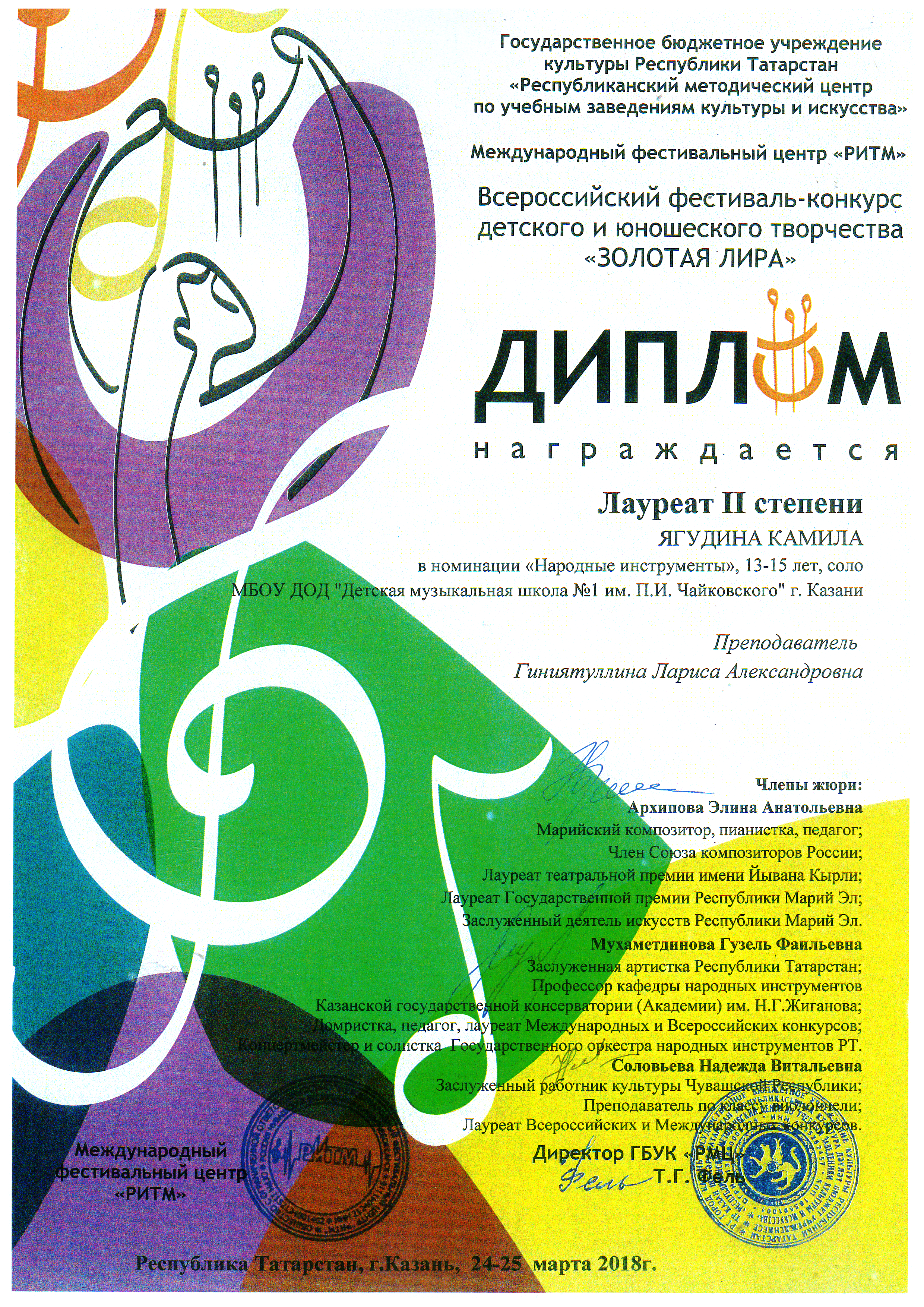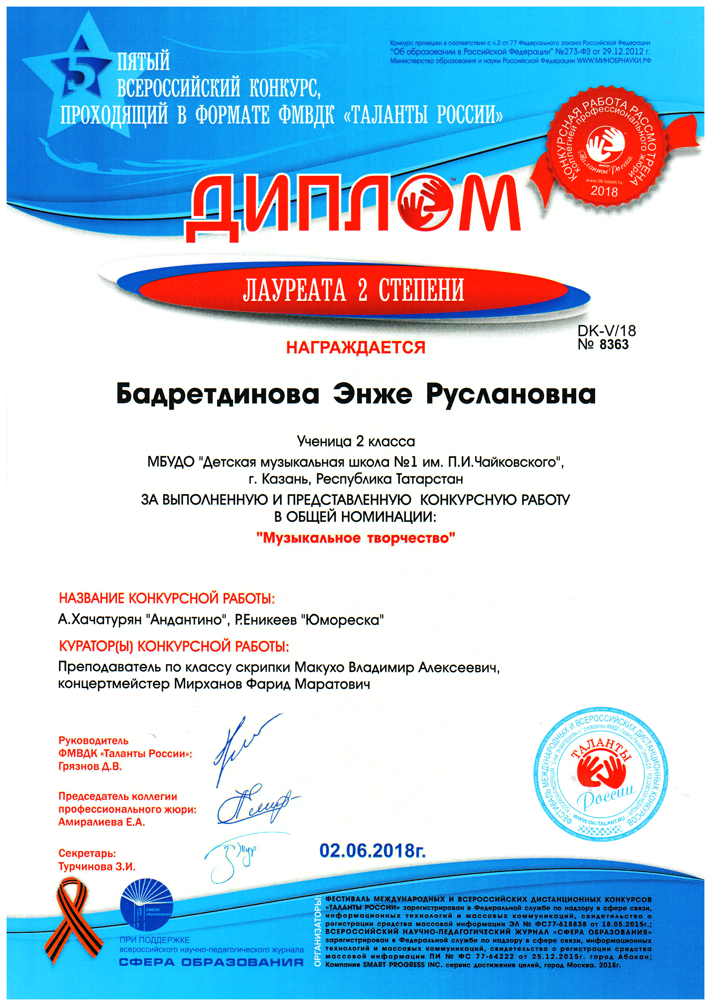 Пятый Всероссийский конкурс "Таланты России" - Бадретдинова Энже, Лауреат II степени;