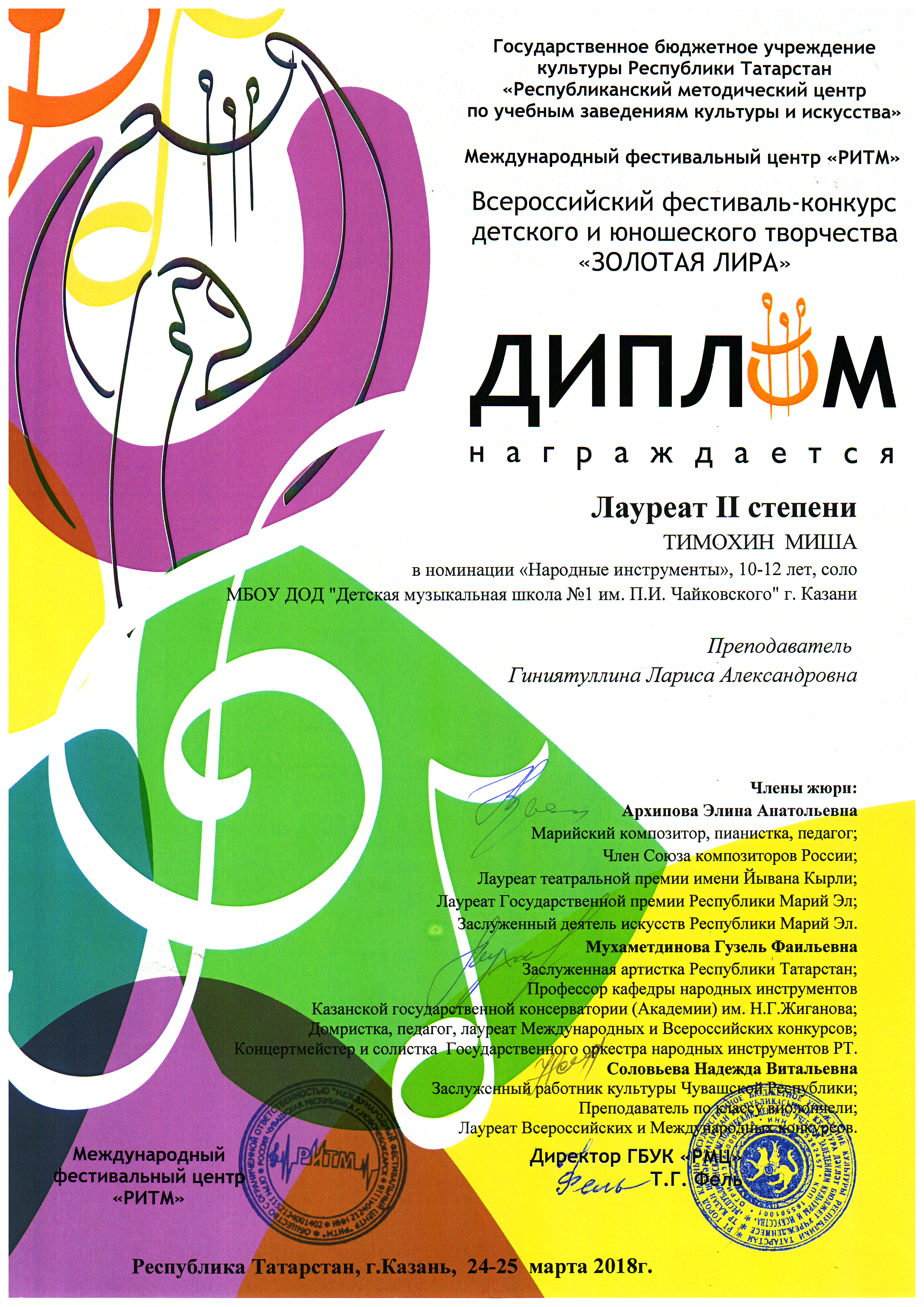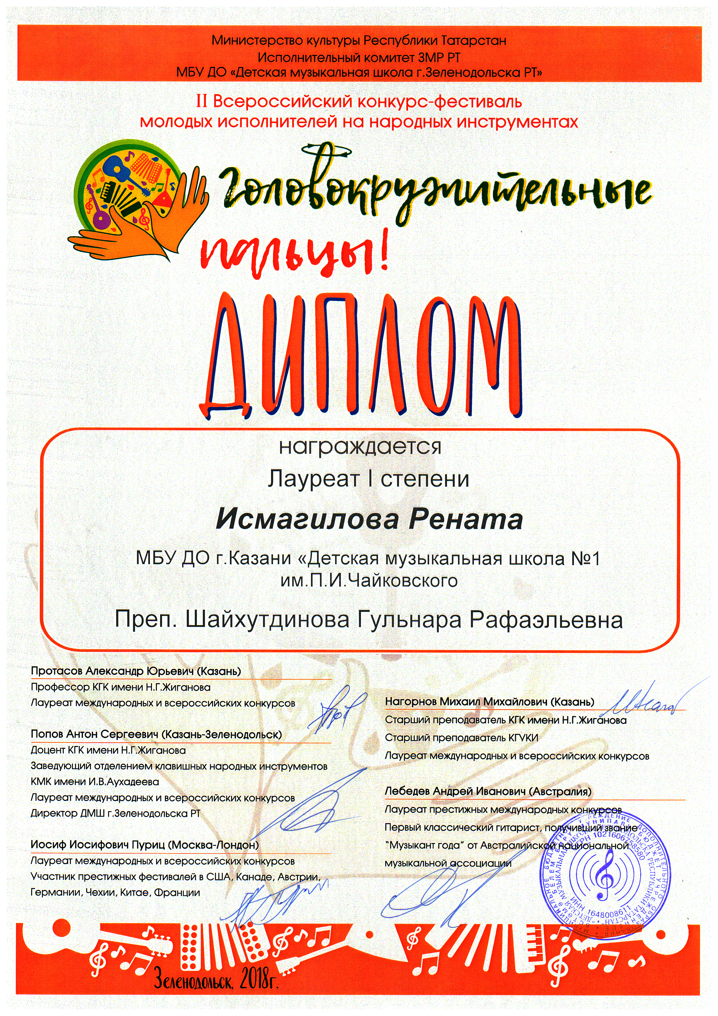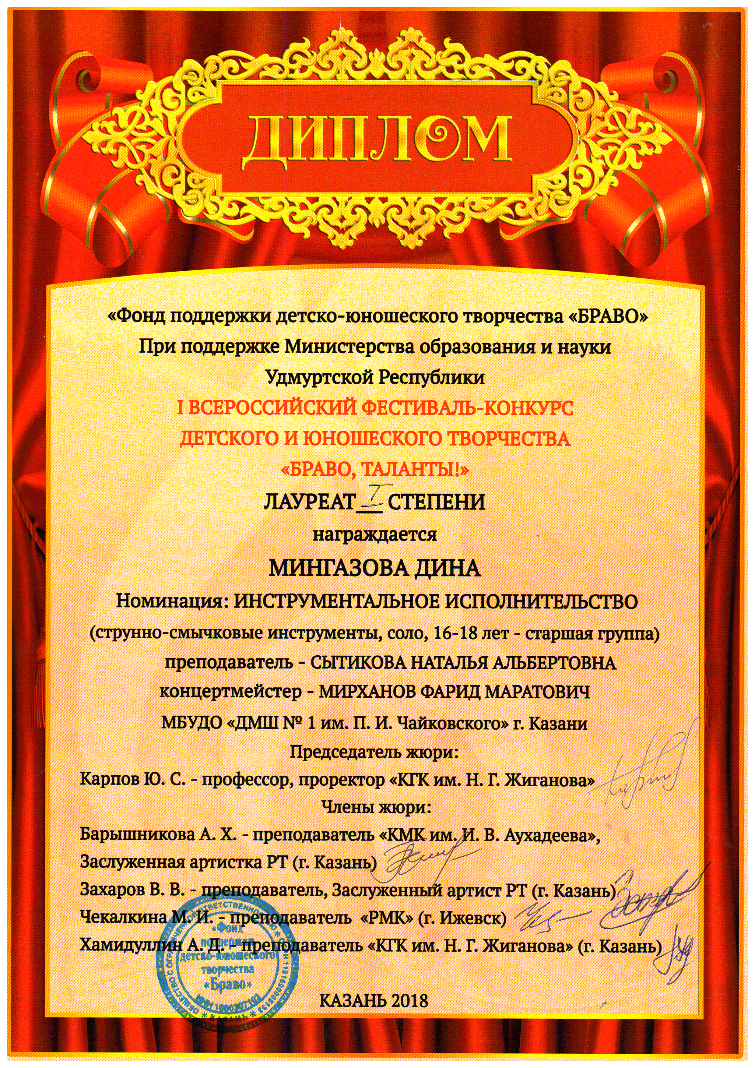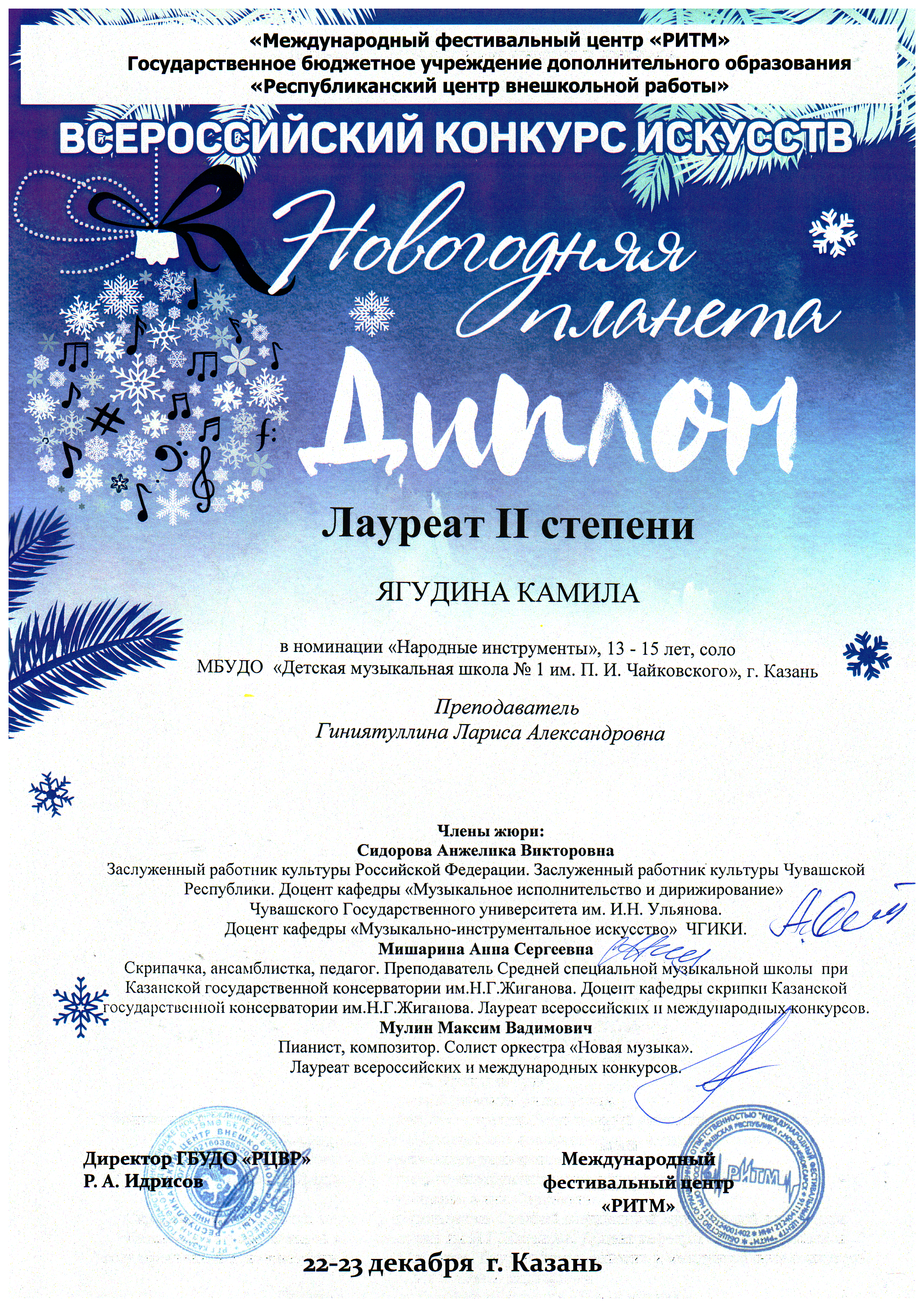 Пятый Всероссийский конкурс "Таланты России" - Бадретдинова Энже, Лауреат II степени;