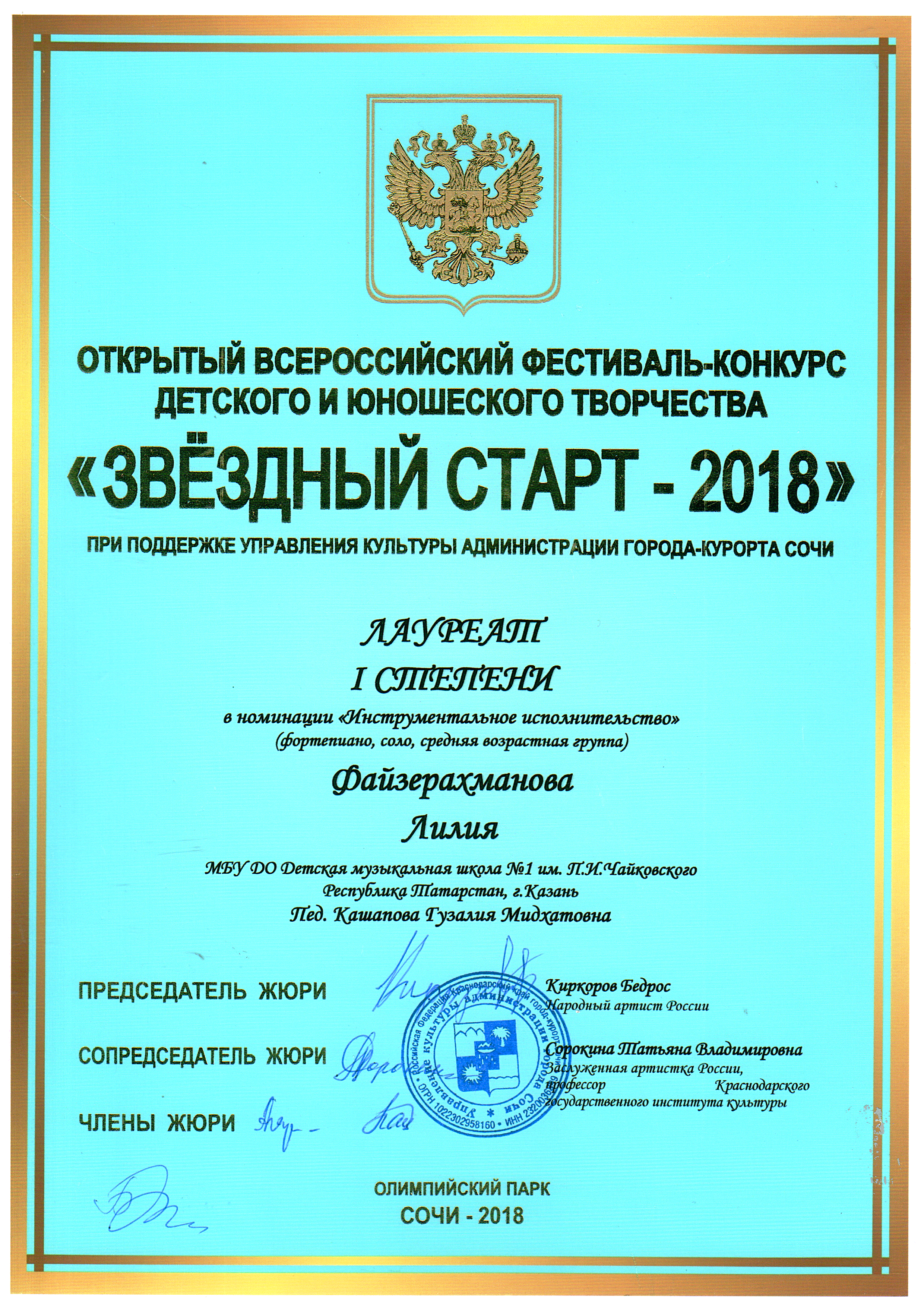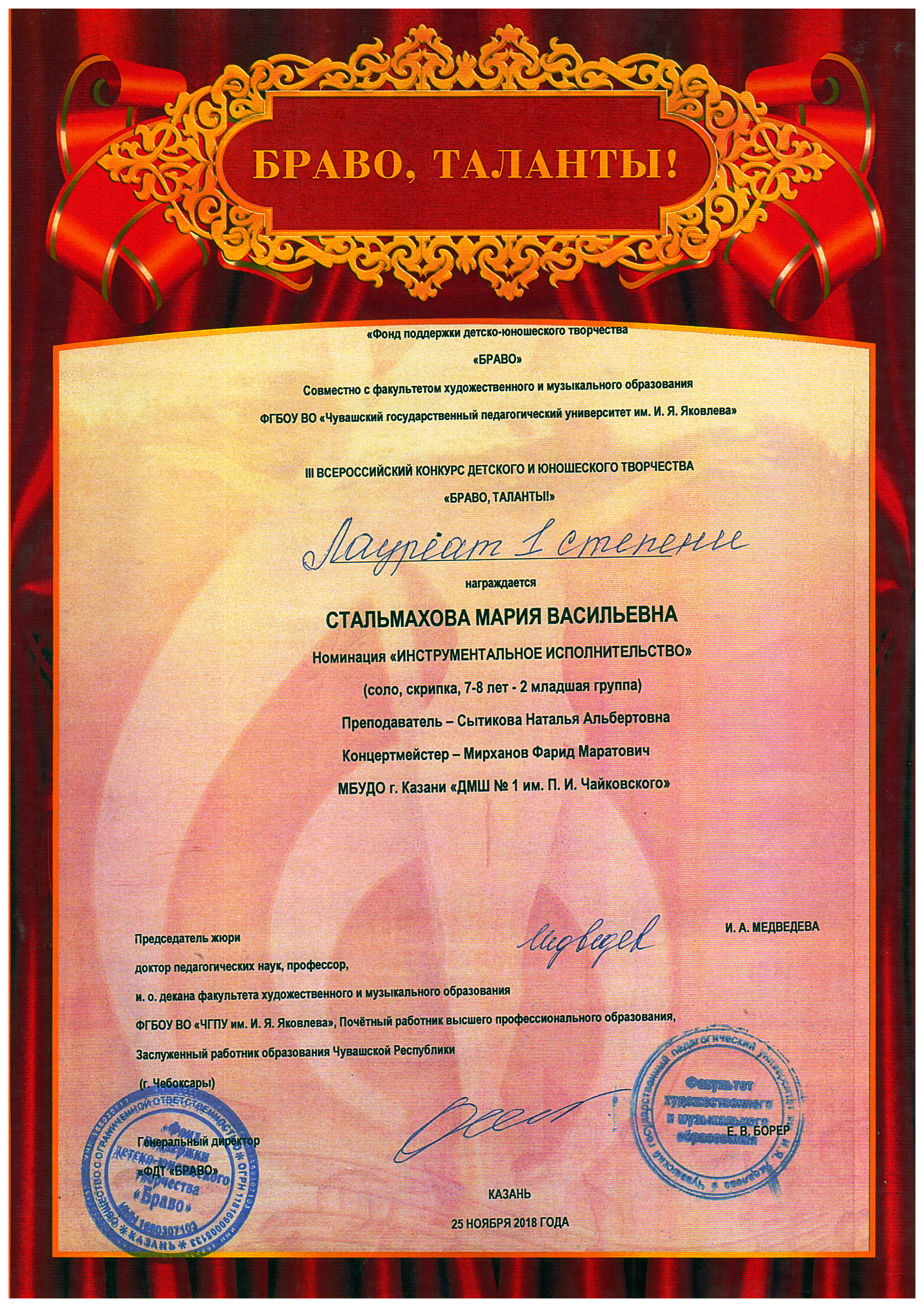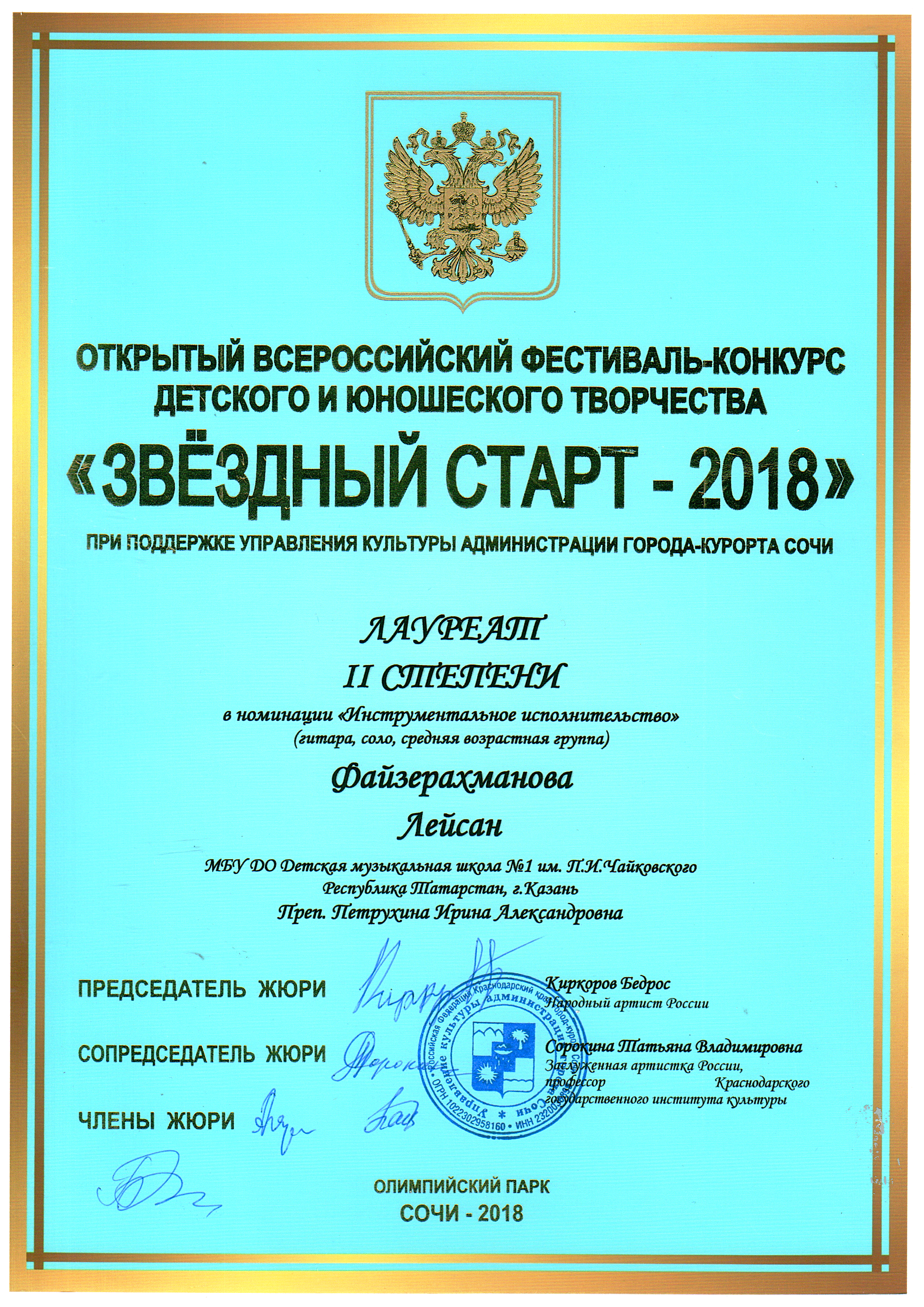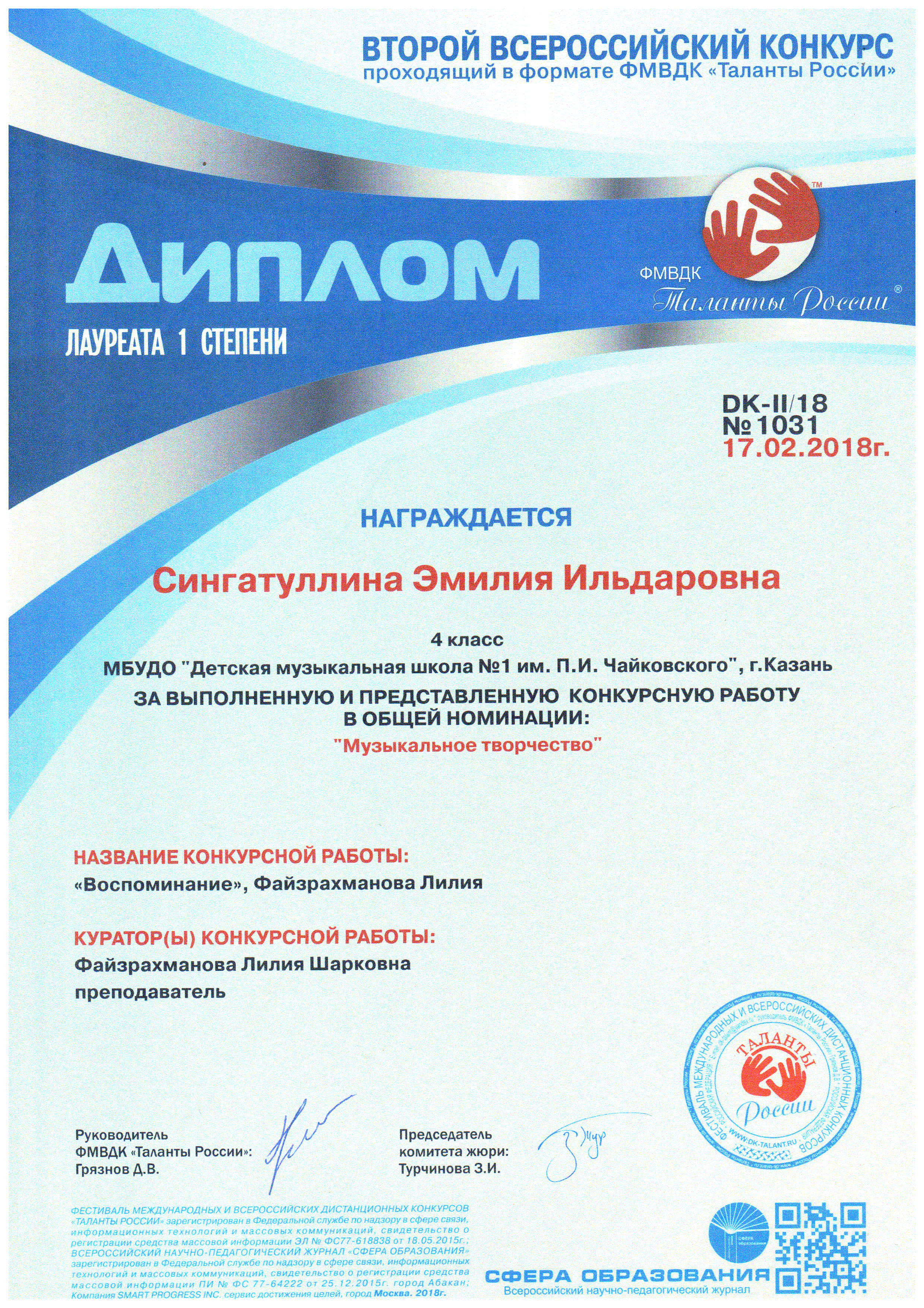 Второй Всероссийский конкурс "Таланты России" - Сингатуллина Эмилия, Лауреат I степени;