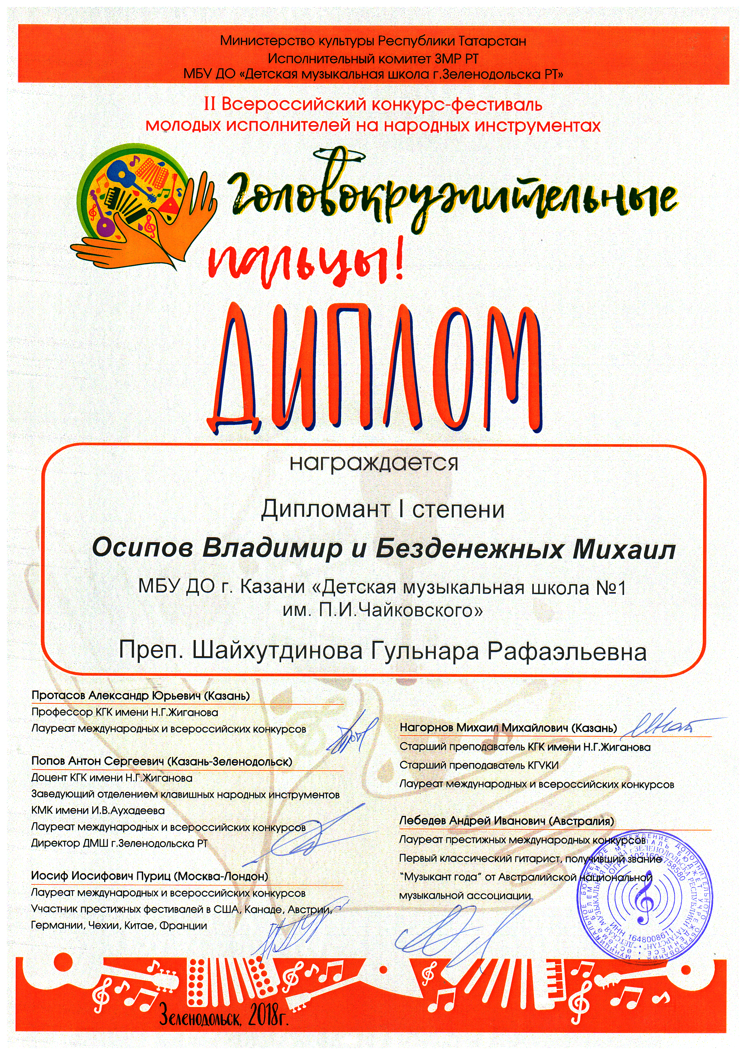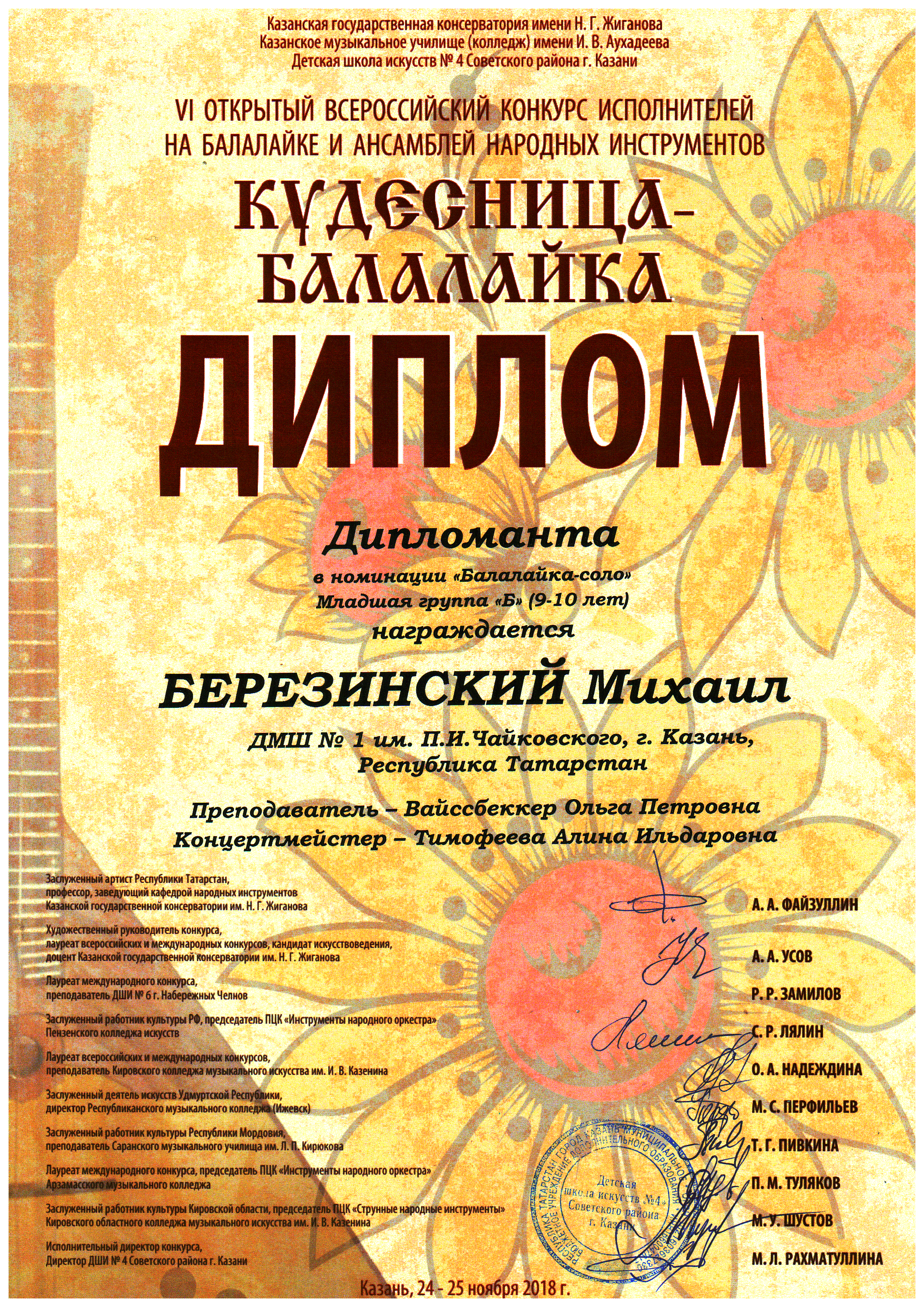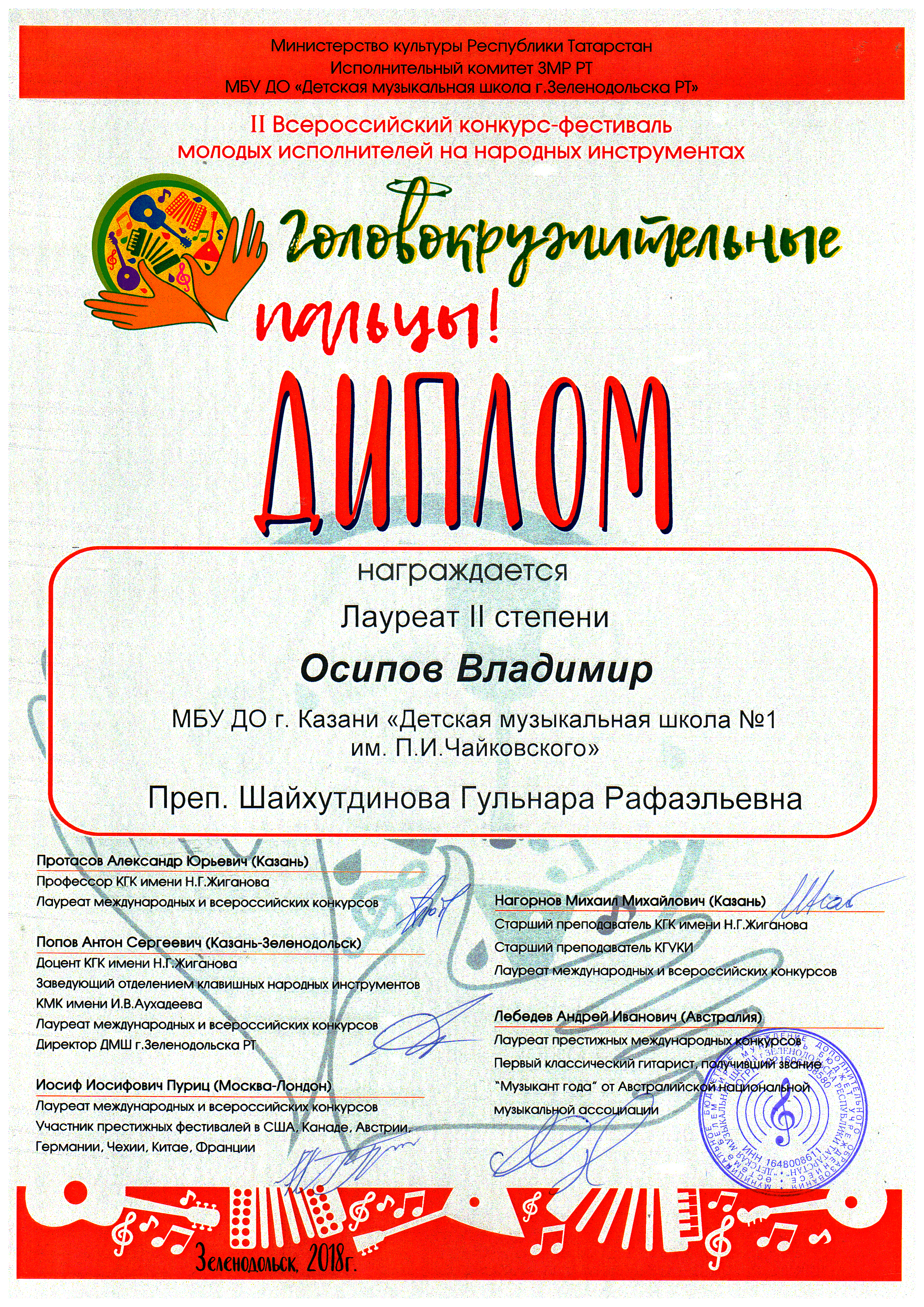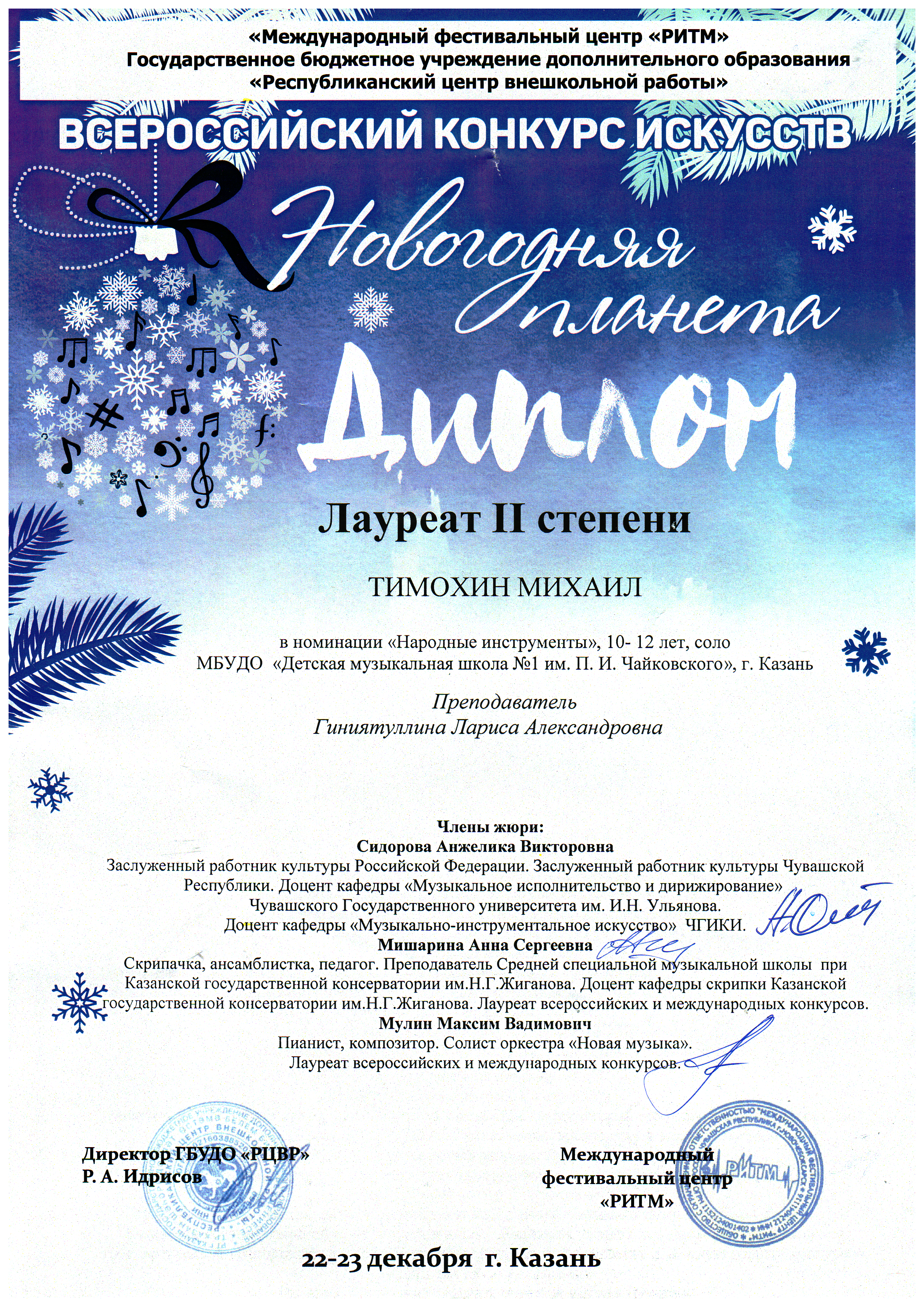 II Всероссийский конкурс-фестиваль молодых исполнителей на народных инструментах "Головокружительные пальцы" - Лауреат III степени, класс преподавателя Петрухиной И.А.;