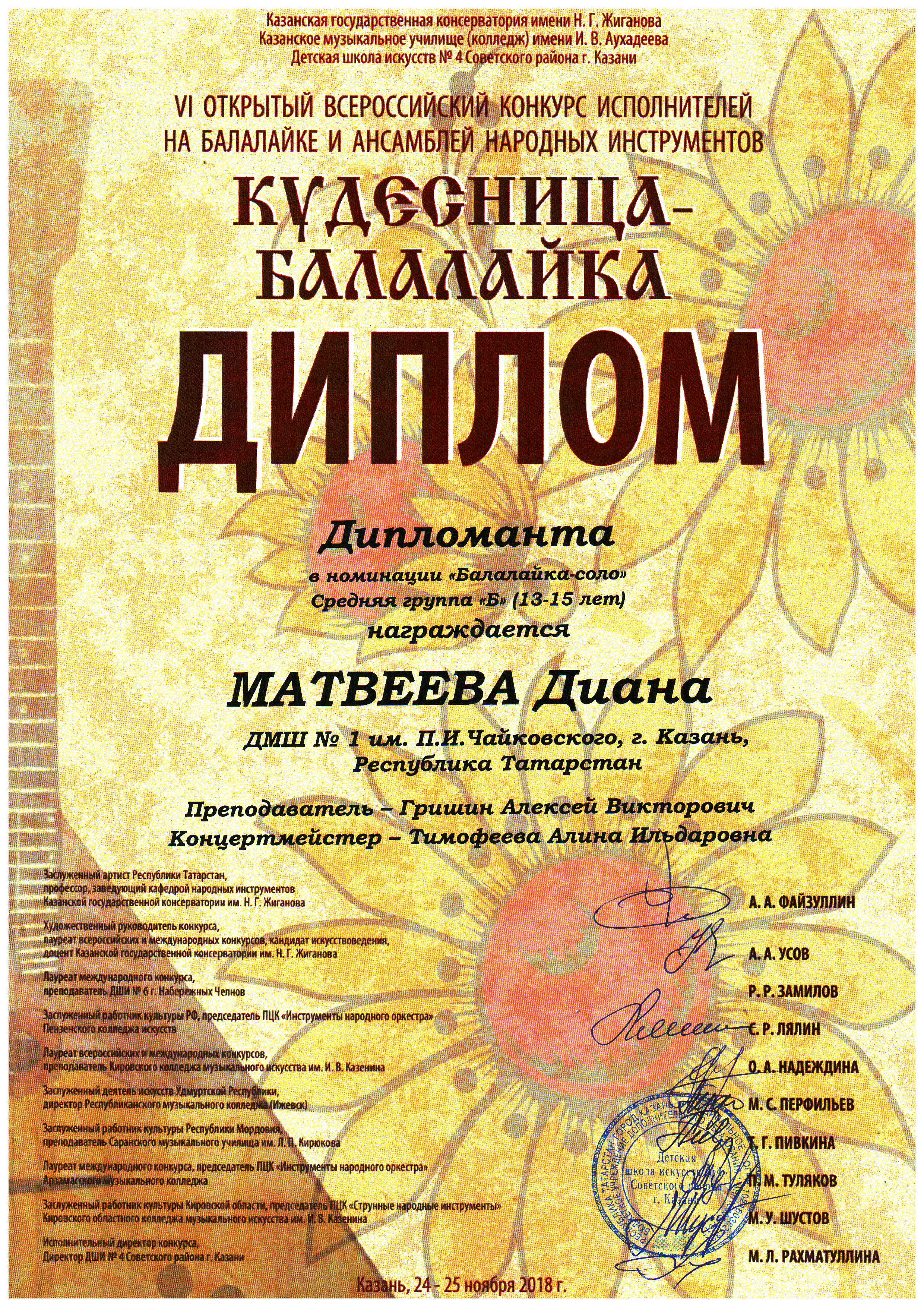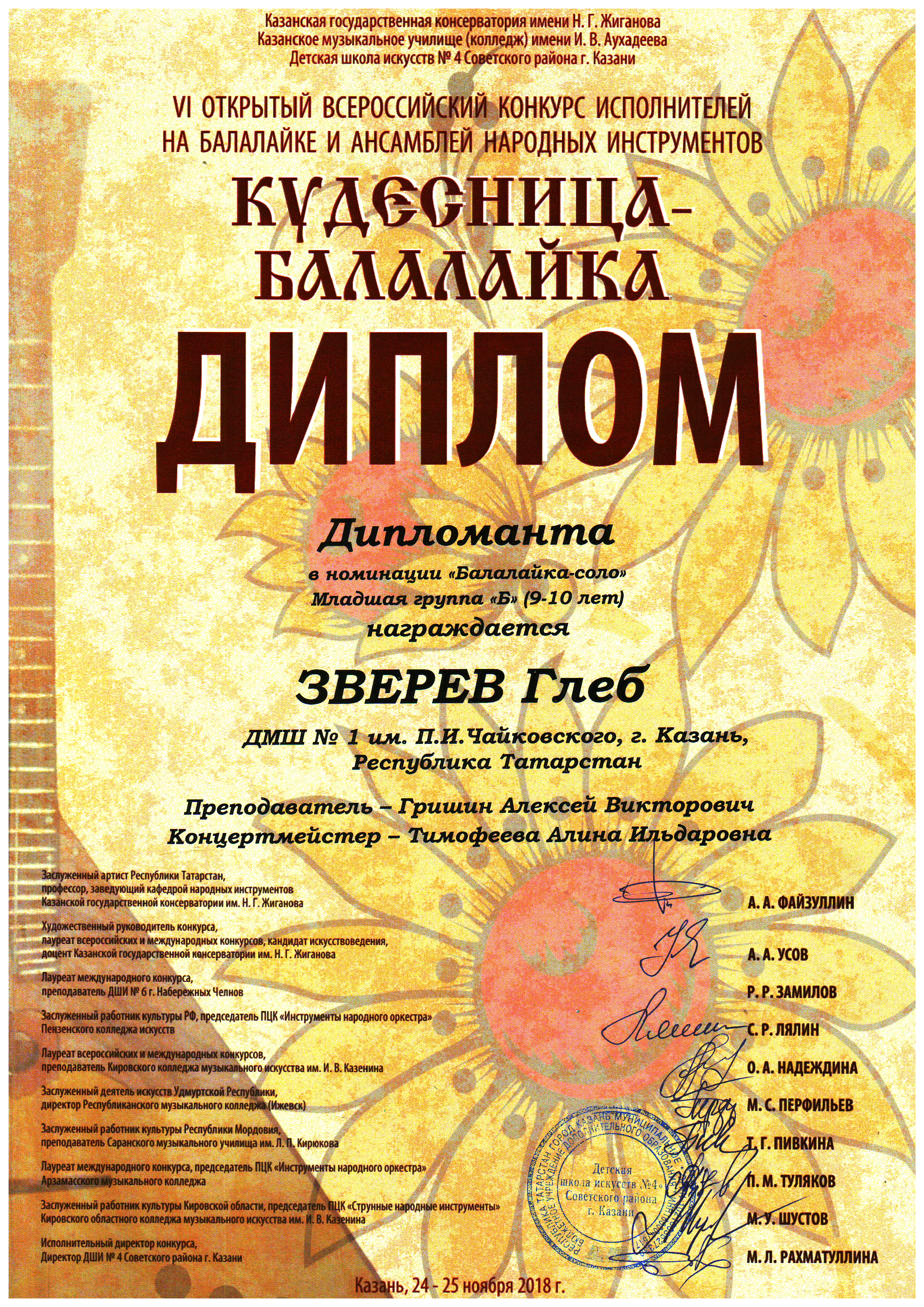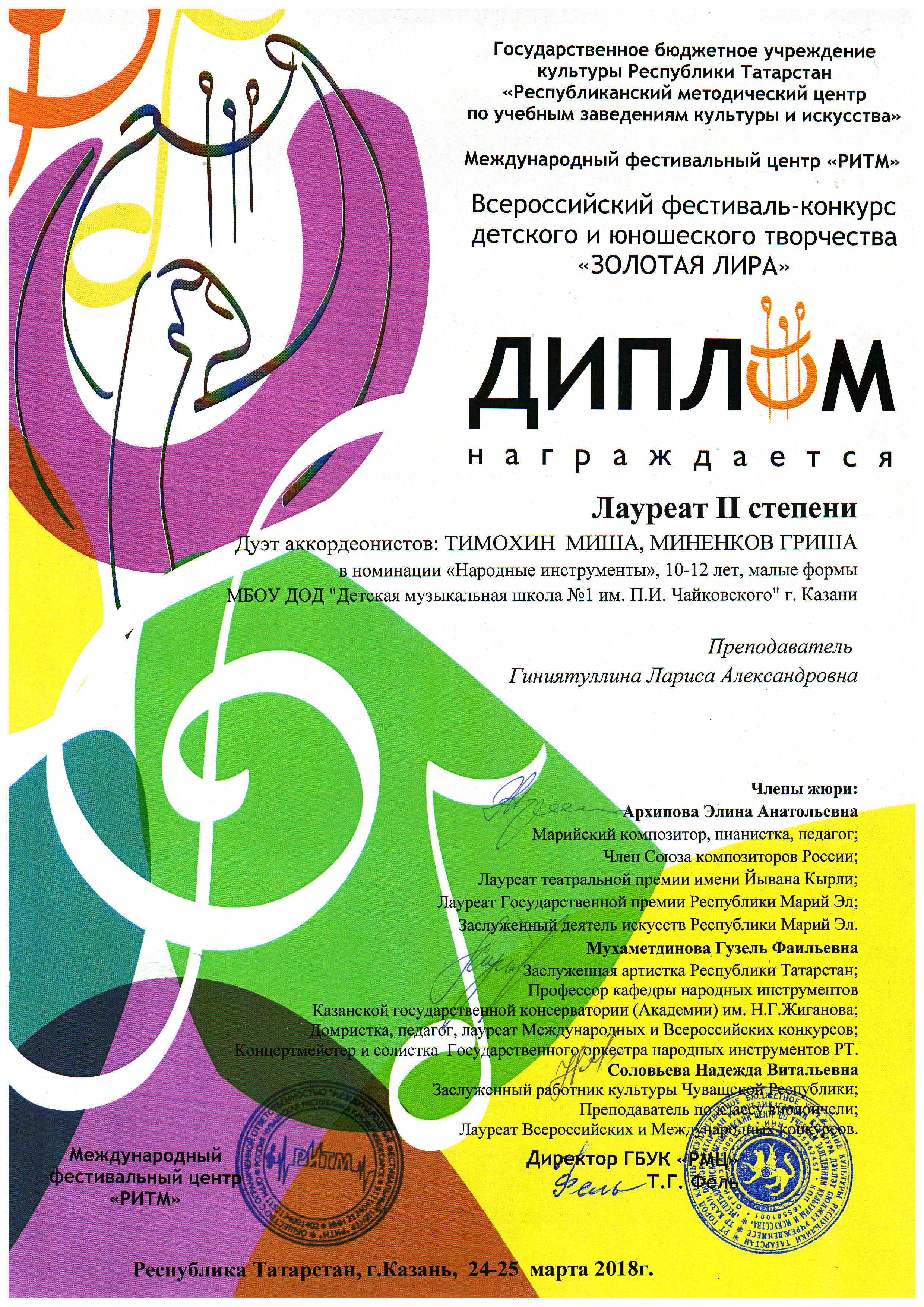 II Всероссийский конкурс-фестиваль молодых исполнителей на народных инструментах "Головокружительные пальцы" - Лауреат III степени, класс преподавателя Петрухиной И.А.;
