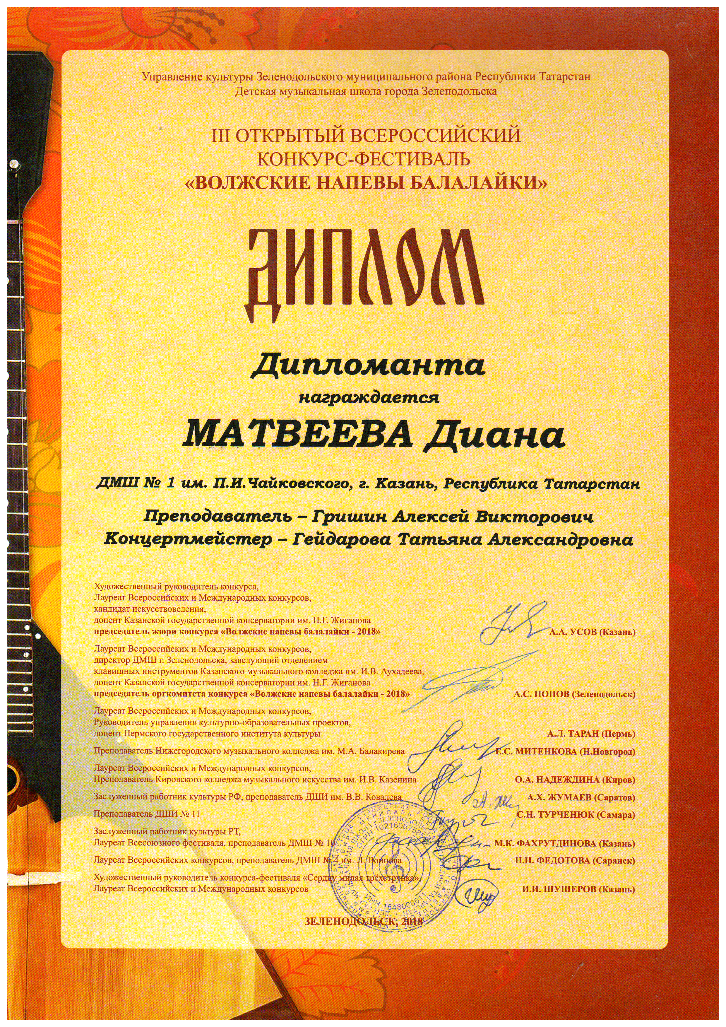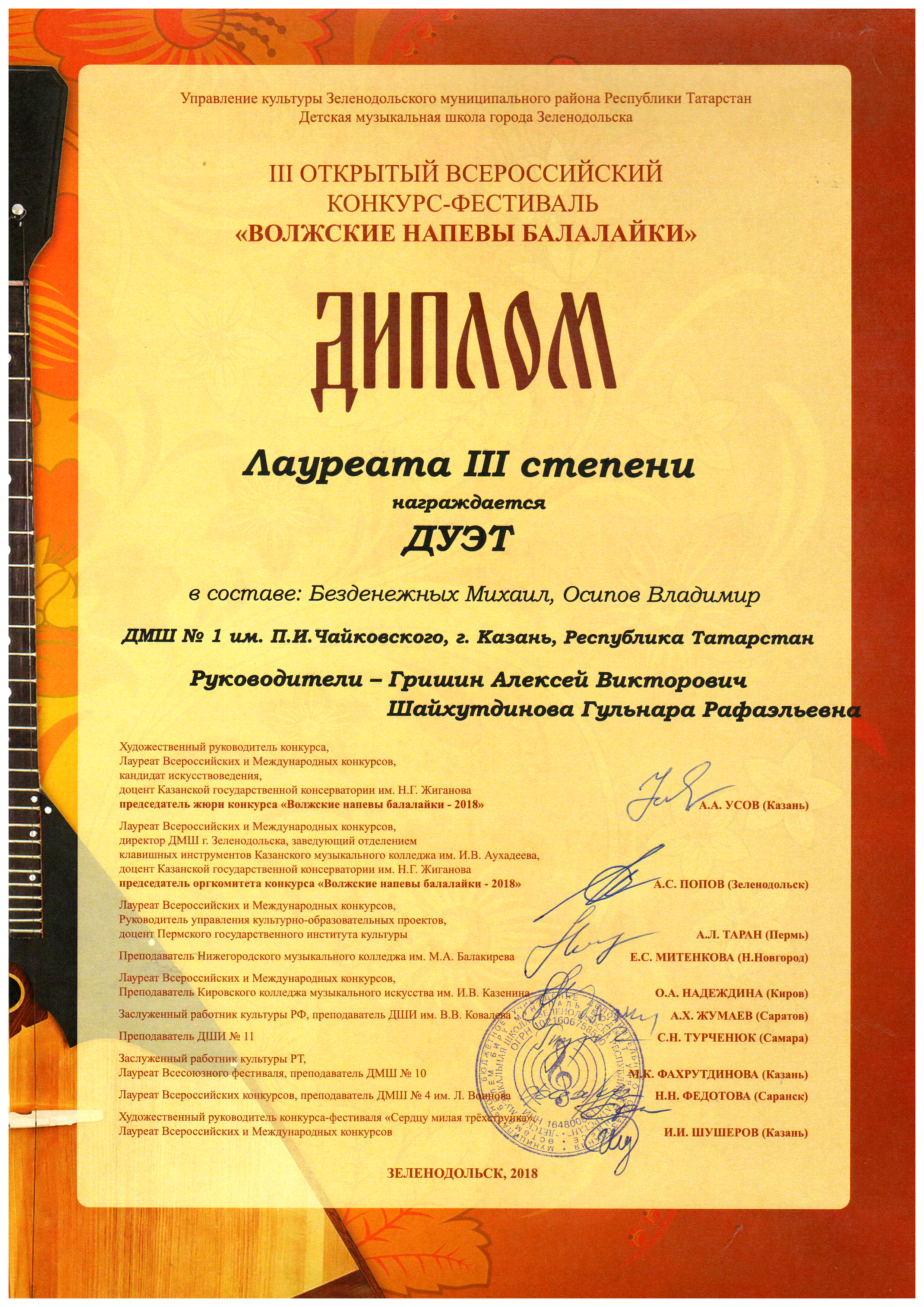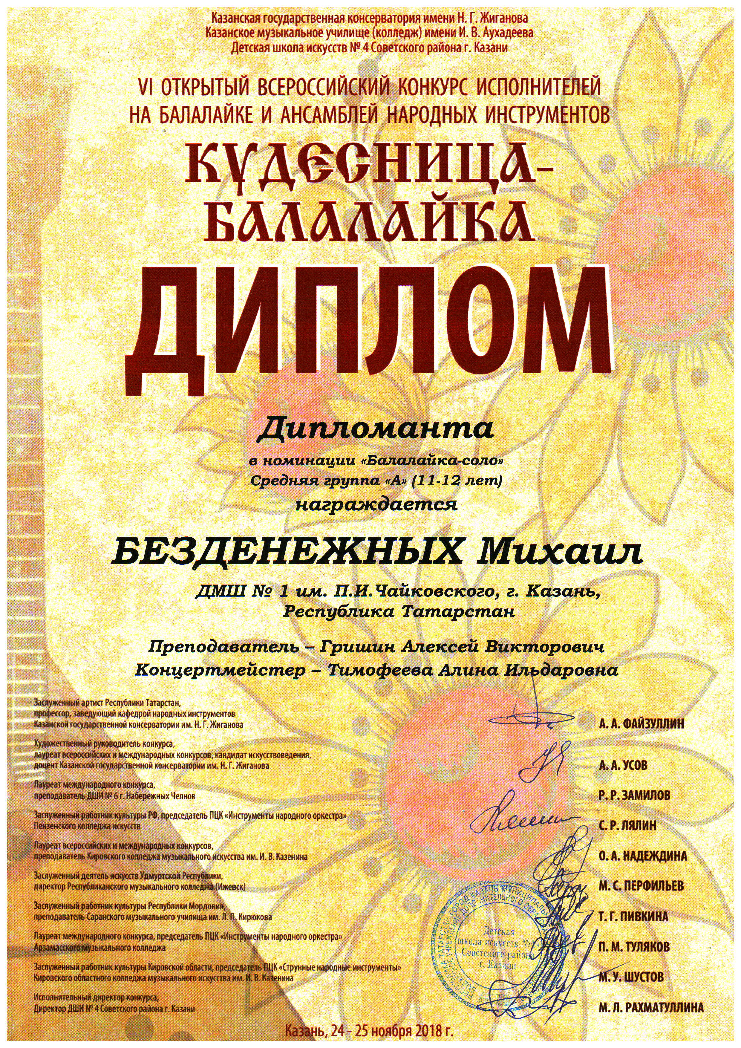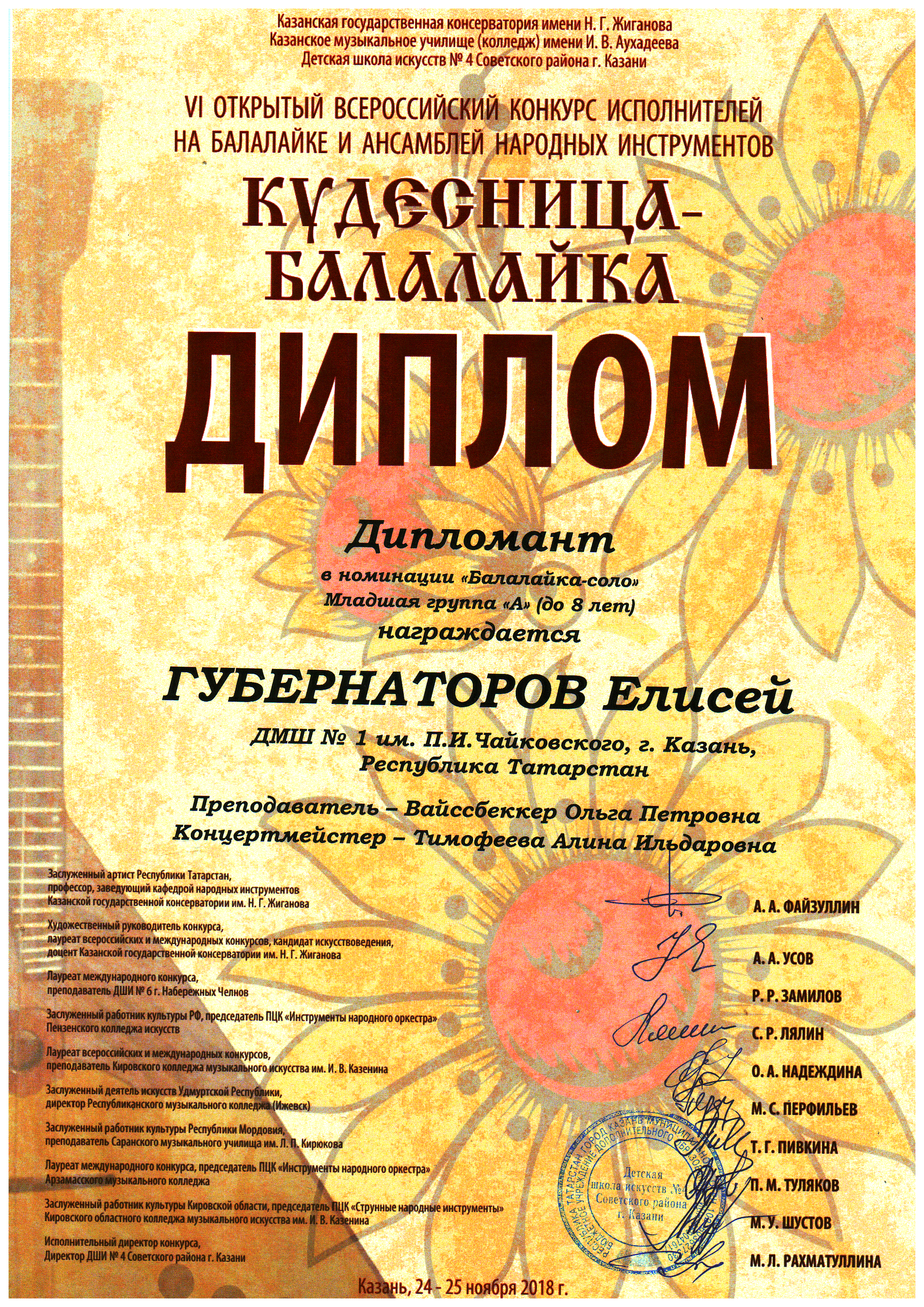 II Всероссийский конкурс-фестиваль молодых исполнителей на народных инструментах "Головокружительные пальцы" - Лауреат III степени, класс преподавателя Петрухиной И.А.;
