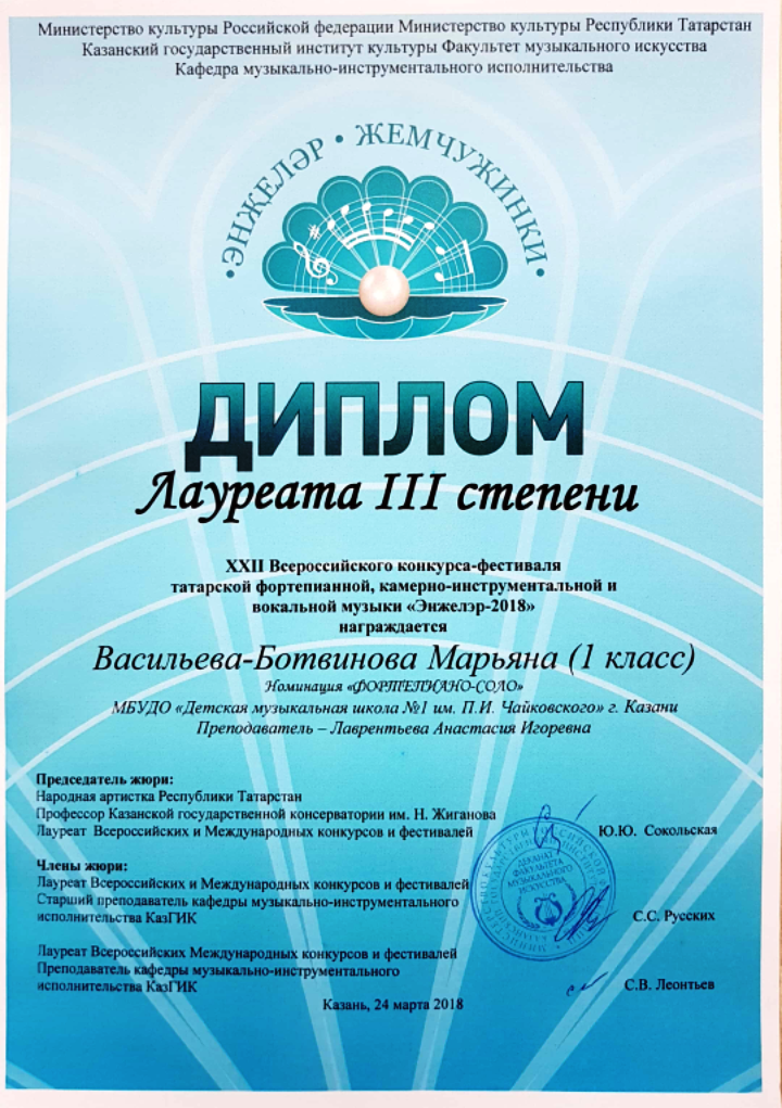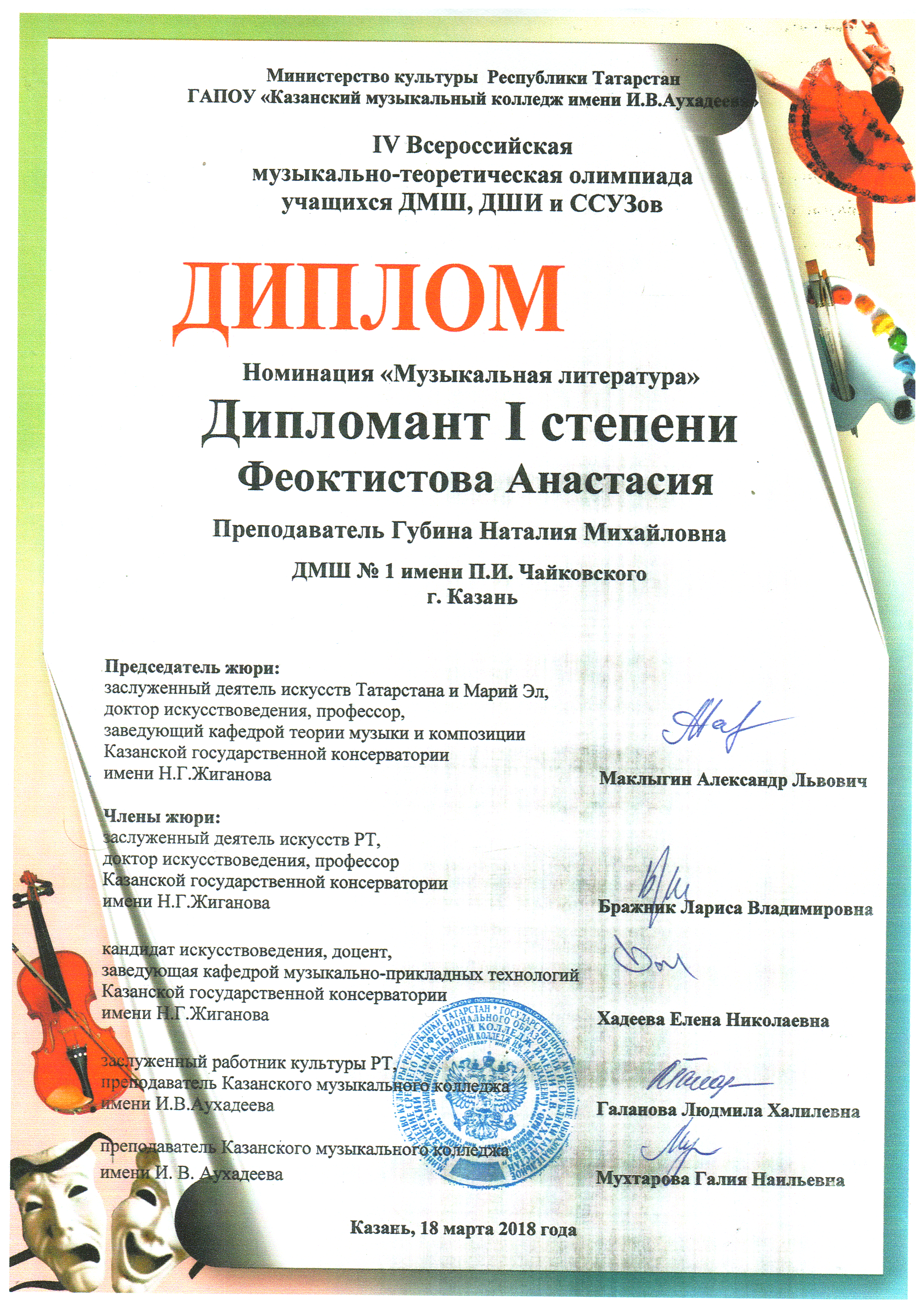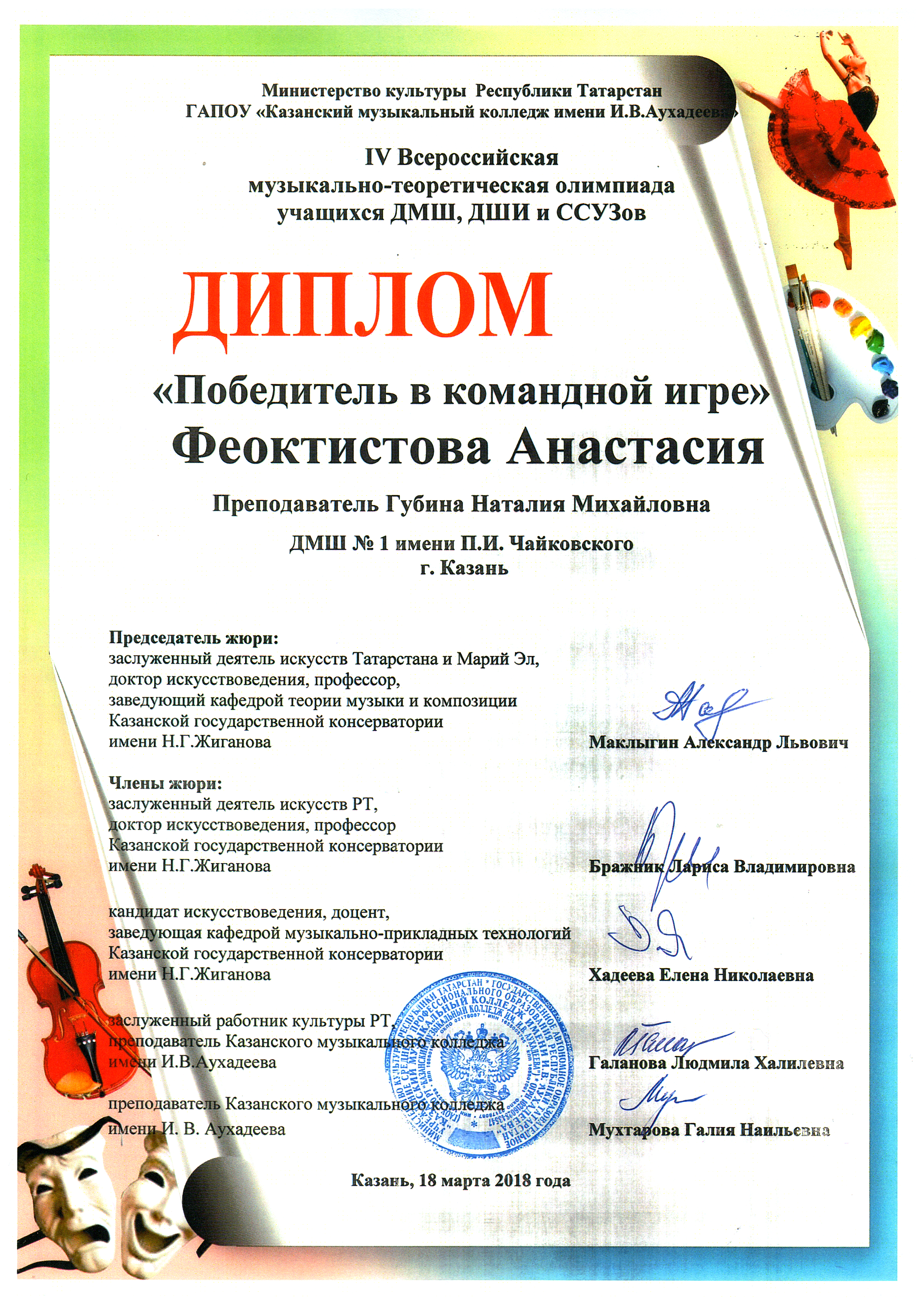 IV Всероссийская музыкально-теоретическая олимпиада учащихся ДМШ, ДШИ и ССУЗов - Феоктистова Анастасия, Дипломант I степени;/upload/storage/org5611/files/Олимпиада Феоктистова дипломант.BMP