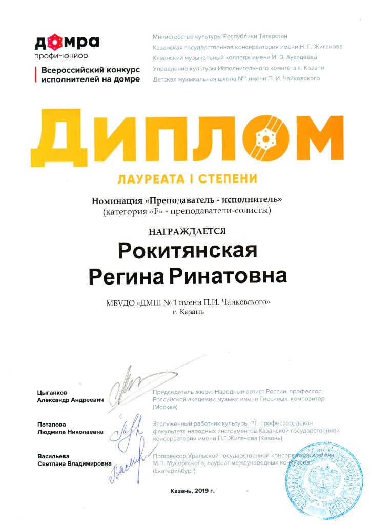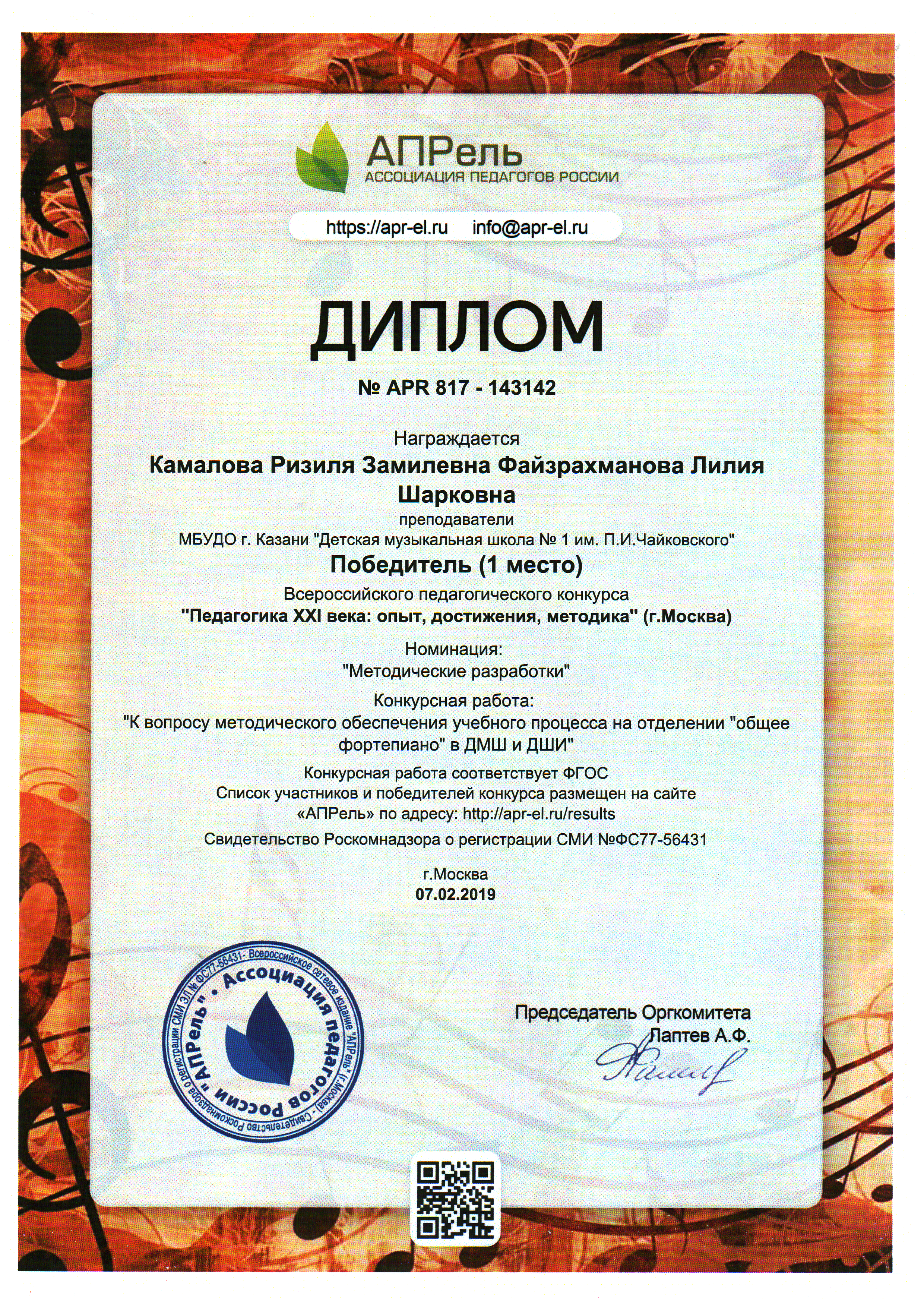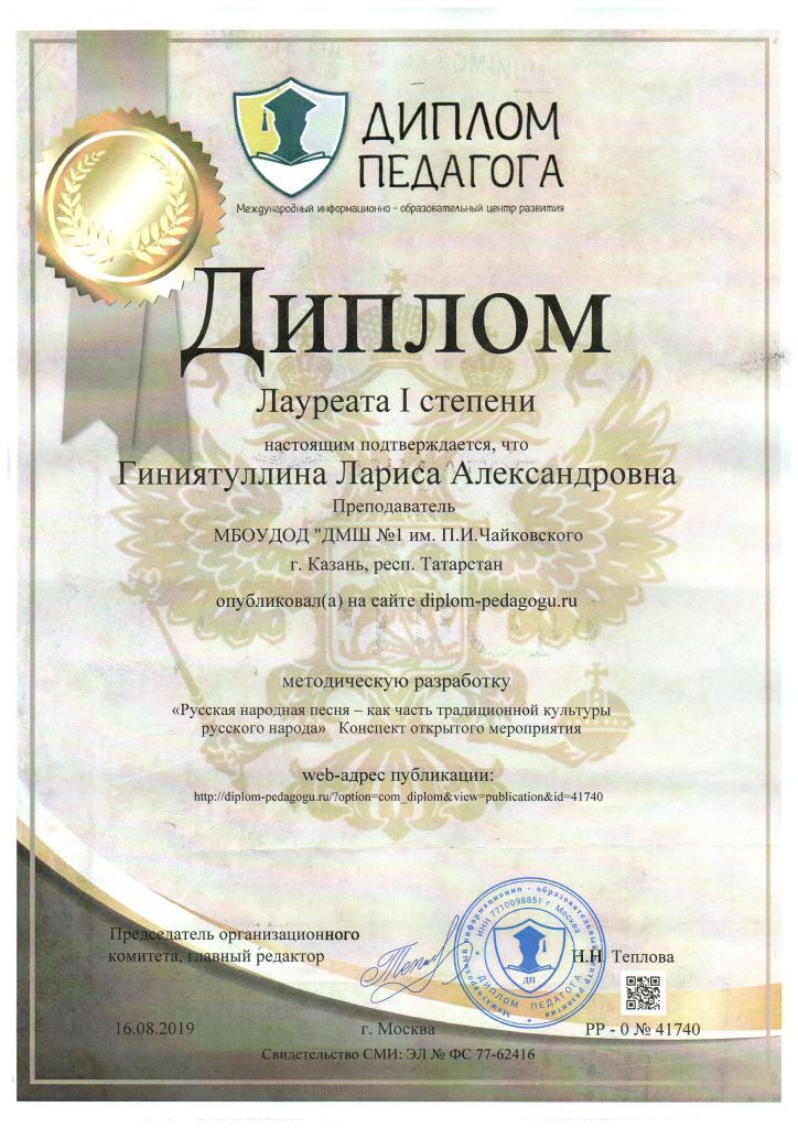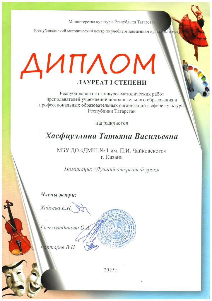 Республиканский конкурс методических работ преподавателей УДО - Хасфиуллина Т.В., Лауреат I степени;
