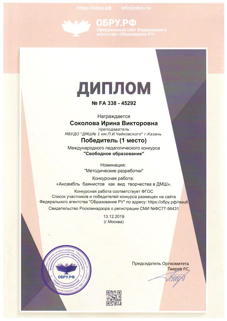 Международный педагогический конкурс "Свободное образование" - Победитель (I место) - Соколова И.В.;