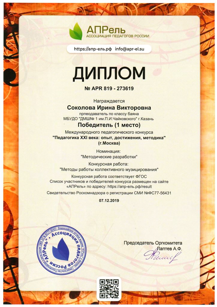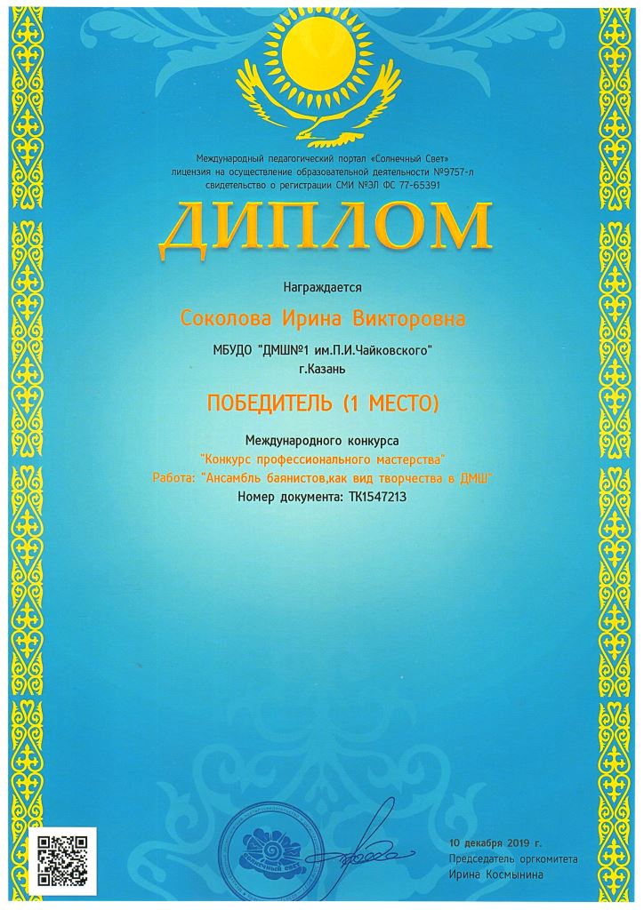 Международный педагогический конкурс "Педагогика XXI века" - Победитель (I место) - Соколова И.В.;