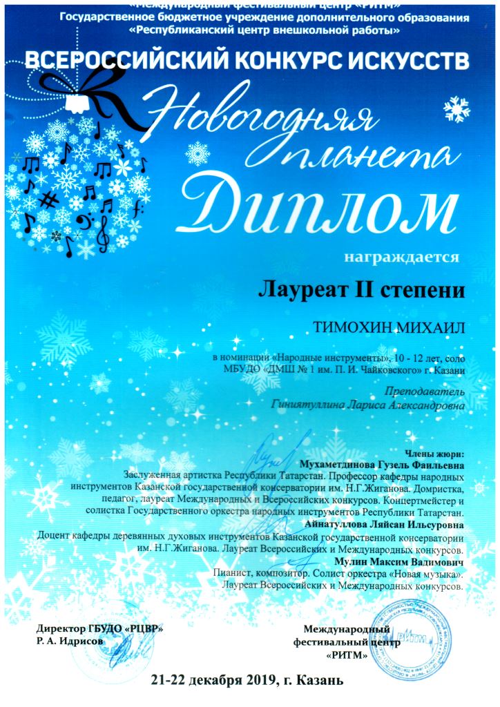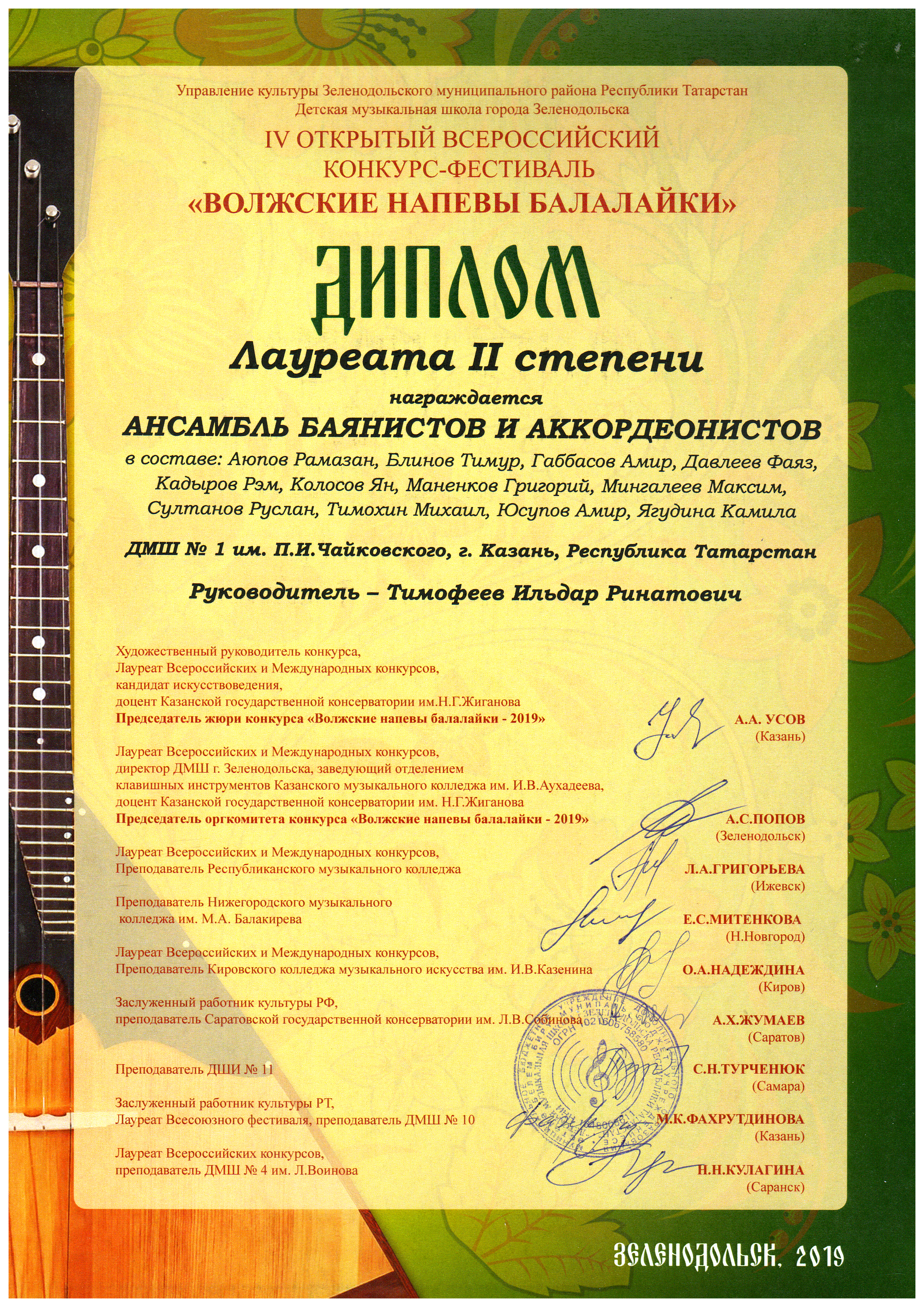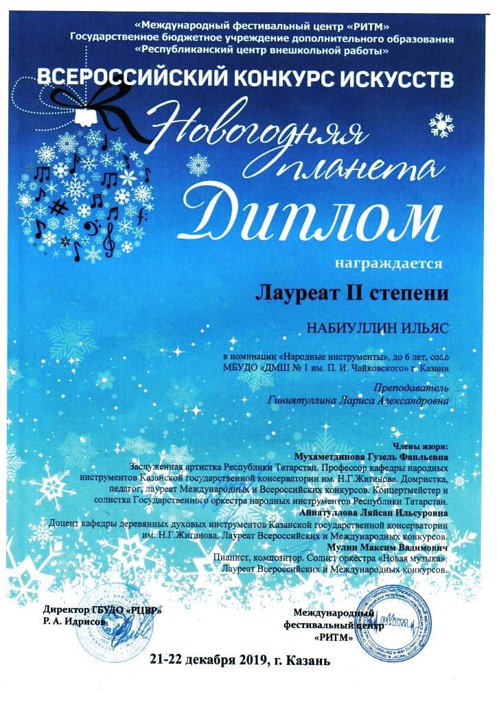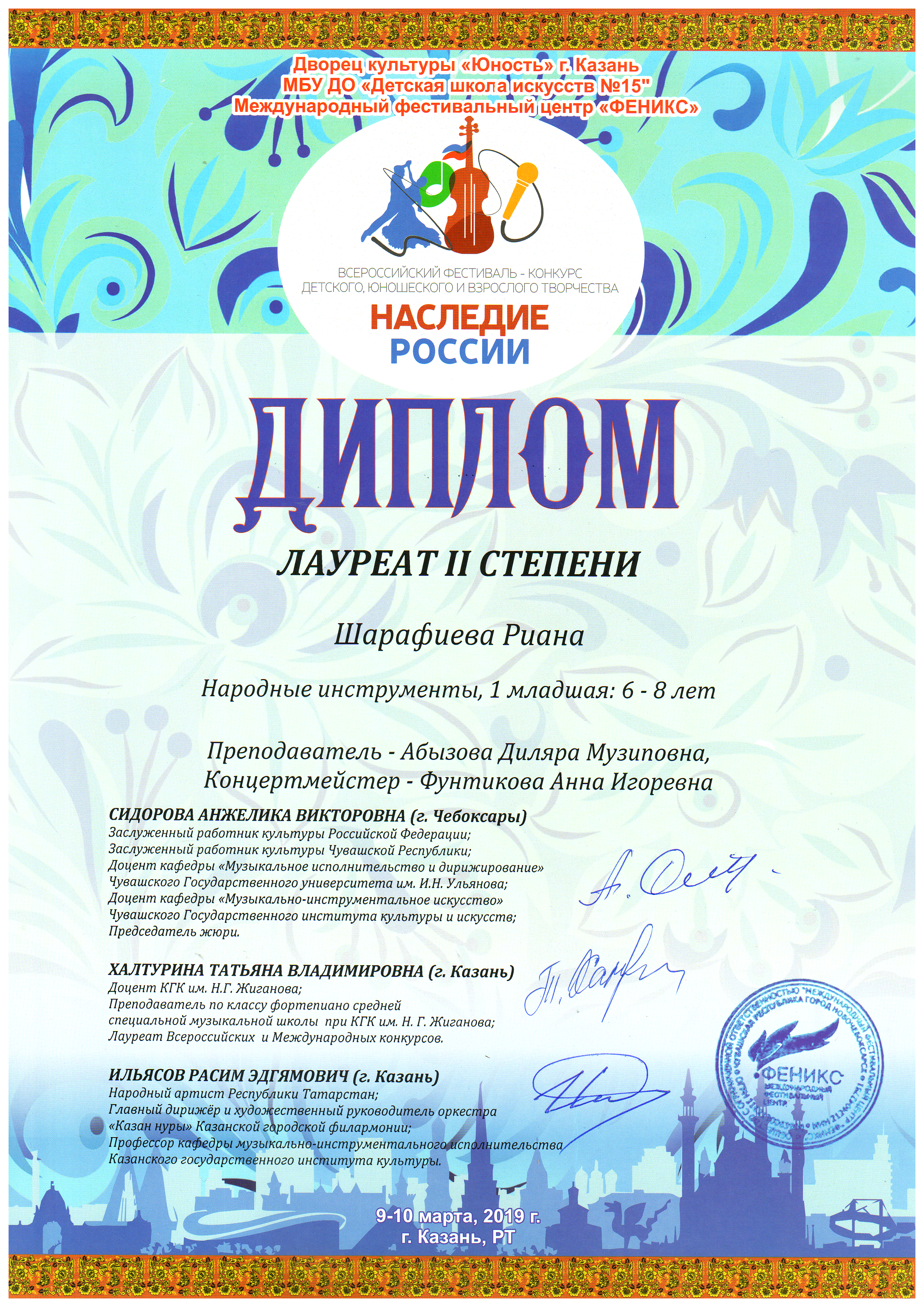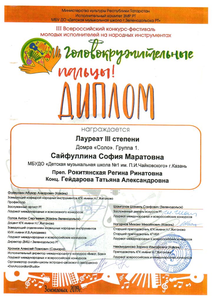 III Всероссийский конкурс-фестиваль молодых исполнителей на народных инструментах "Головокружительные пальцы" - Файзерахманова Ляйсан, Лауреат II степени, класс Петрухиной И.А.;