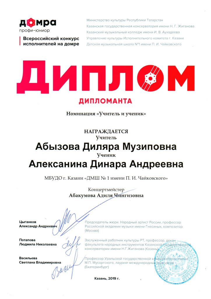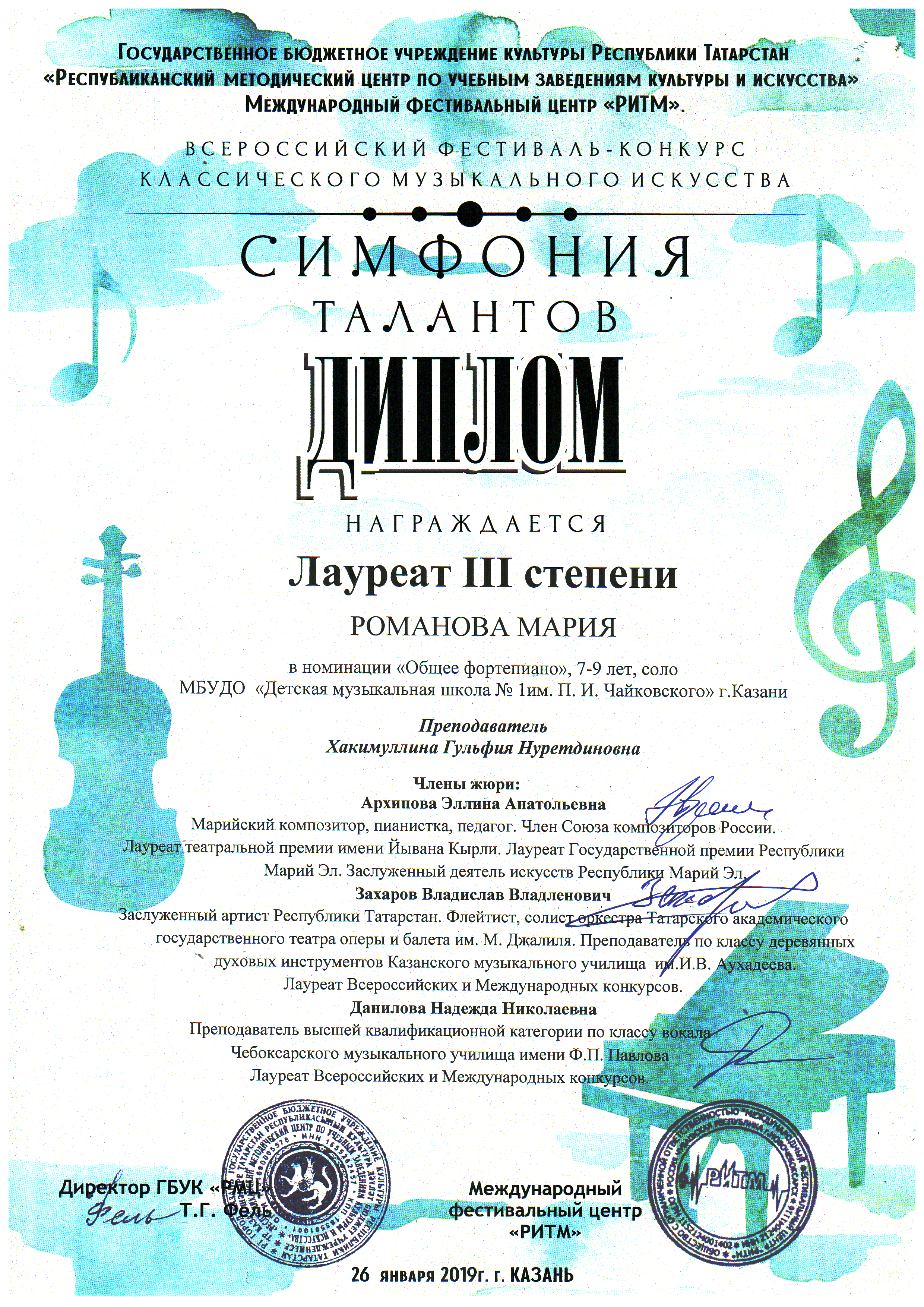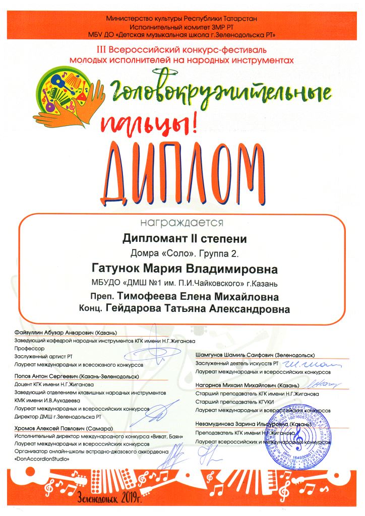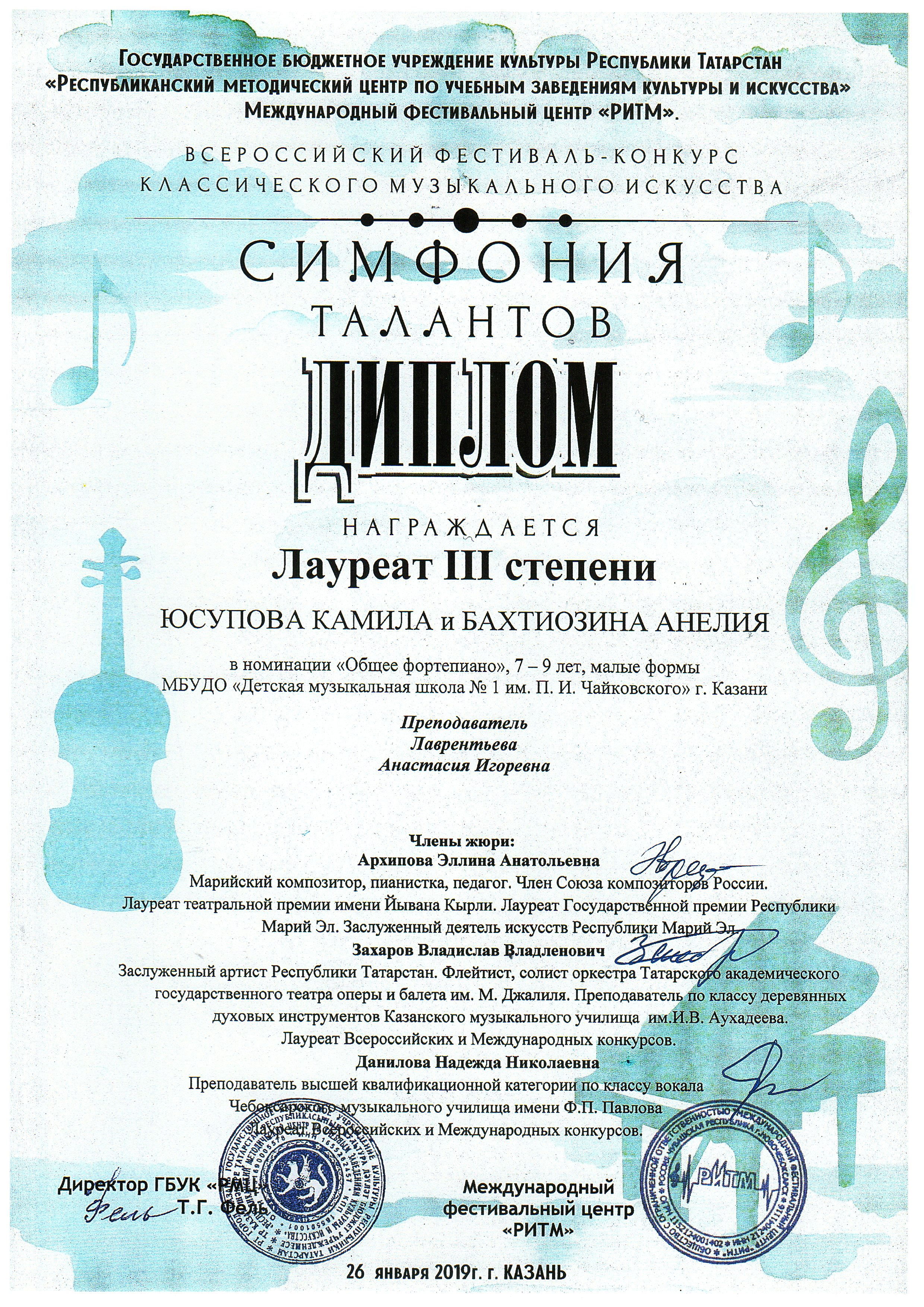 III Всероссийский конкурс-фестиваль молодых исполнителей на народных инструментах "Головокружительные пальцы" - Файзерахманова Ляйсан, Лауреат II степени, класс Петрухиной И.А.;