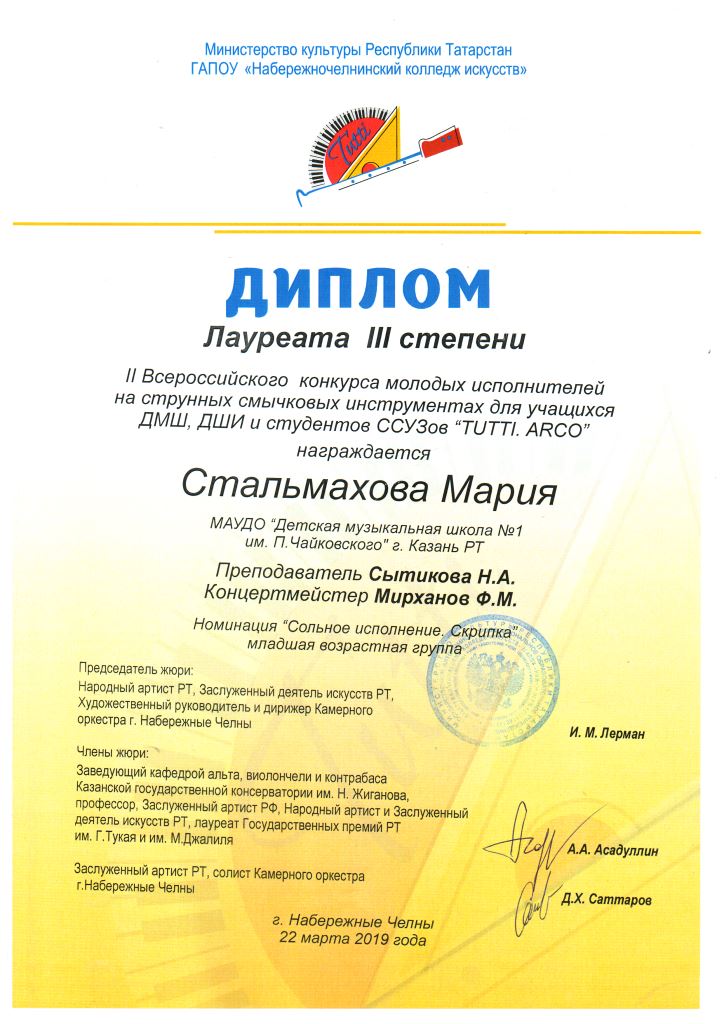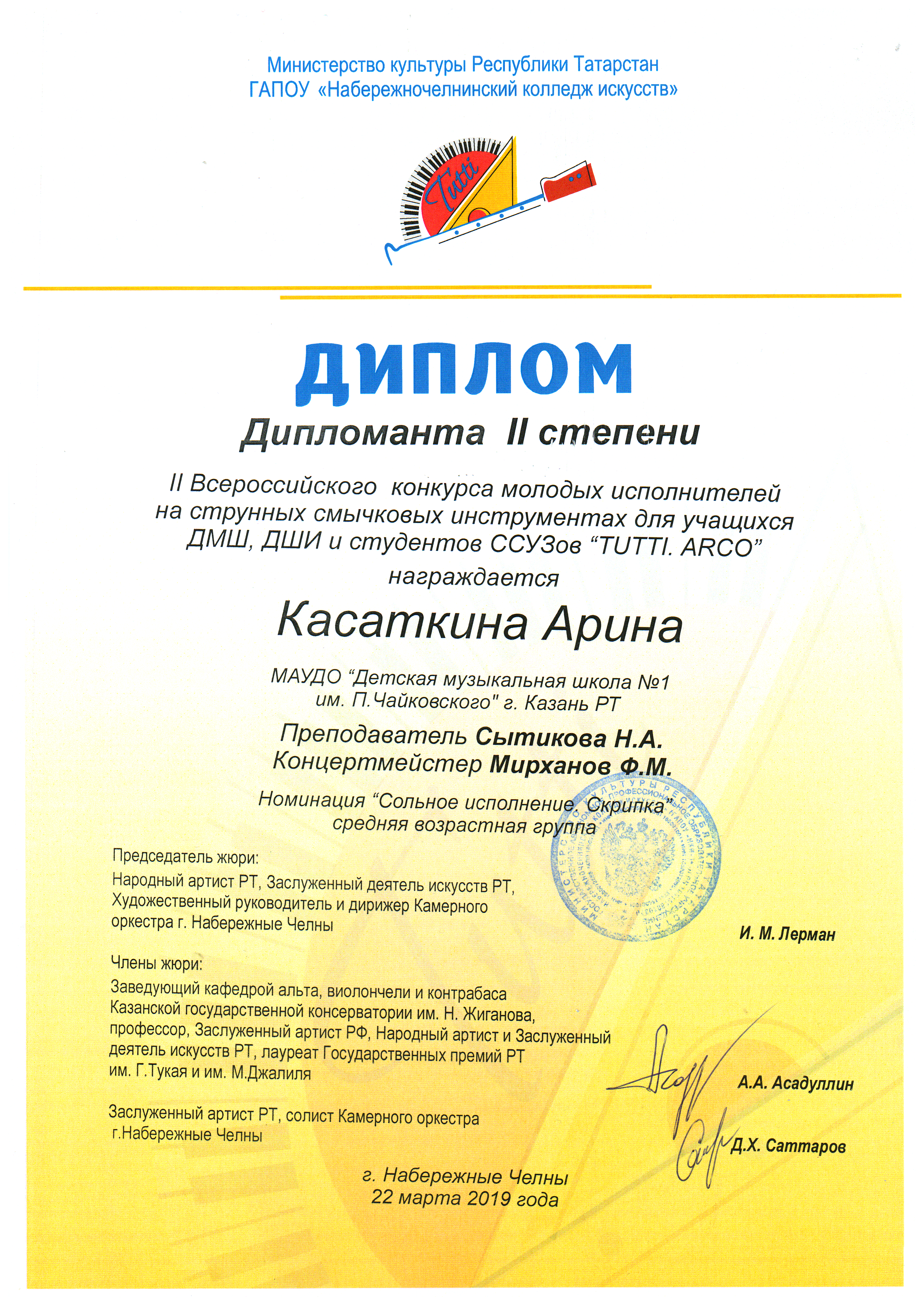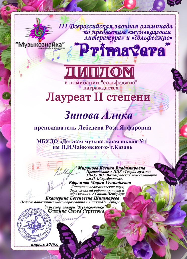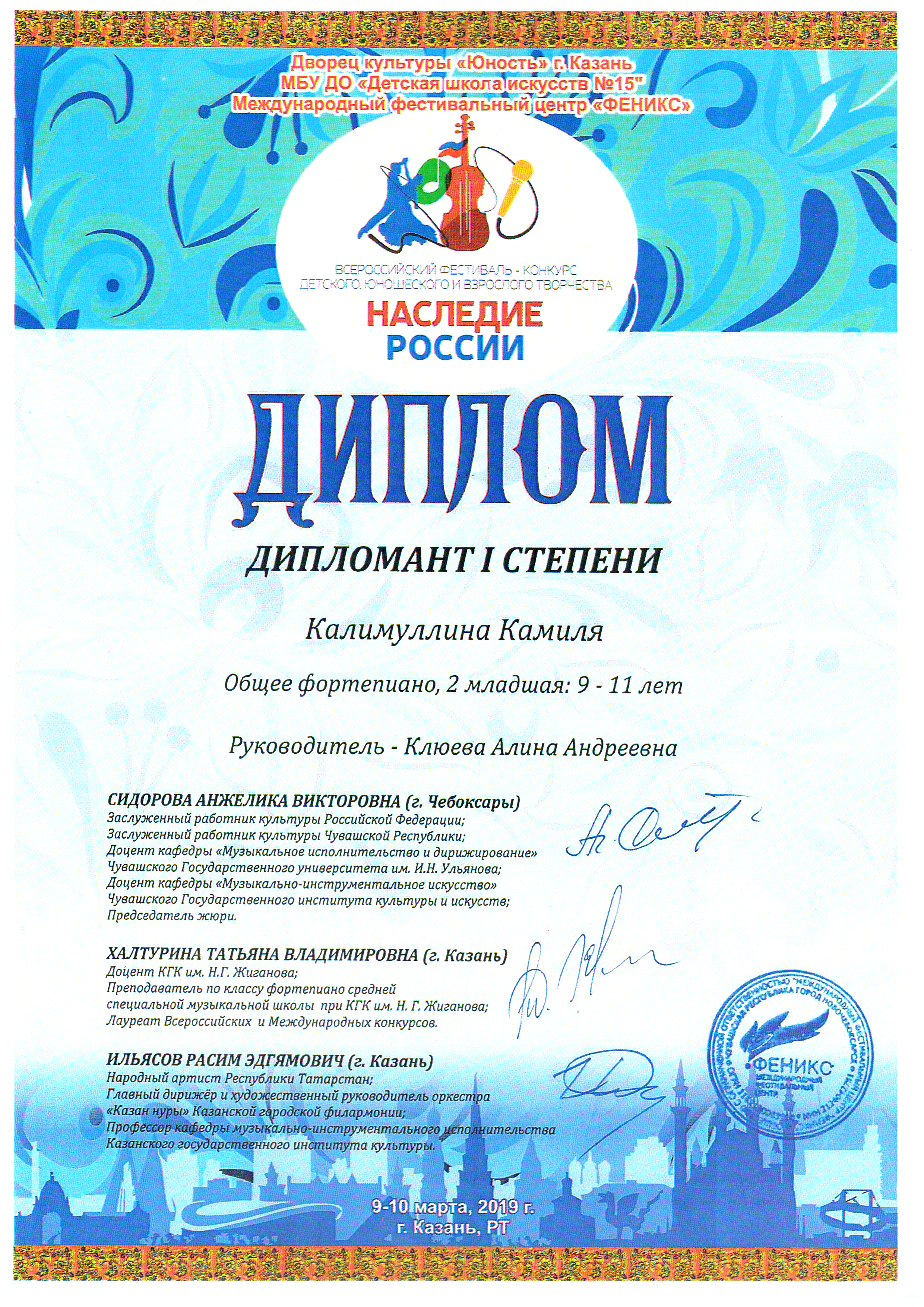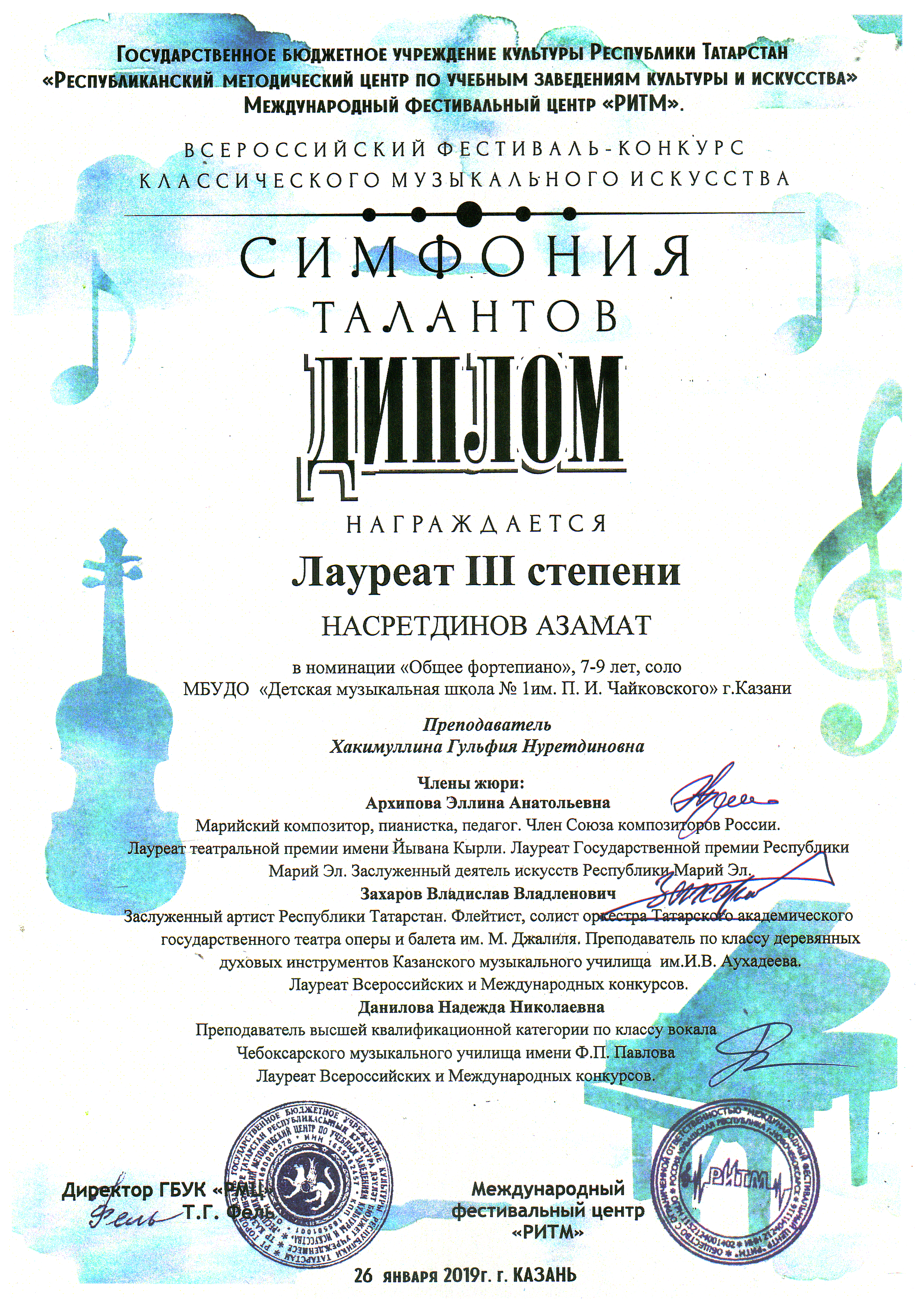 III Всероссийский конкурс-фестиваль молодых исполнителей на народных инструментах "Головокружительные пальцы" - Файзерахманова Ляйсан, Лауреат II степени, класс Петрухиной И.А.;