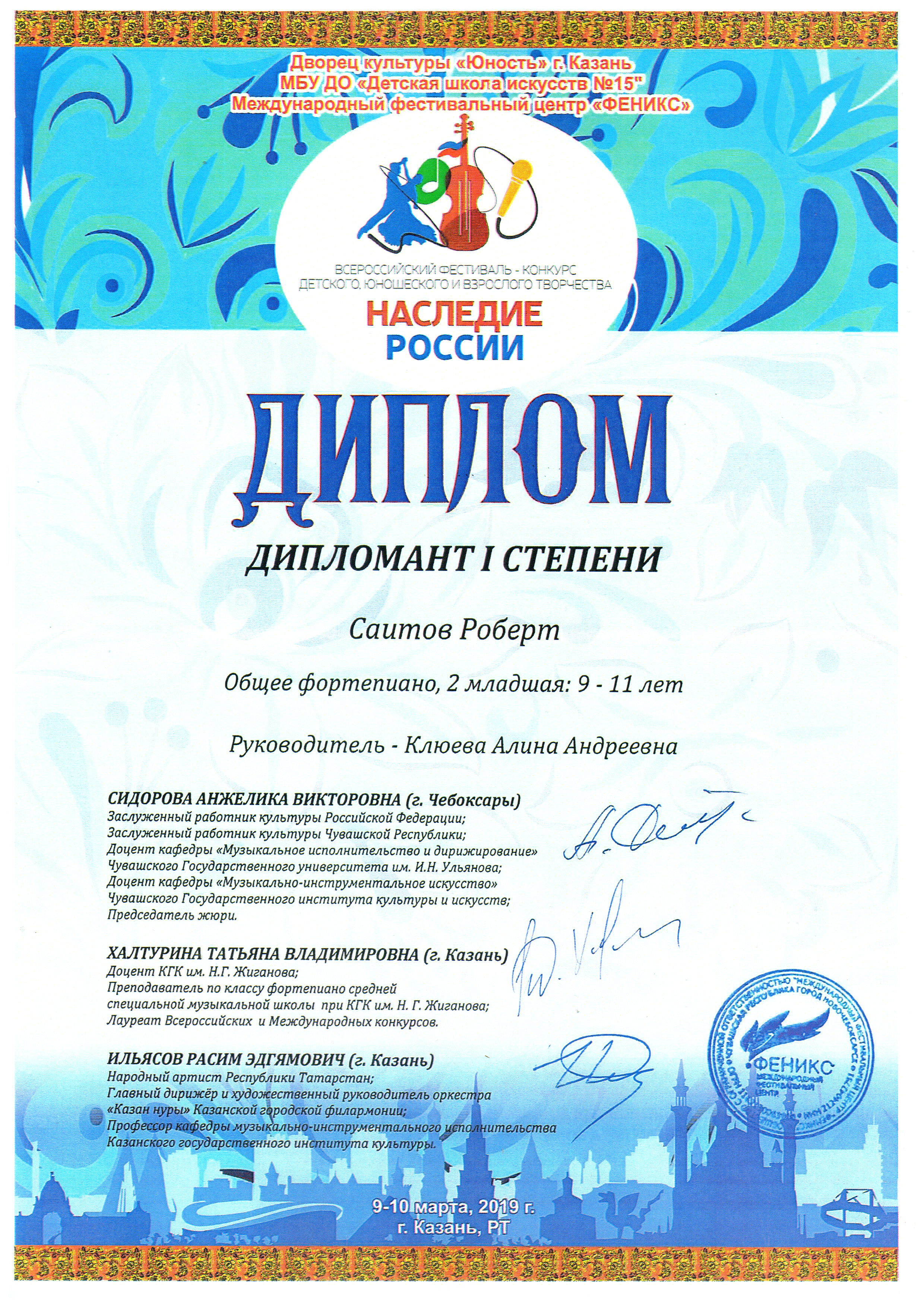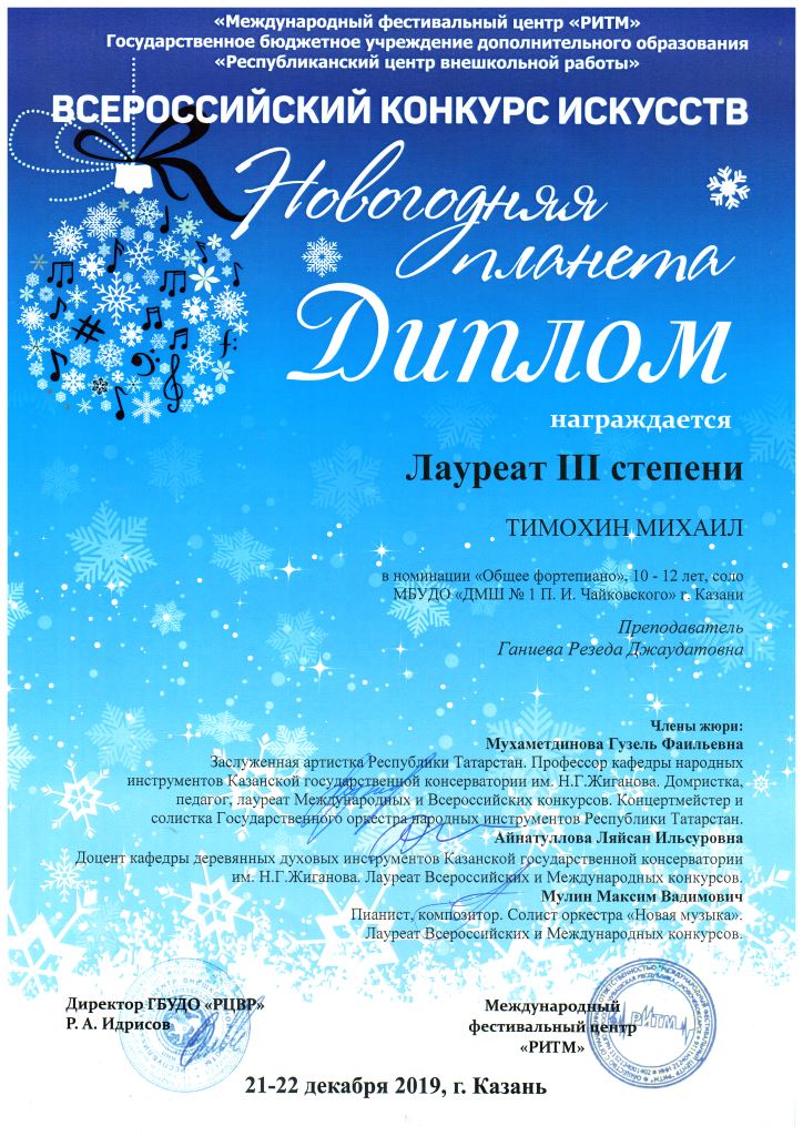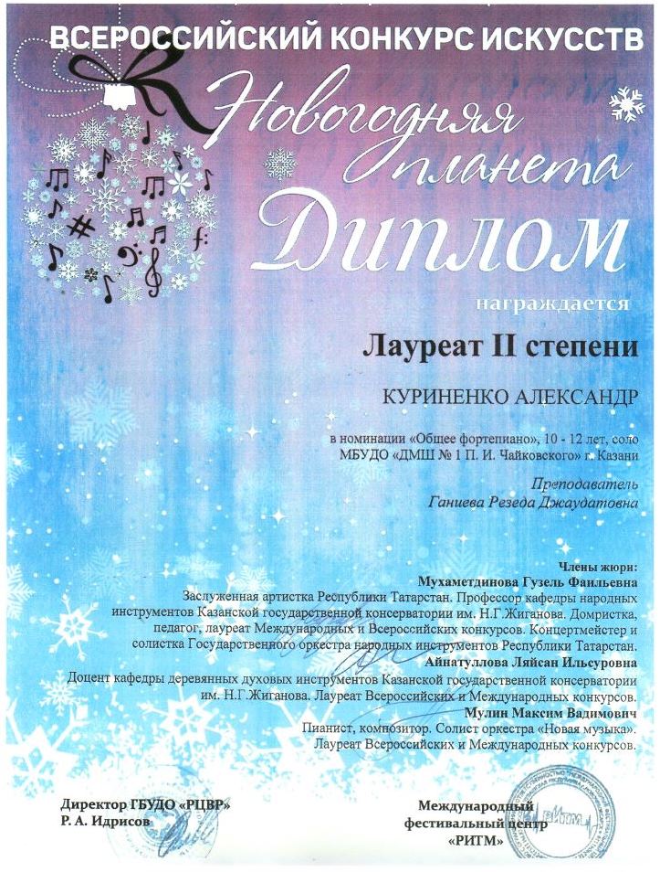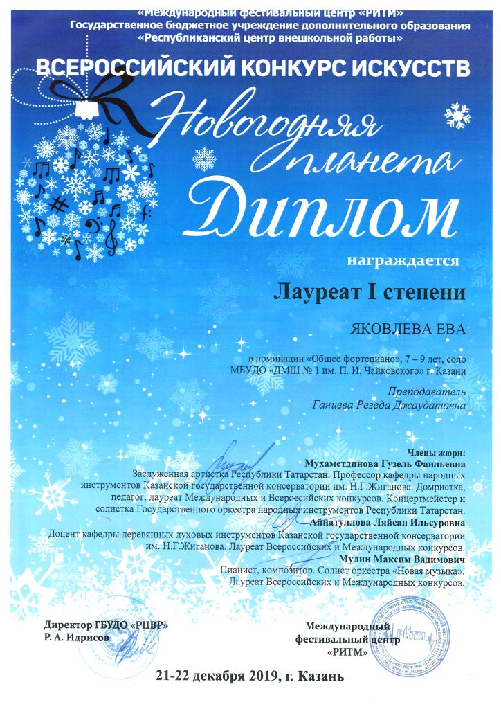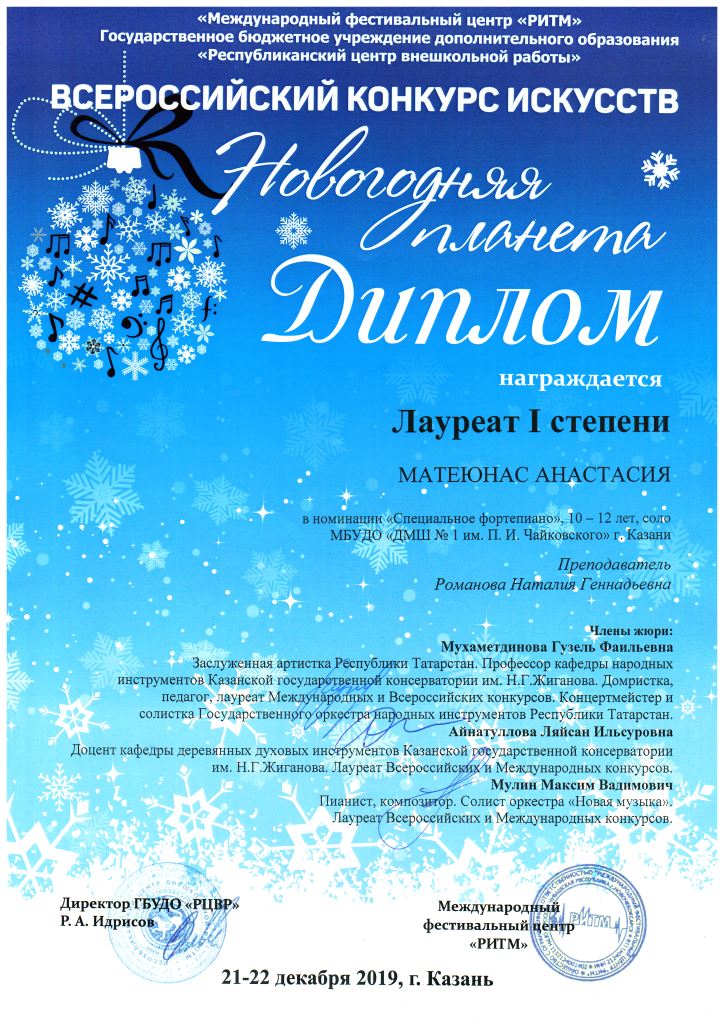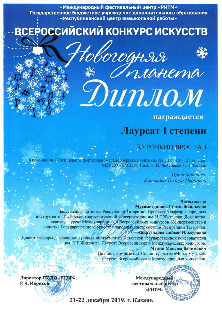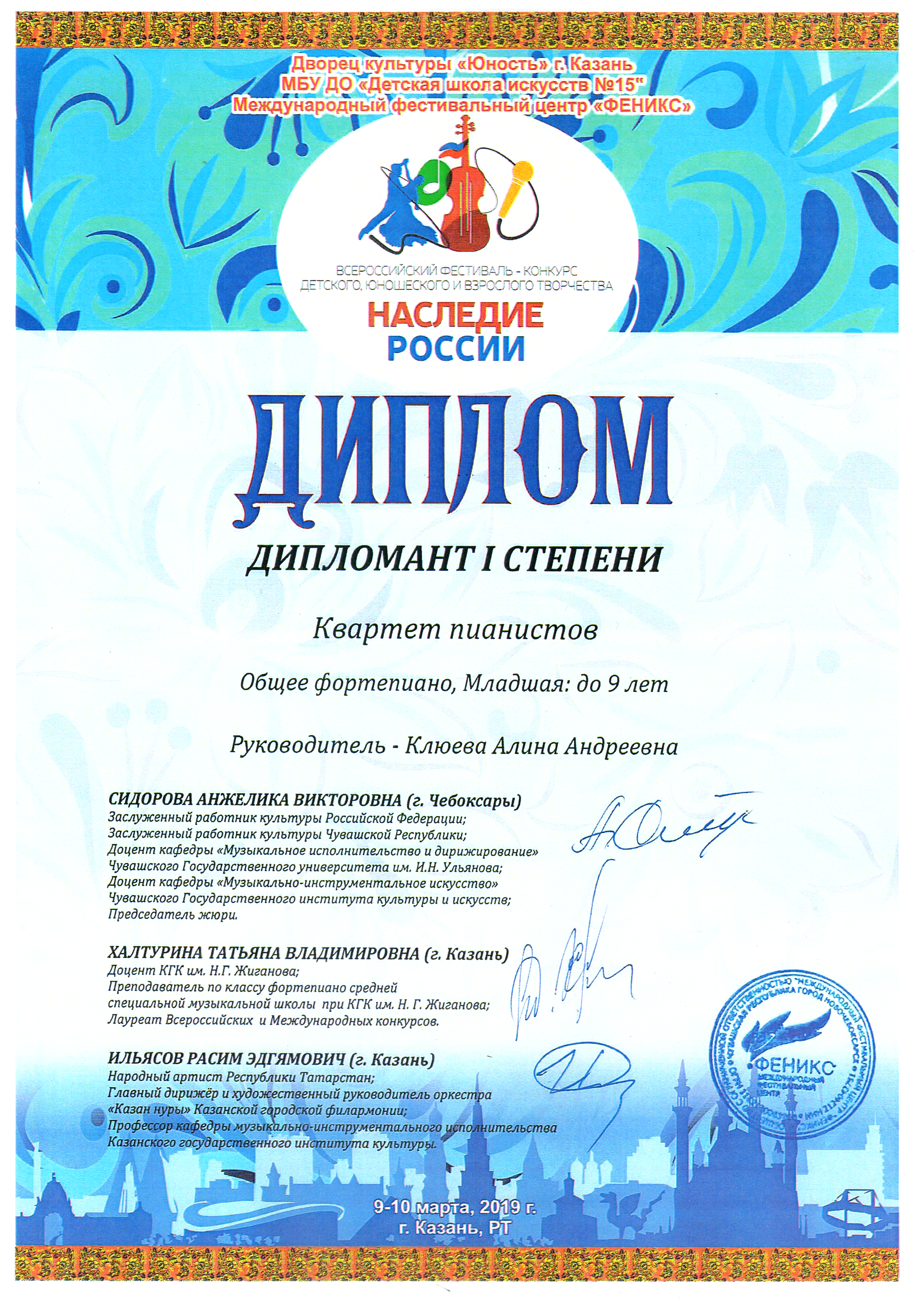 Всероссийский фестиваль-конкурс детского, юношеского и взрослого творчества "Звёздная карусель" - , Лауреат I степени, класс Копыловой Т.И.;
