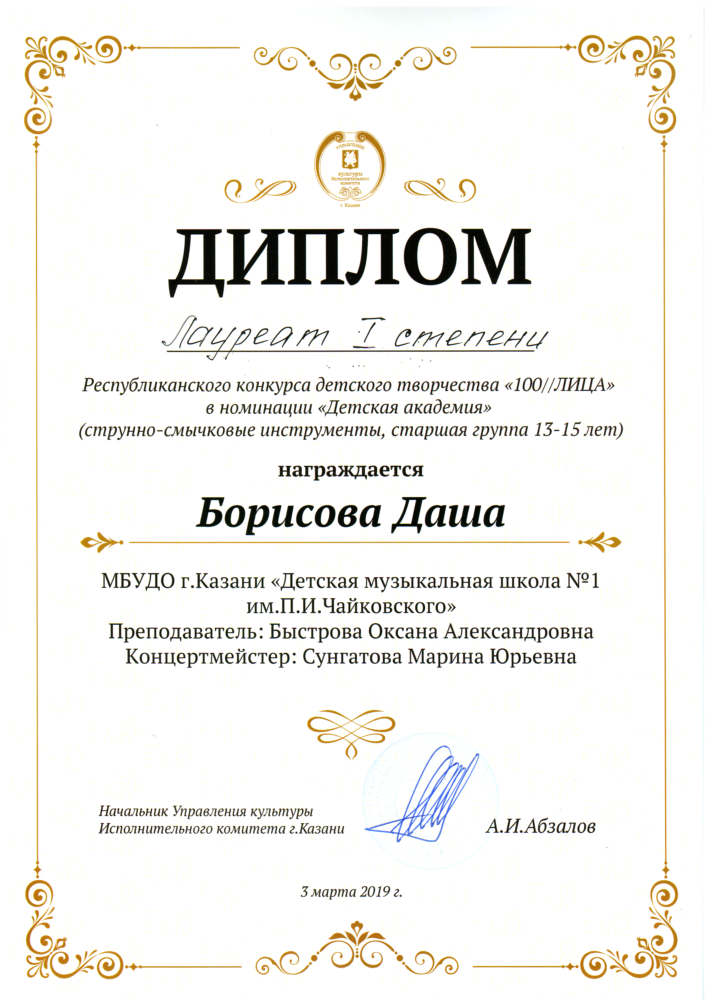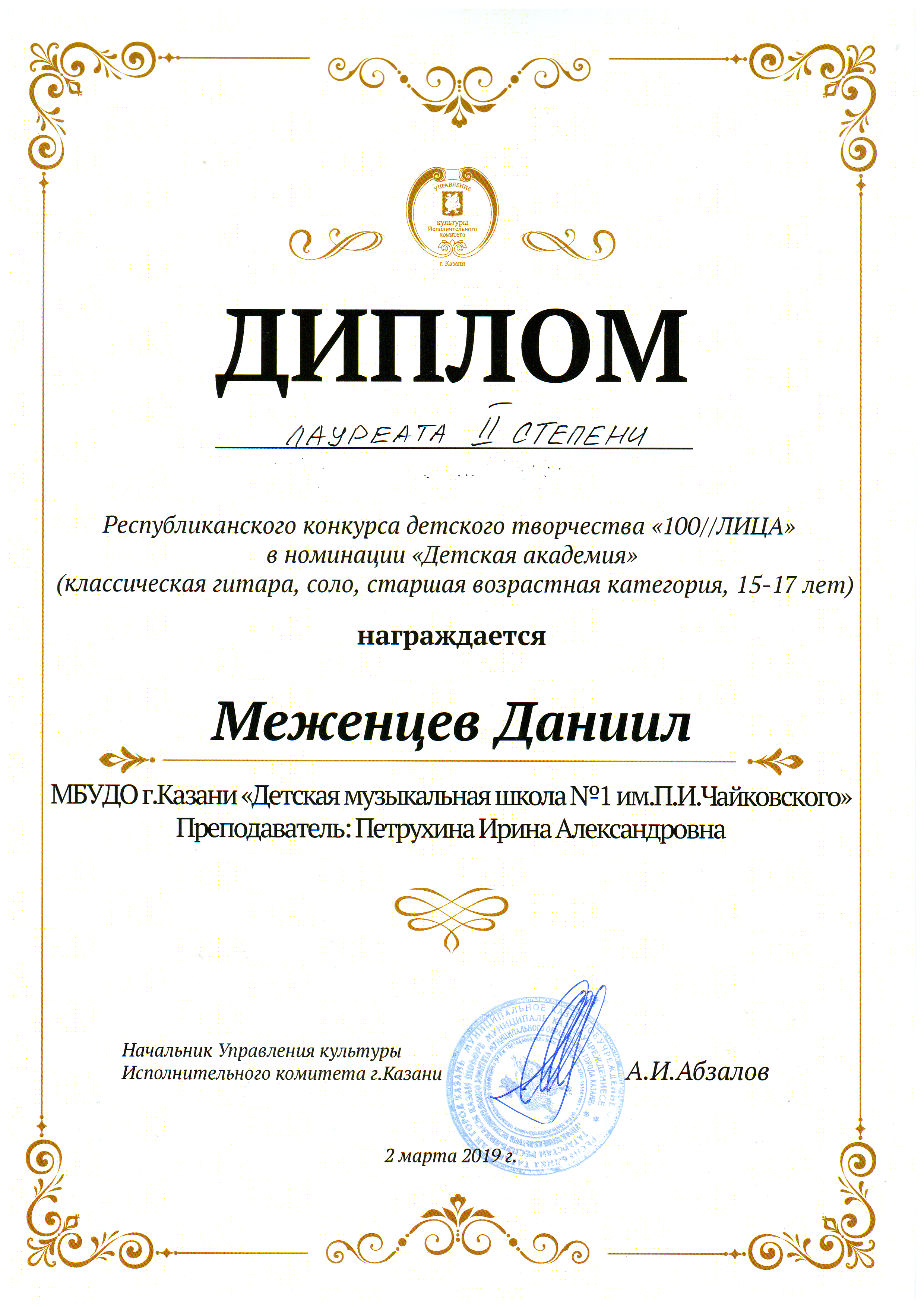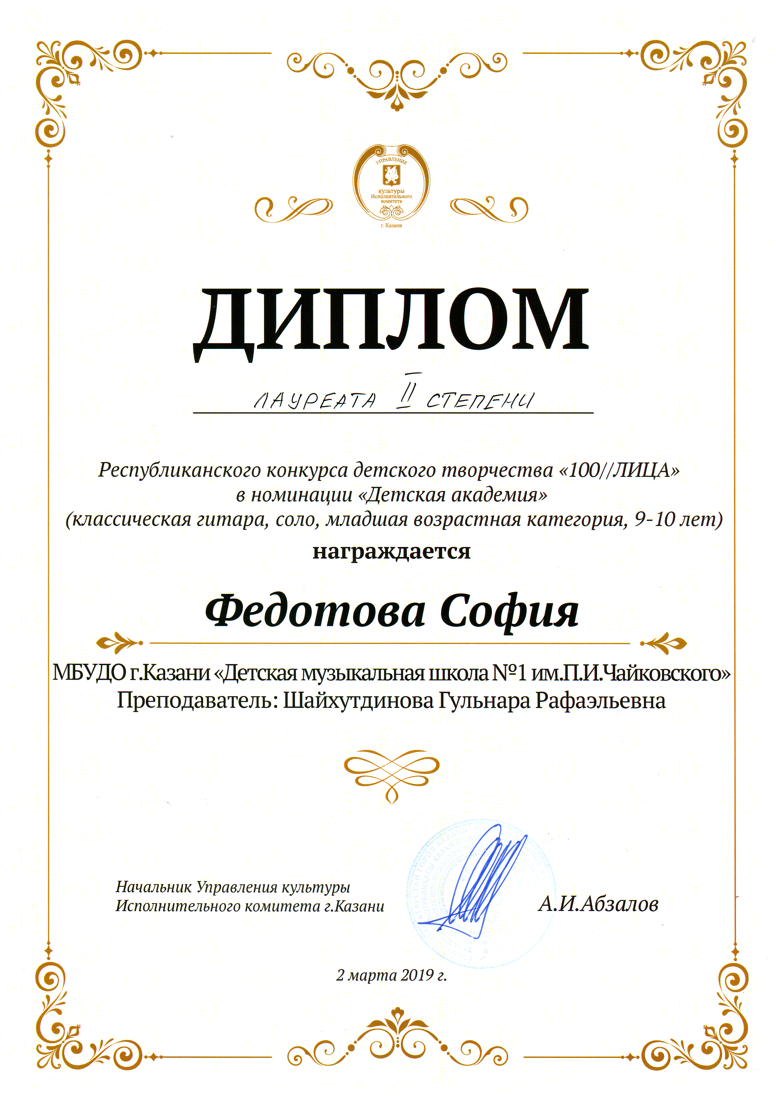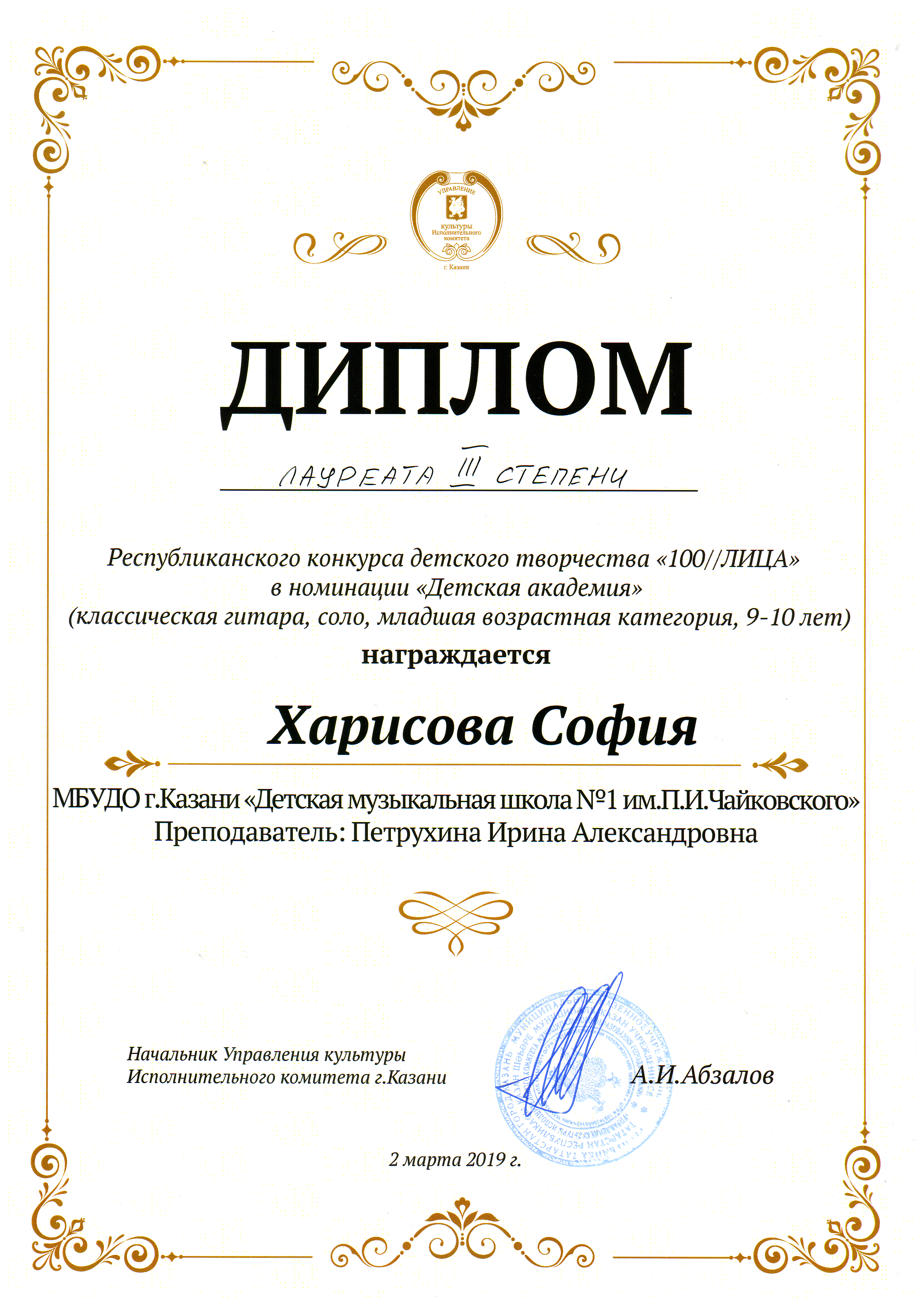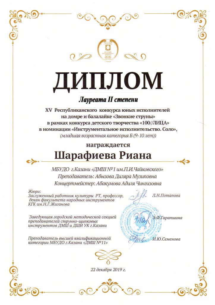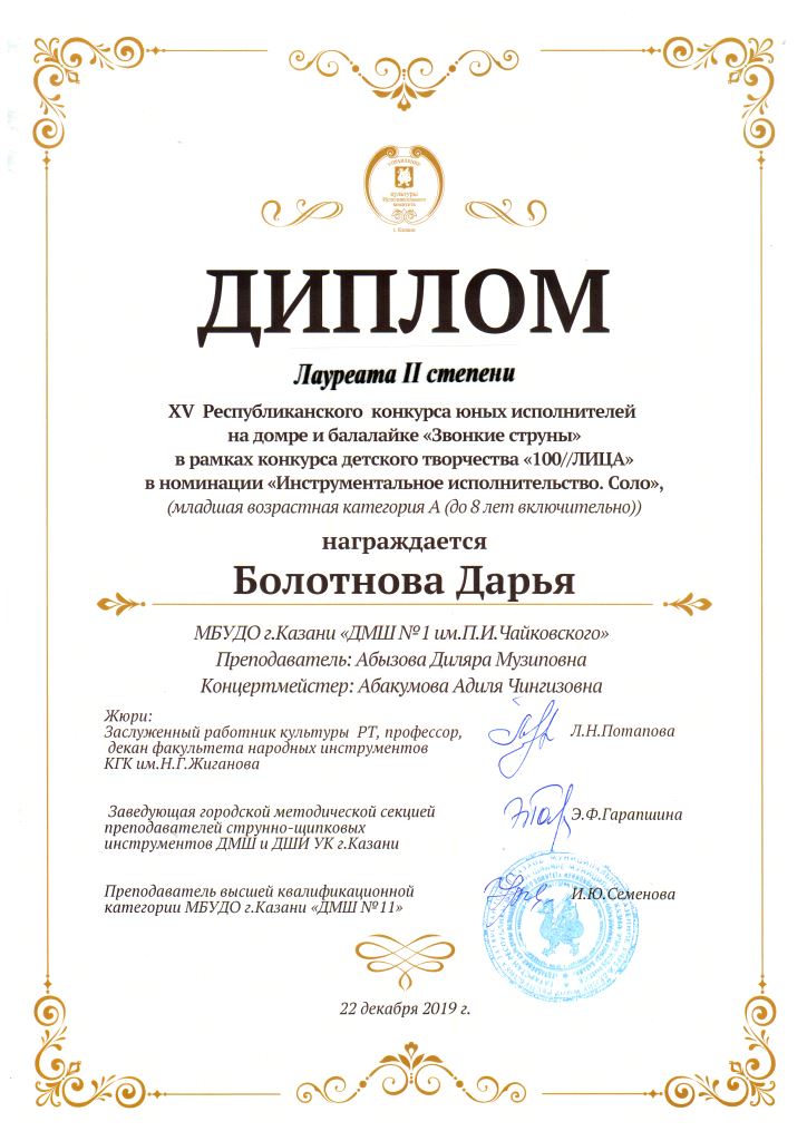 ХV Республиканский конкурс юных исполнителей на домре и балалайке "Звонкие струны" в рамках конкурса детского творчества "100//ЛИЦА"- Лауреат II степени, класс Абызовой Д.М., концертмейстер Абакумова А.Ч.;