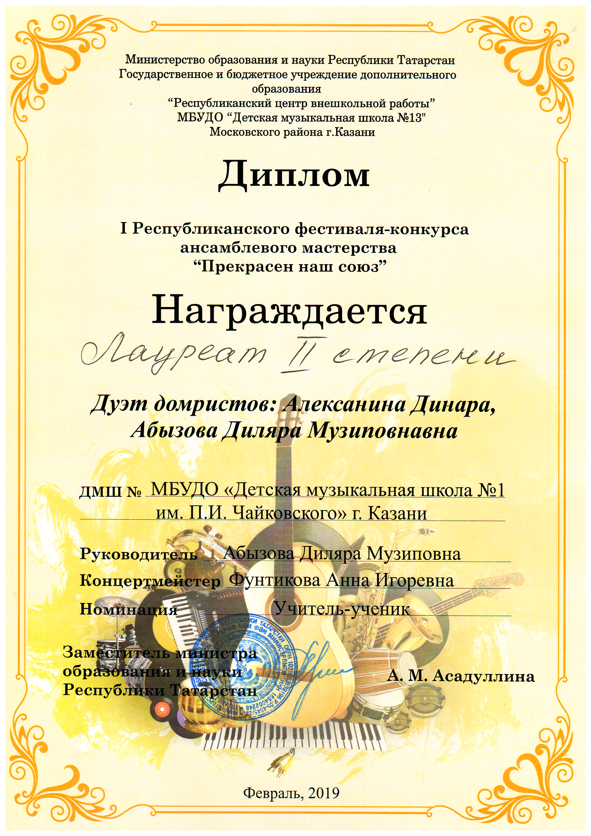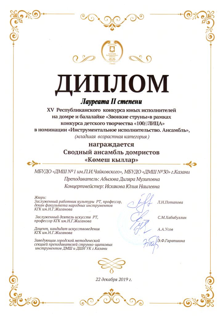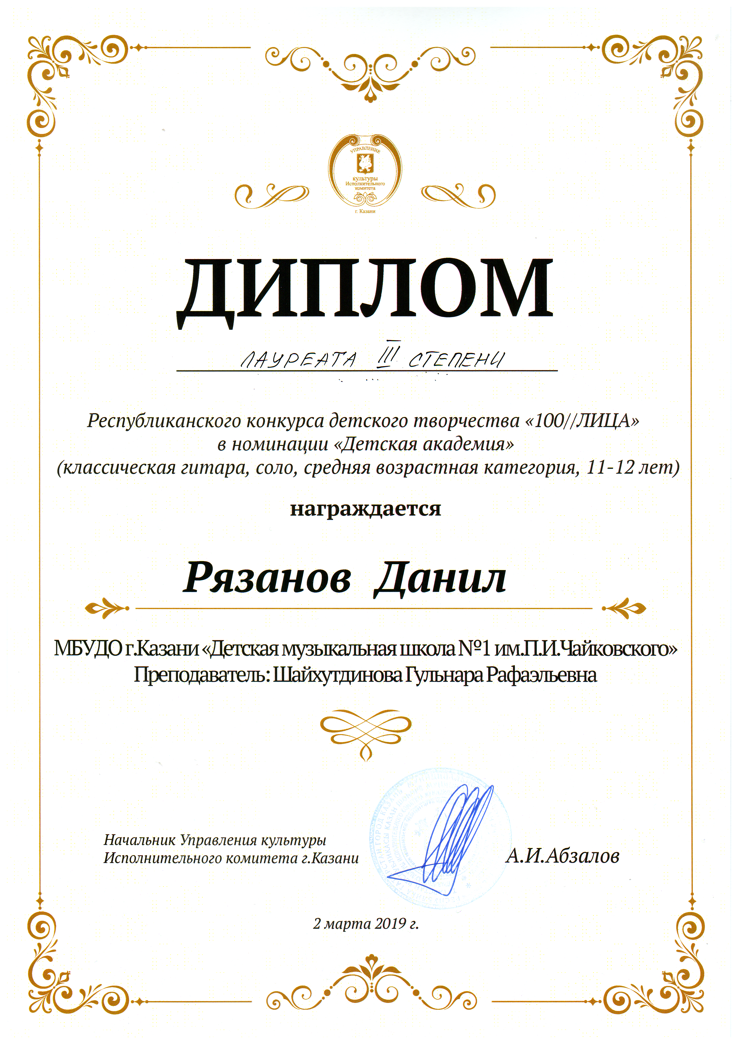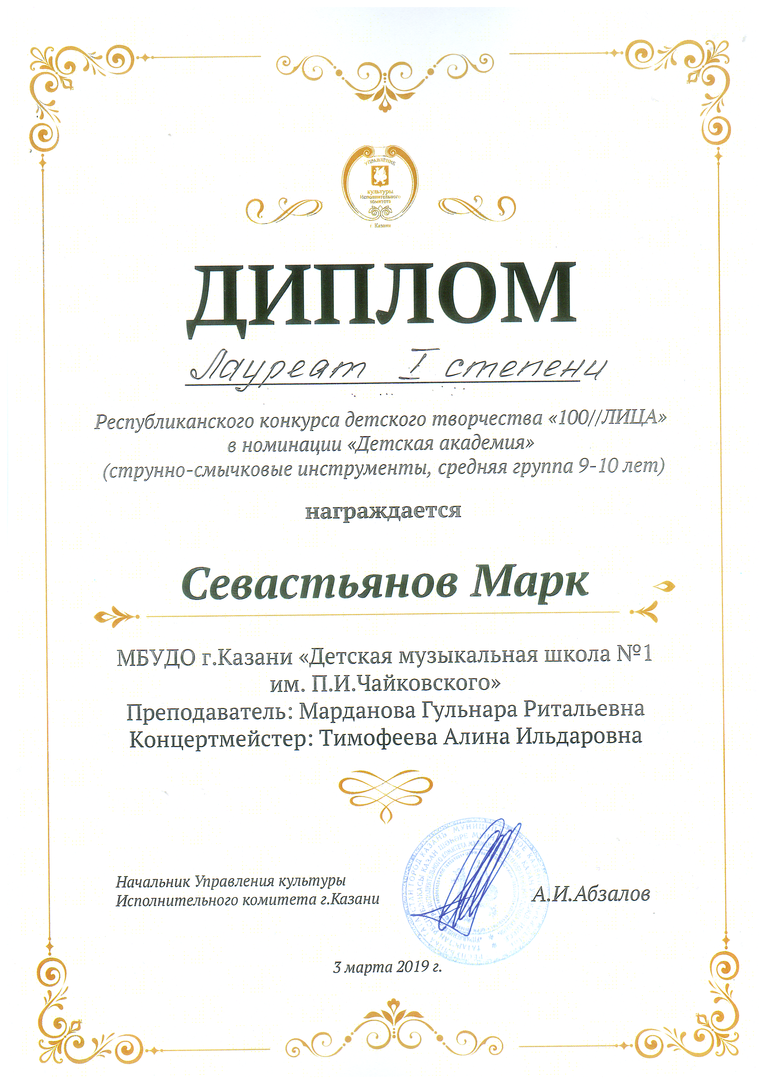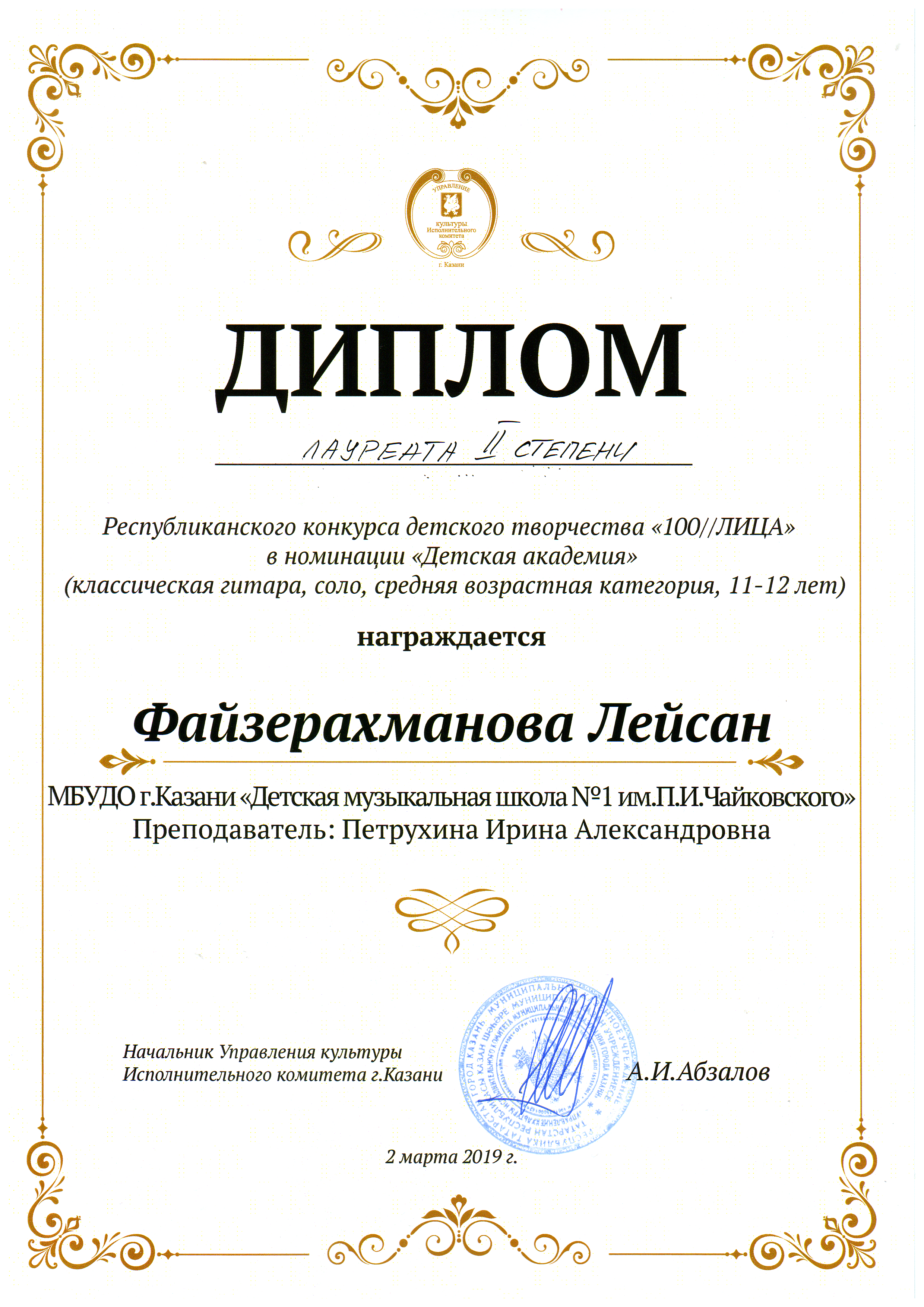 ХV Республиканский конкурс юных исполнителей на домре и балалайке "Звонкие струны" в рамках конкурса детского творчества "100//ЛИЦА"- Лауреат II степени, класс Абызовой Д.М., концертмейстер Абакумова А.Ч.;