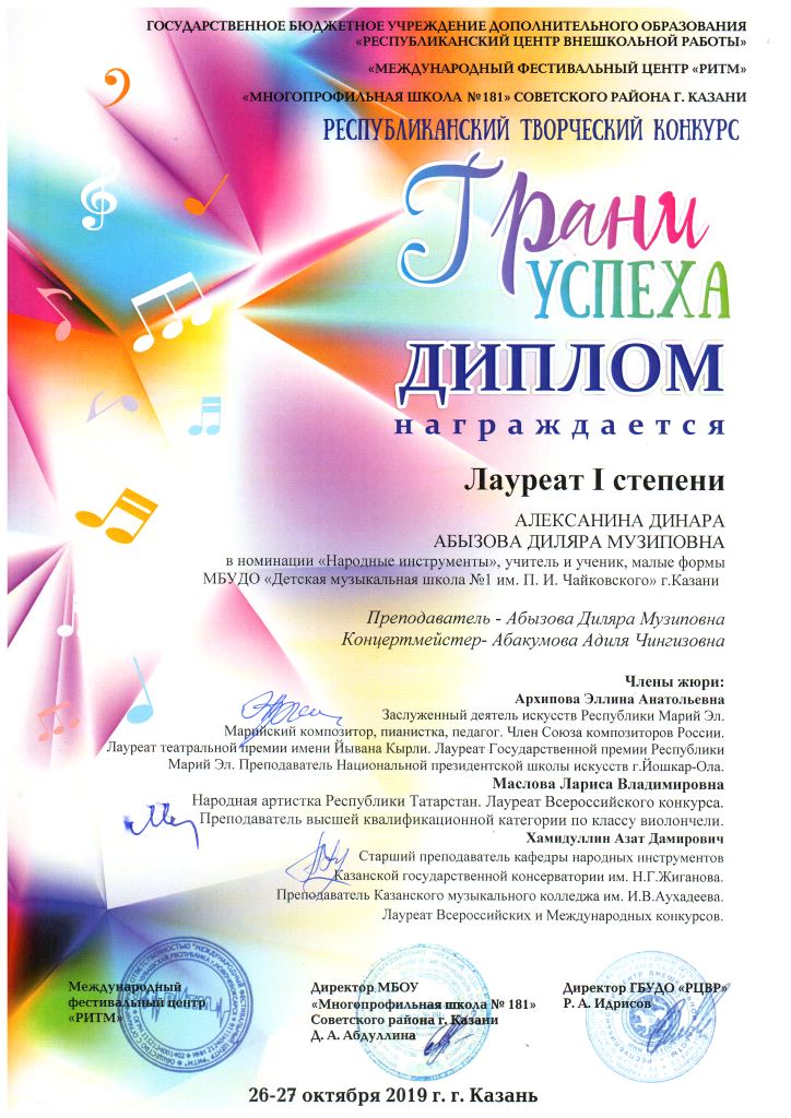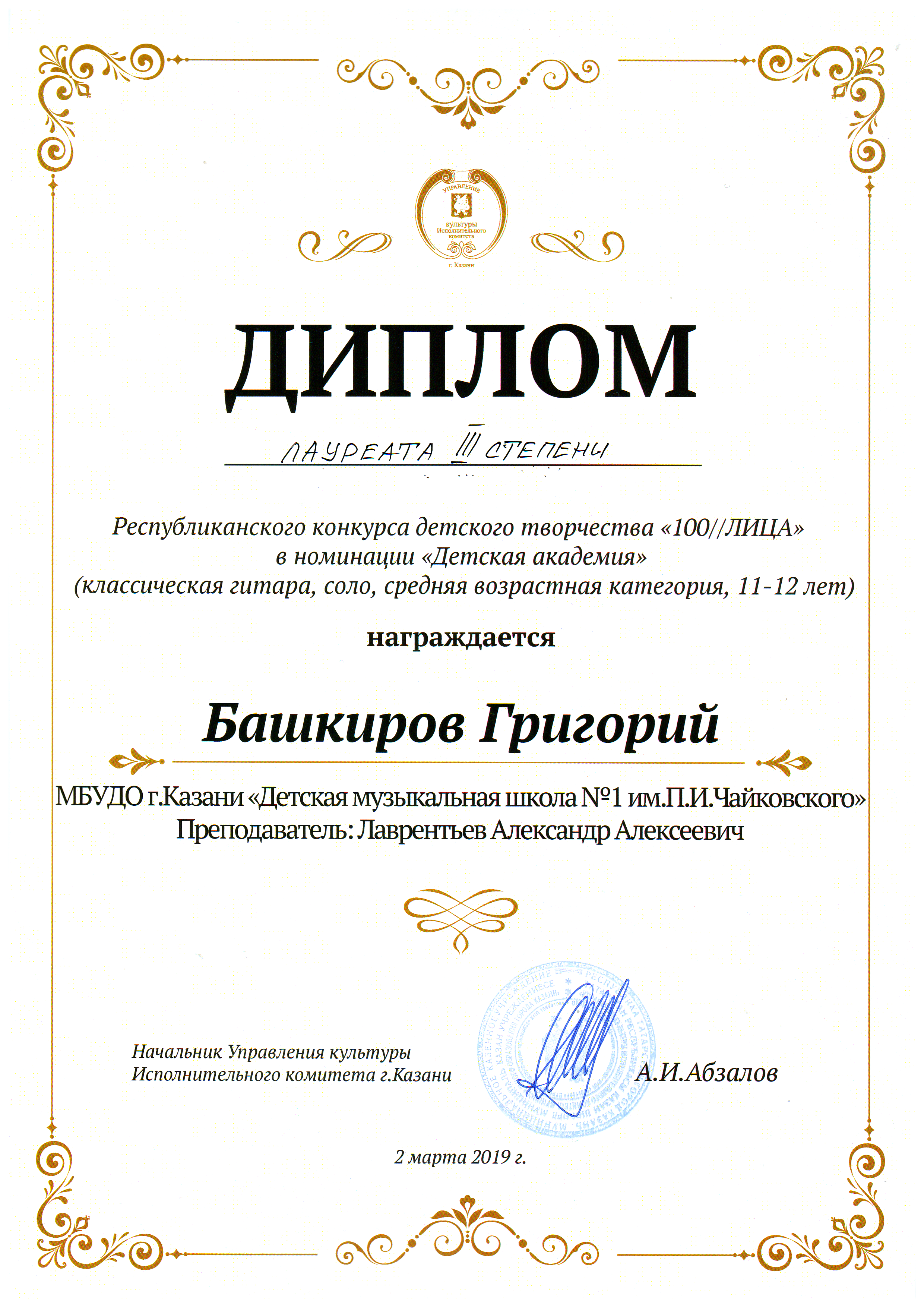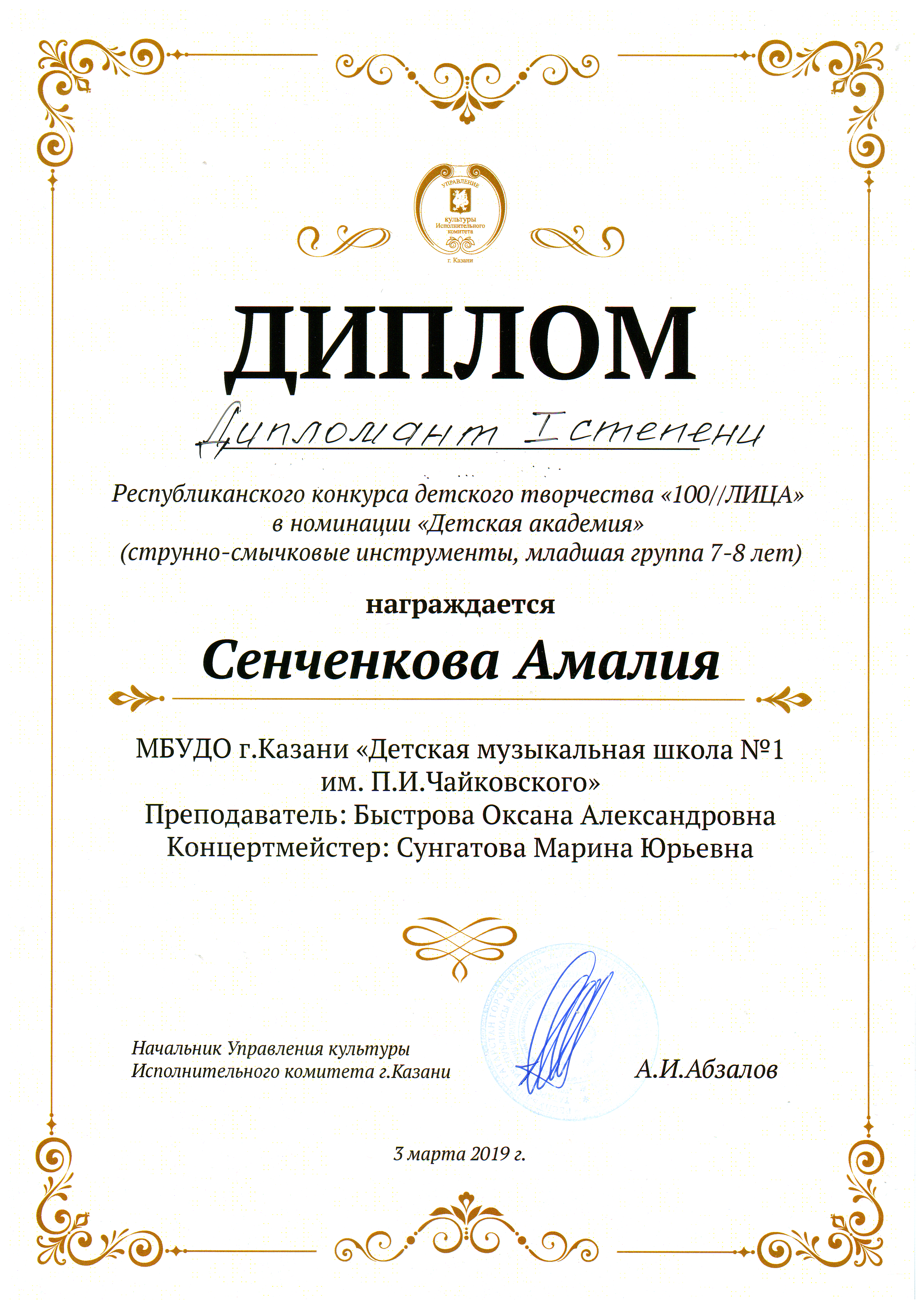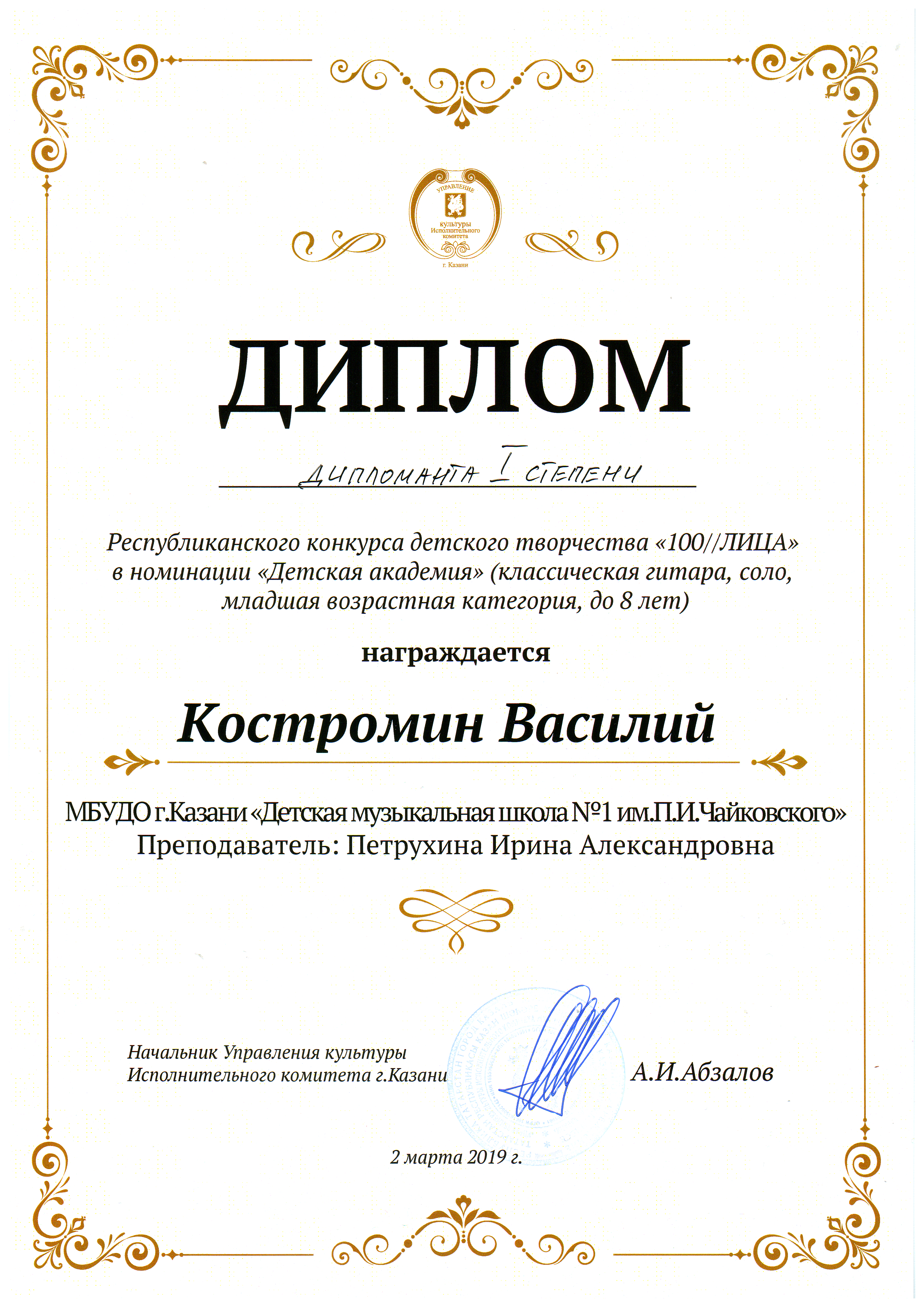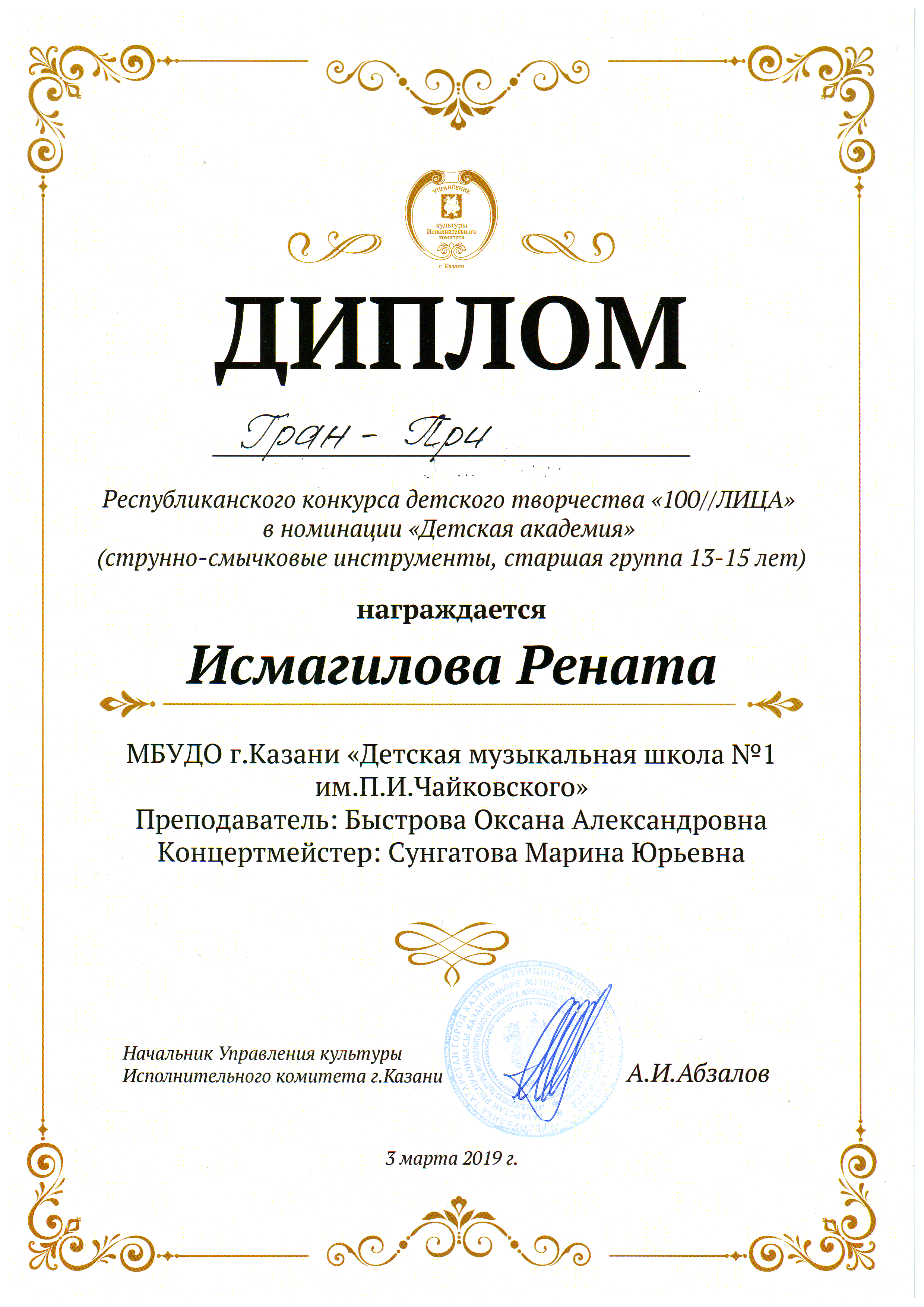 ХV Республиканский конкурс юных исполнителей на домре и балалайке "Звонкие струны" в рамках конкурса детского творчества "100//ЛИЦА"- Лауреат II степени, класс Абызовой Д.М., концертмейстер Абакумова А.Ч.;