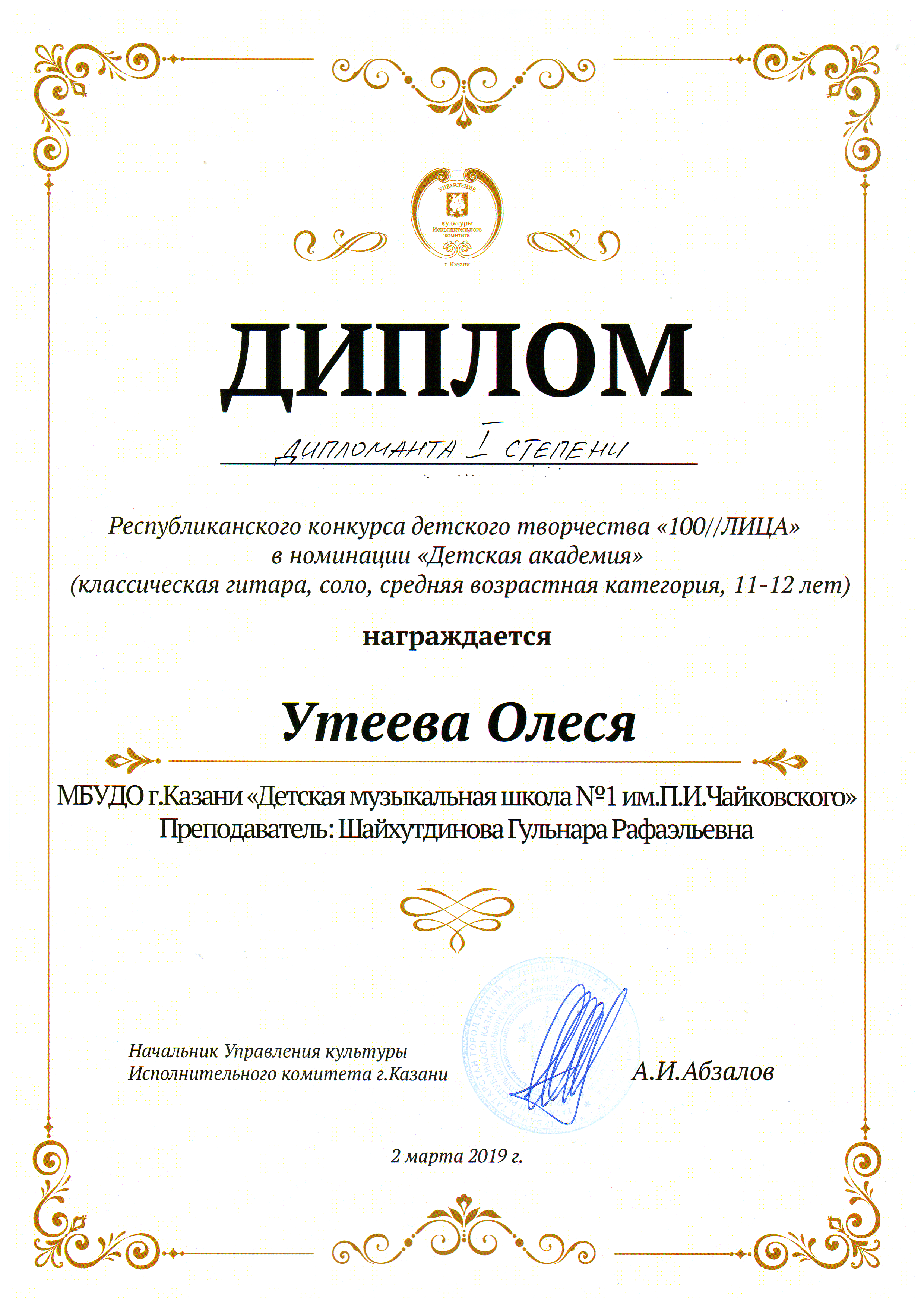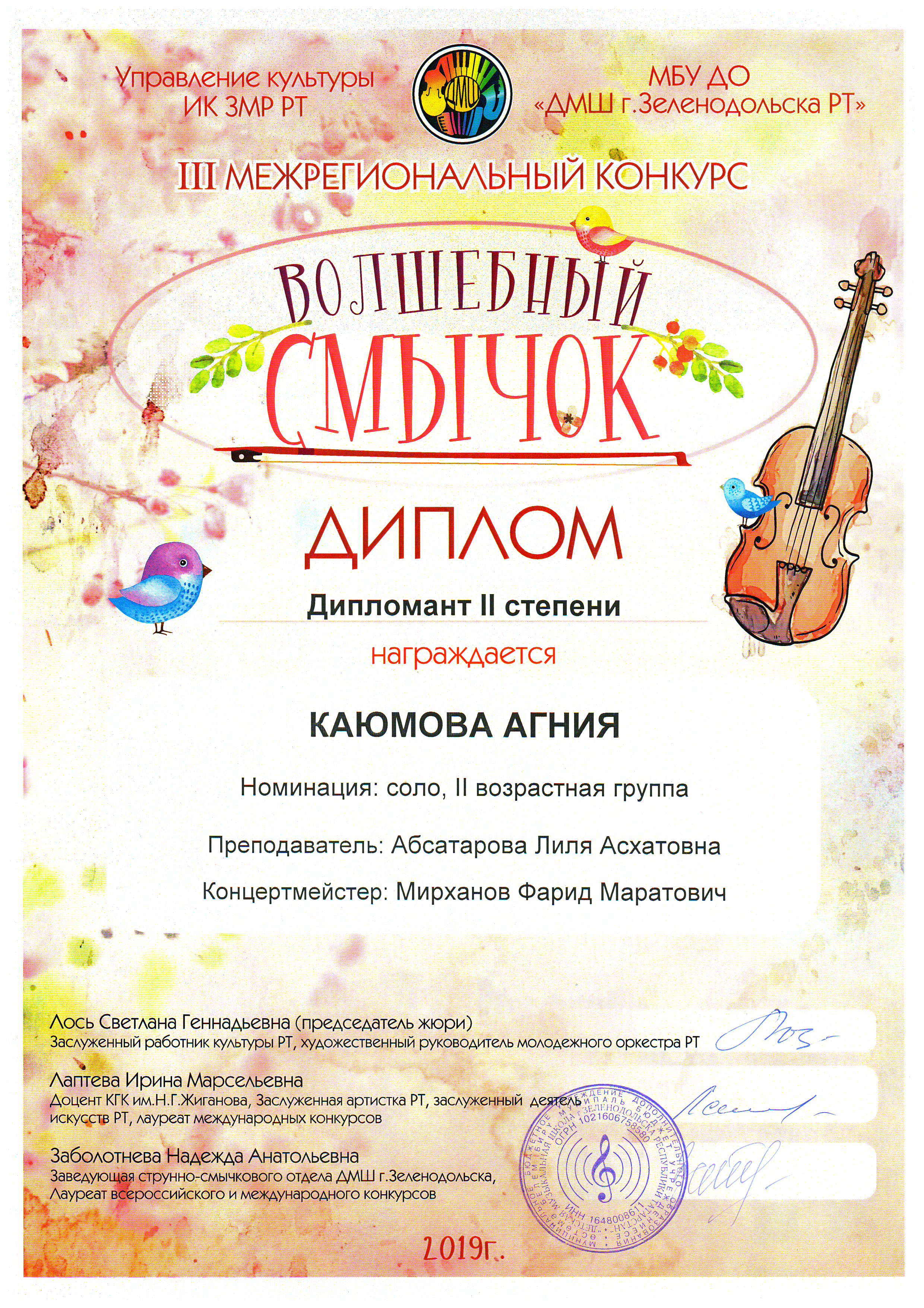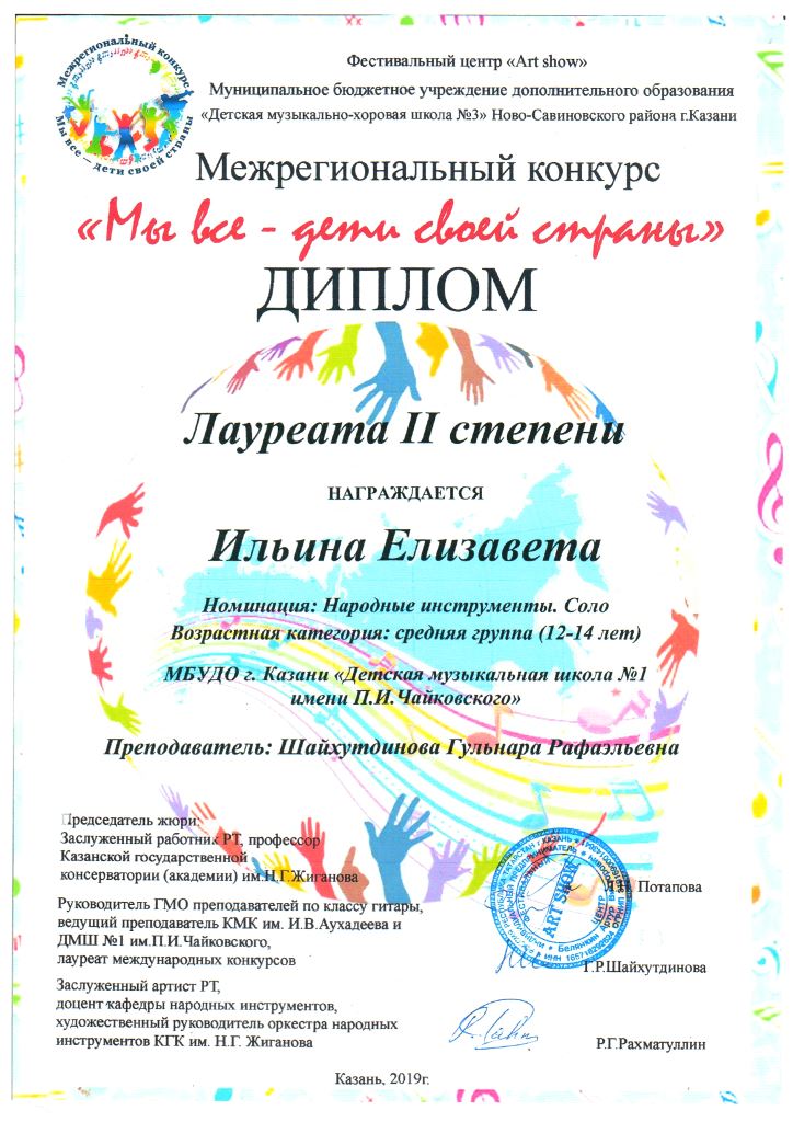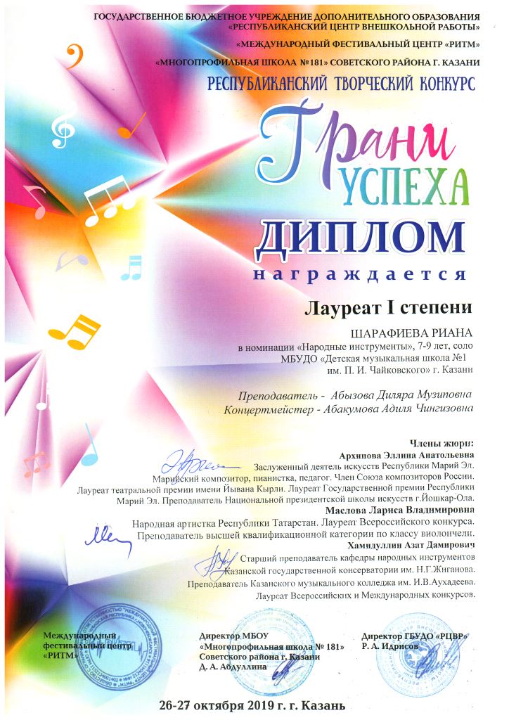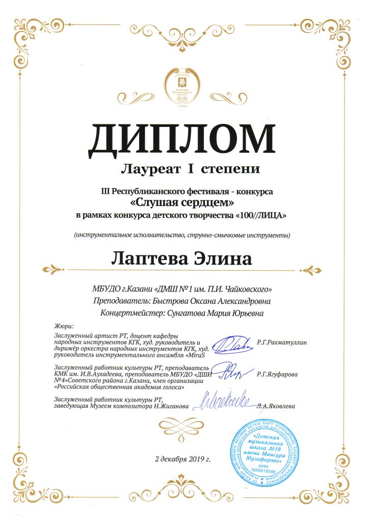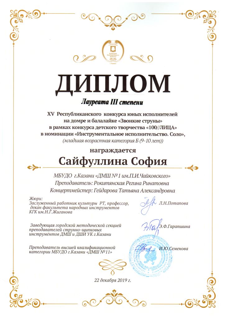 ХV Республиканский конкурс юных исполнителей на домре и балалайке "Звонкие струны" в рамках конкурса детского творчества "100//ЛИЦА"- Лауреат II степени, класс Абызовой Д.М., концертмейстер Абакумова А.Ч.;
