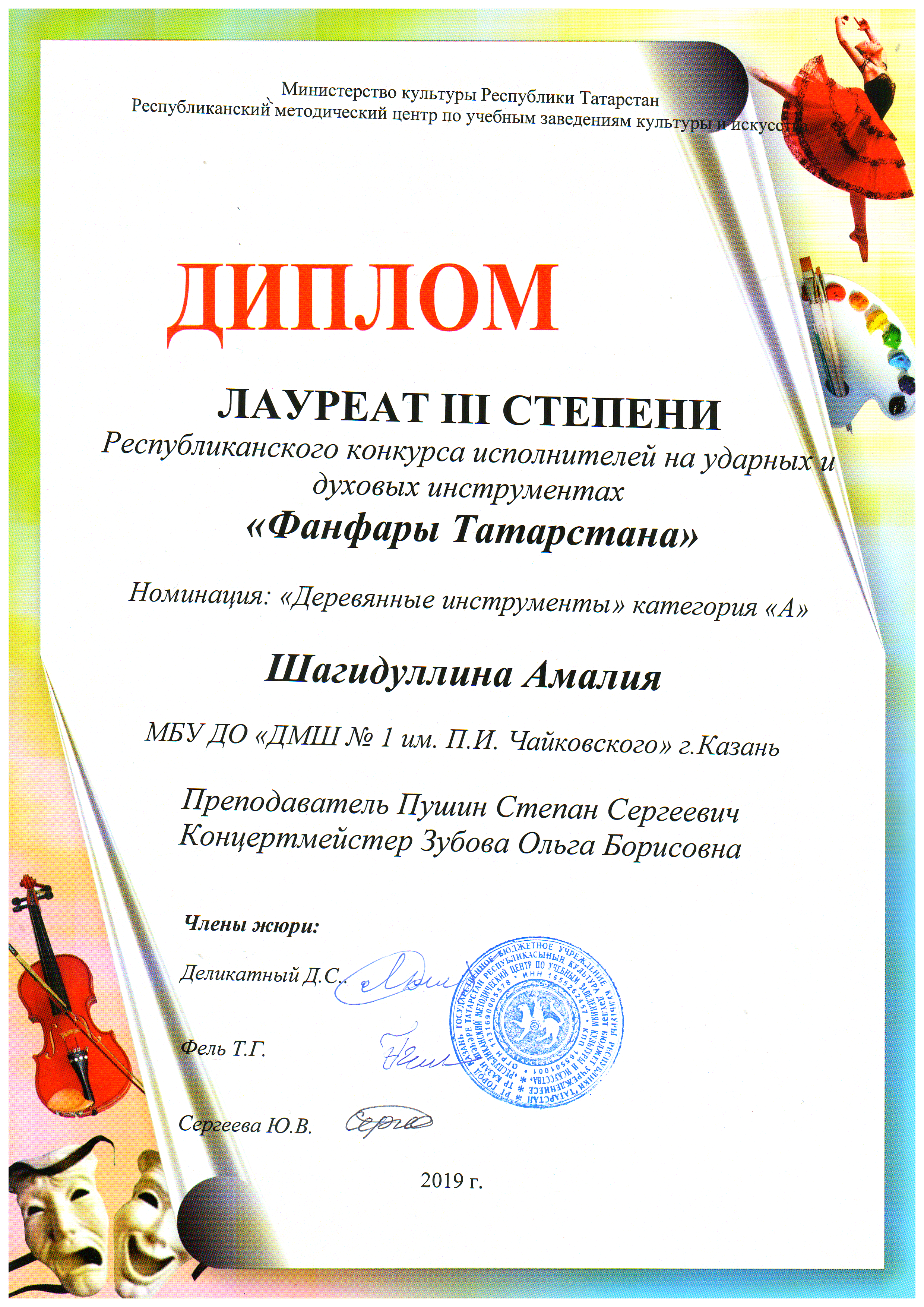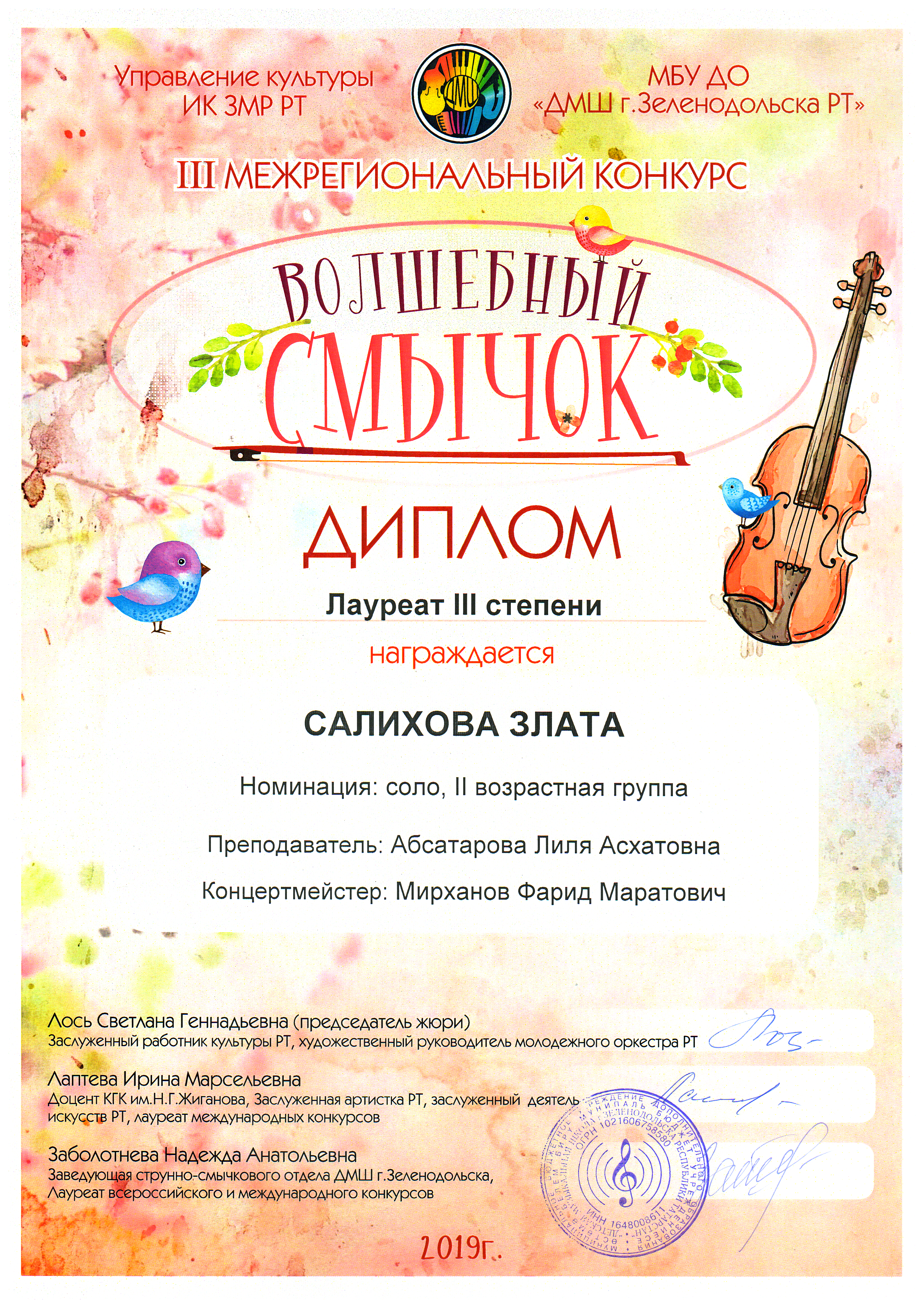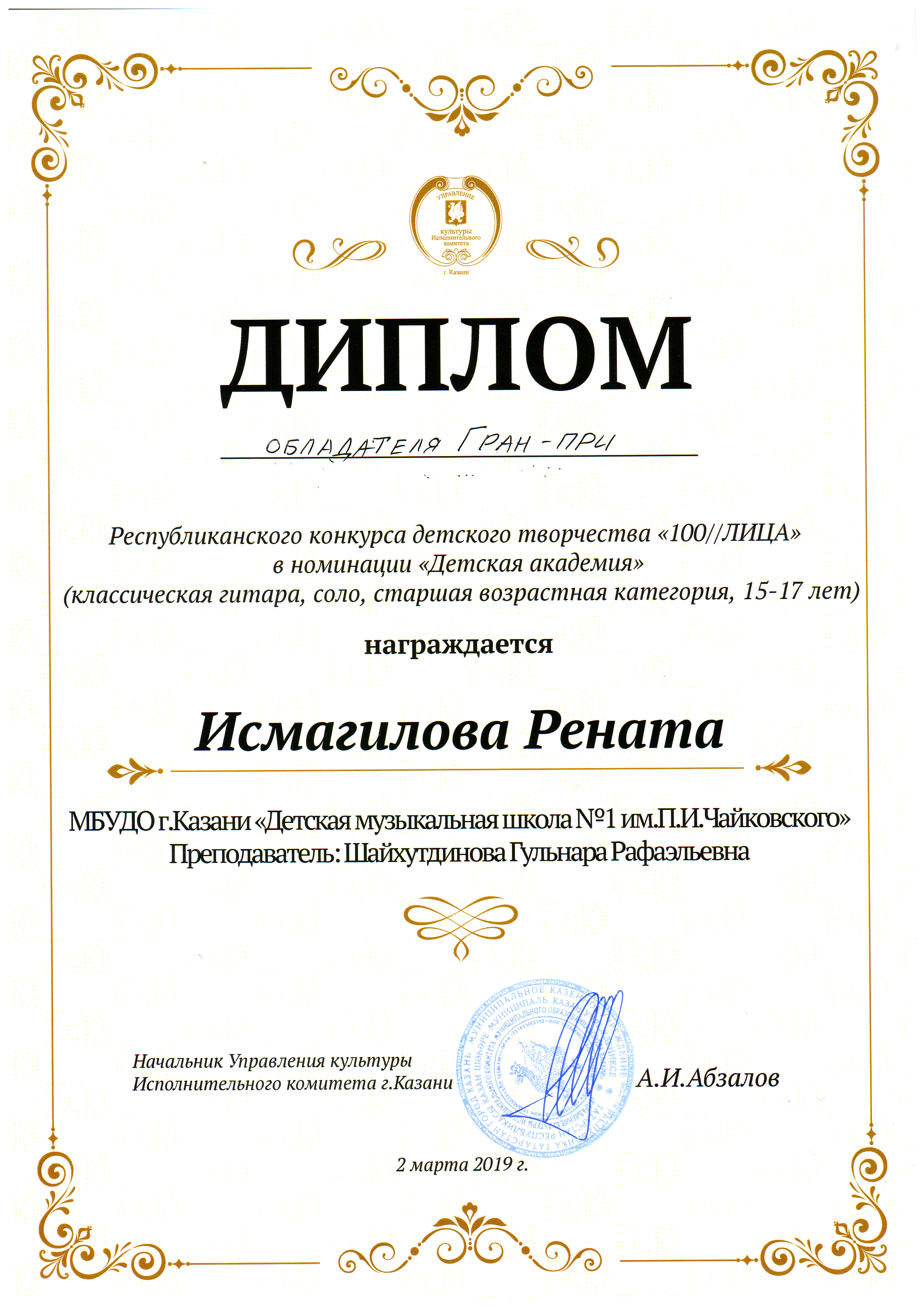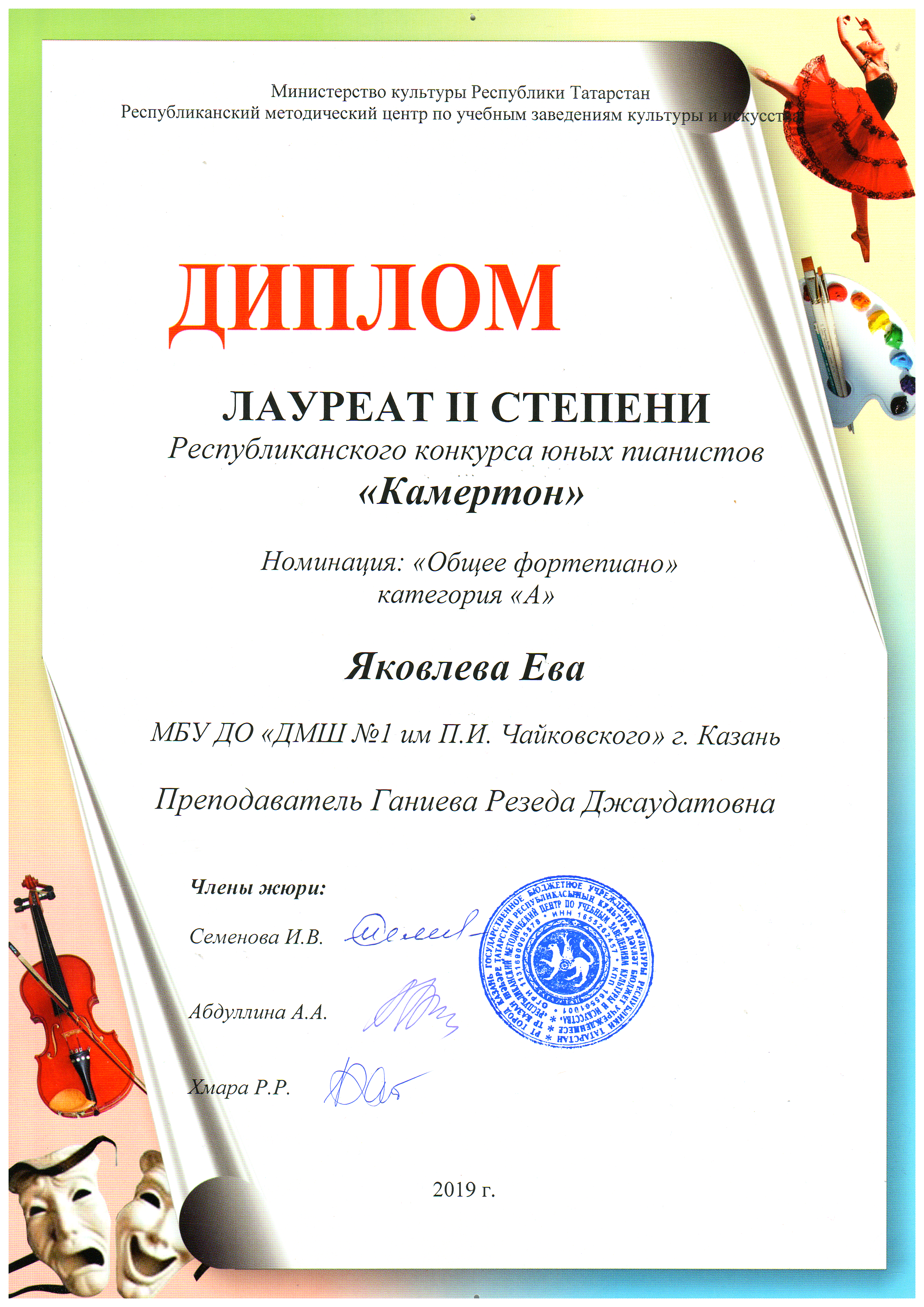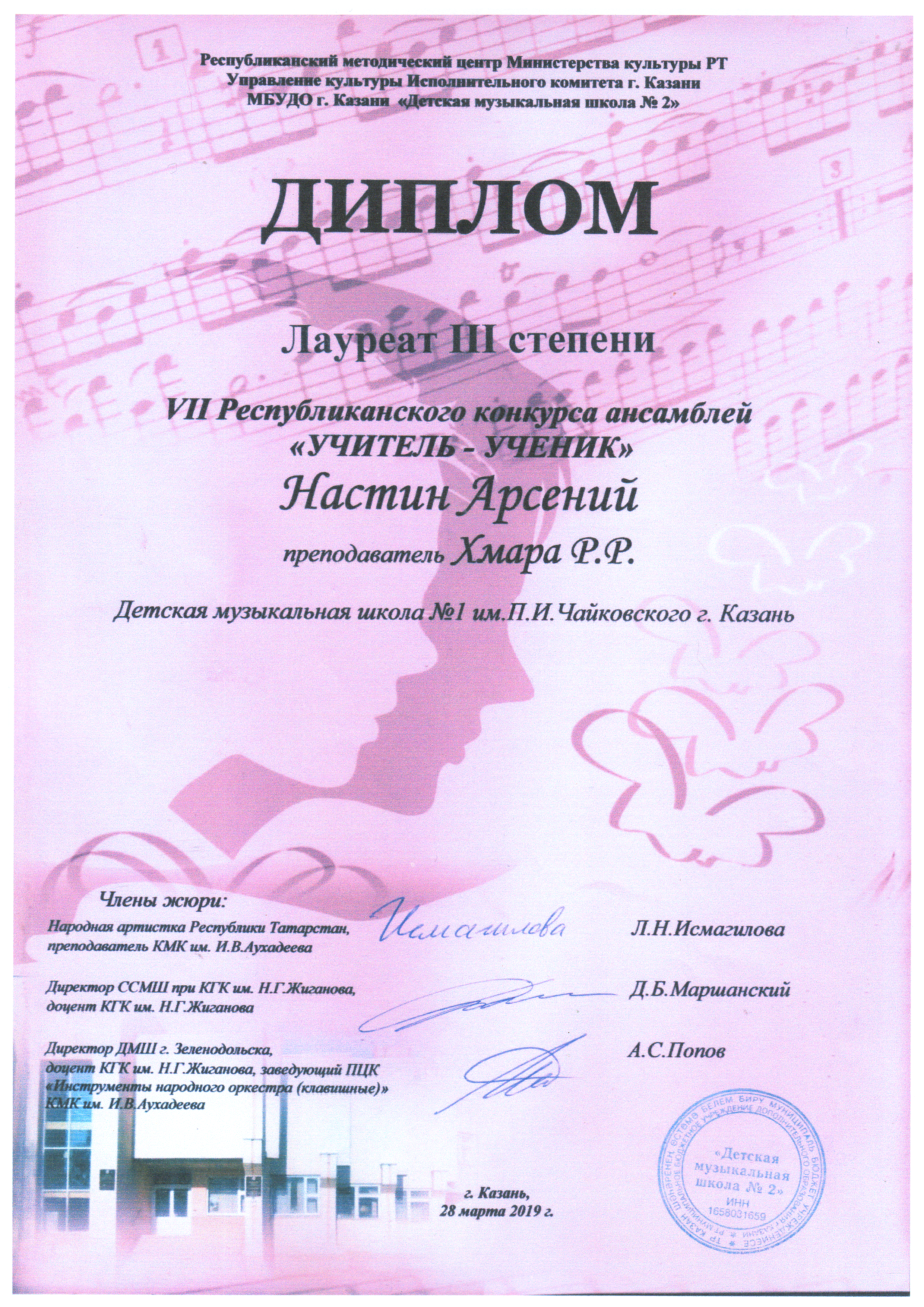 ХV Республиканский конкурс юных исполнителей на домре и балалайке "Звонкие струны" в рамках конкурса детского творчества "100//ЛИЦА"- Лауреат II степени, класс Абызовой Д.М., концертмейстер Абакумова А.Ч.;