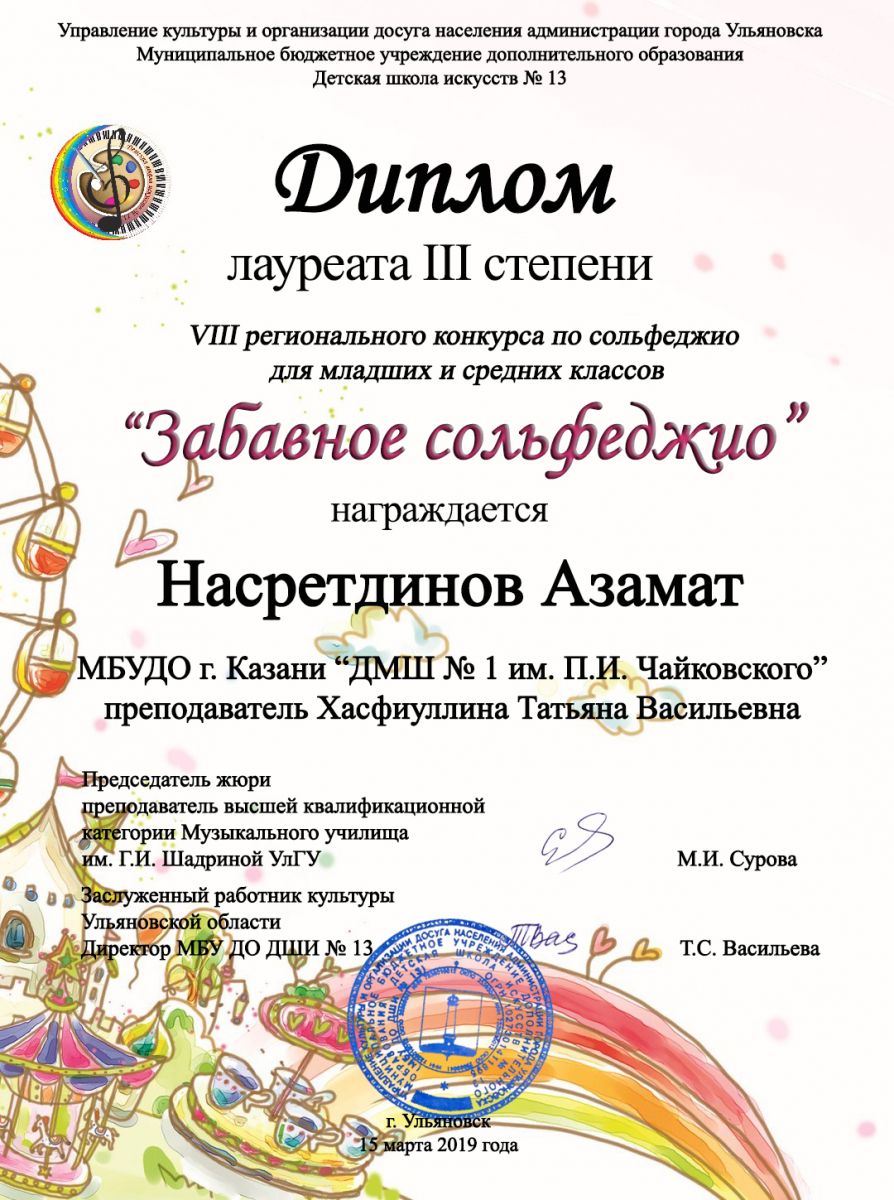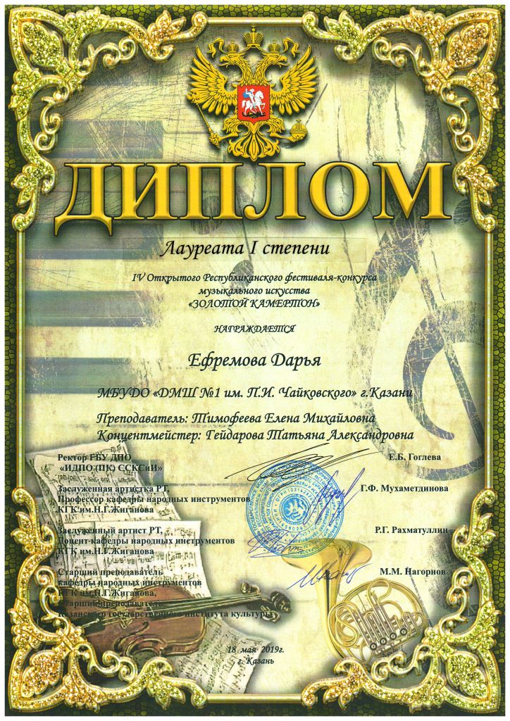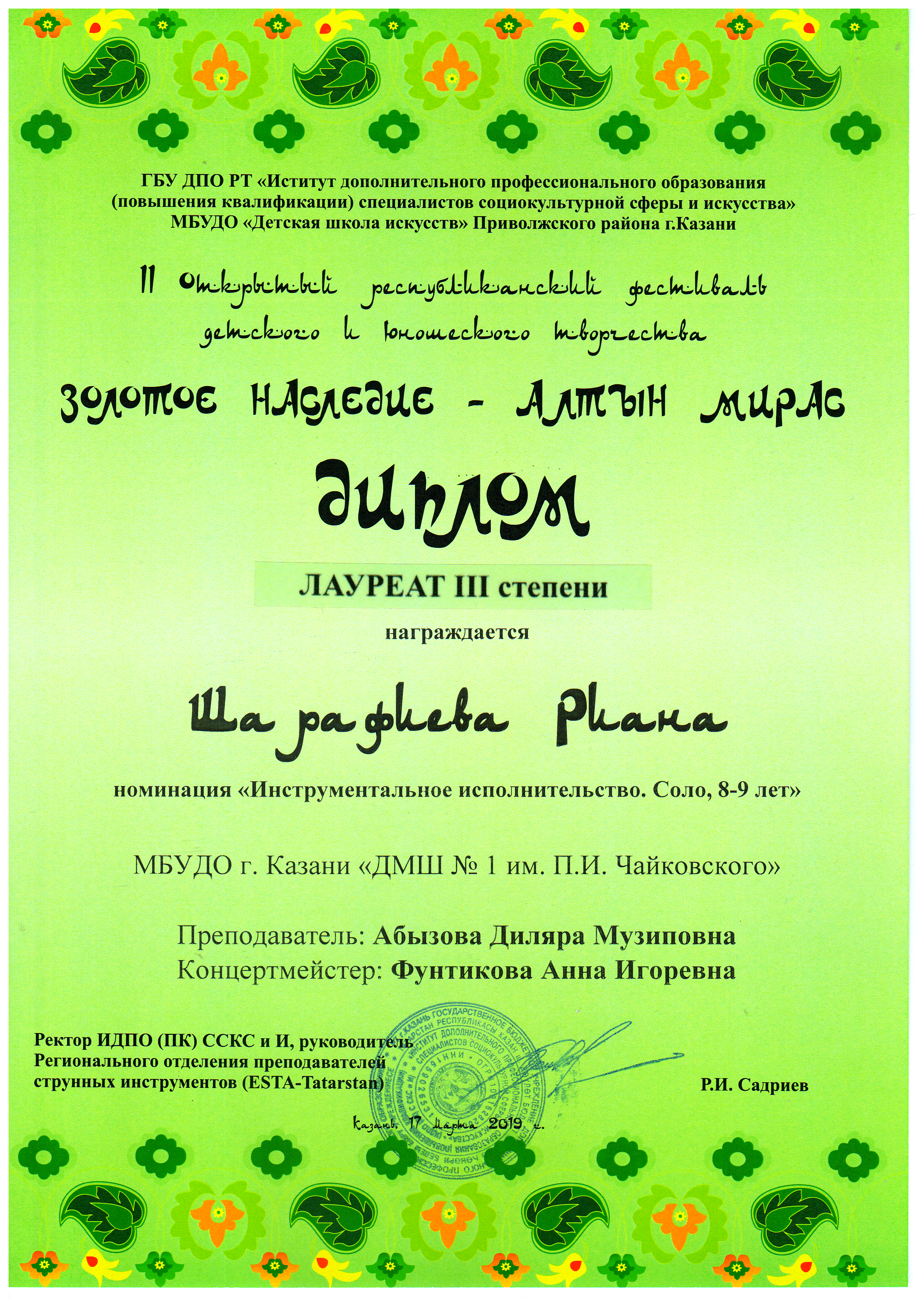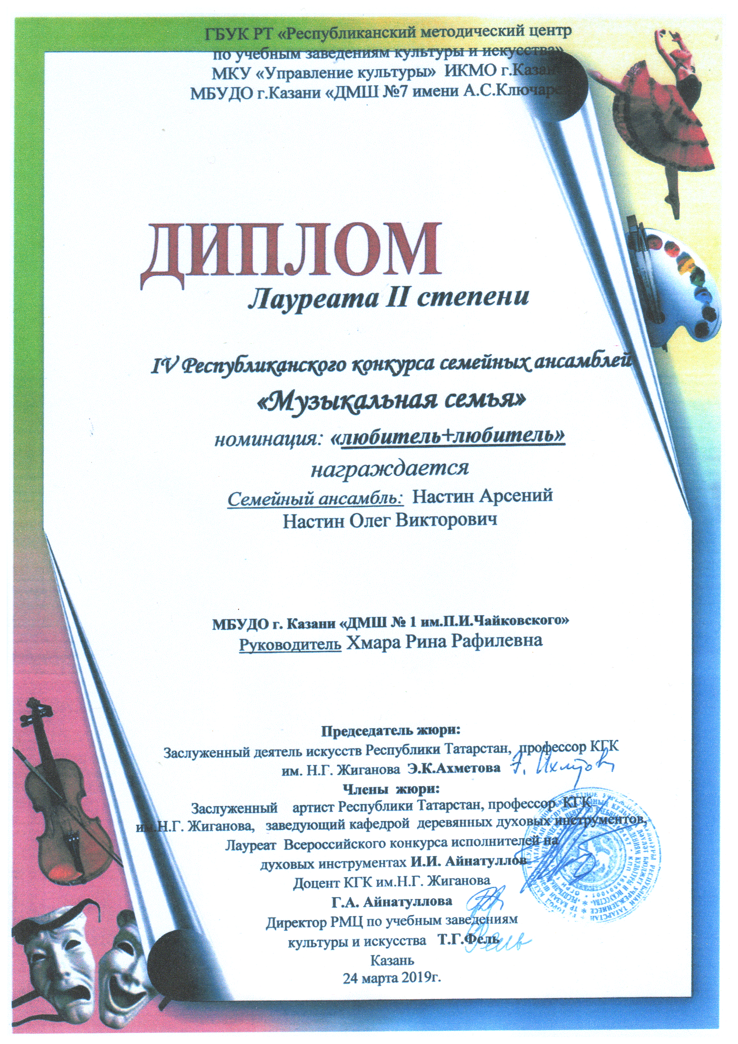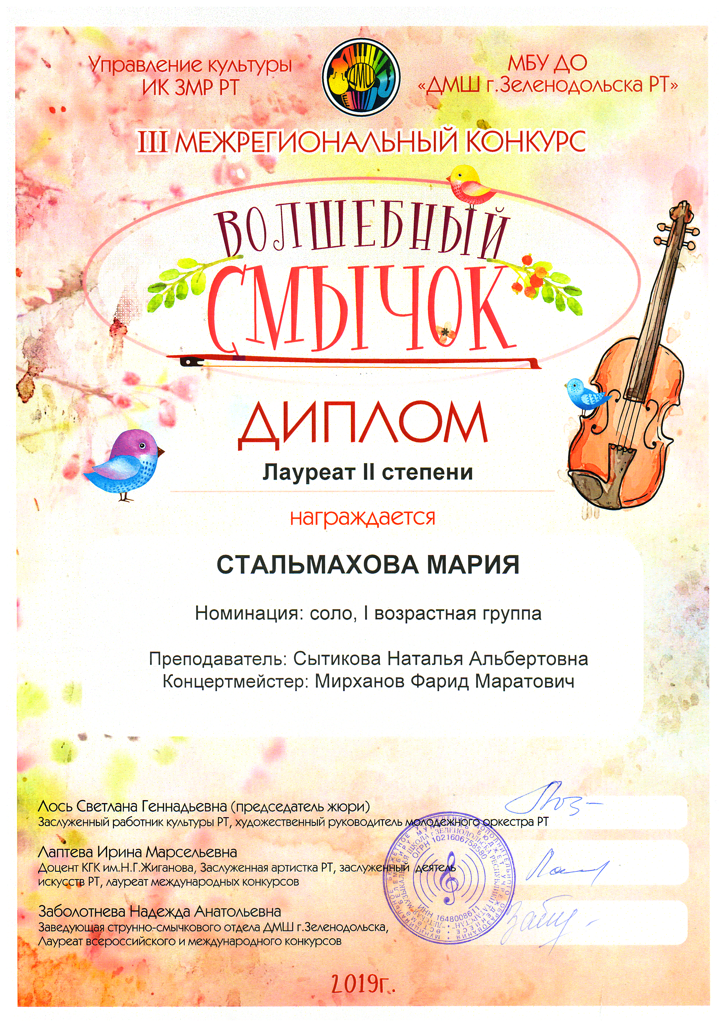 ХV Республиканский конкурс юных исполнителей на домре и балалайке "Звонкие струны" в рамках конкурса детского творчества "100//ЛИЦА"- Лауреат II степени, класс Абызовой Д.М., концертмейстер Абакумова А.Ч.;
