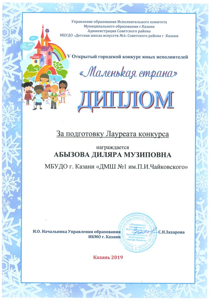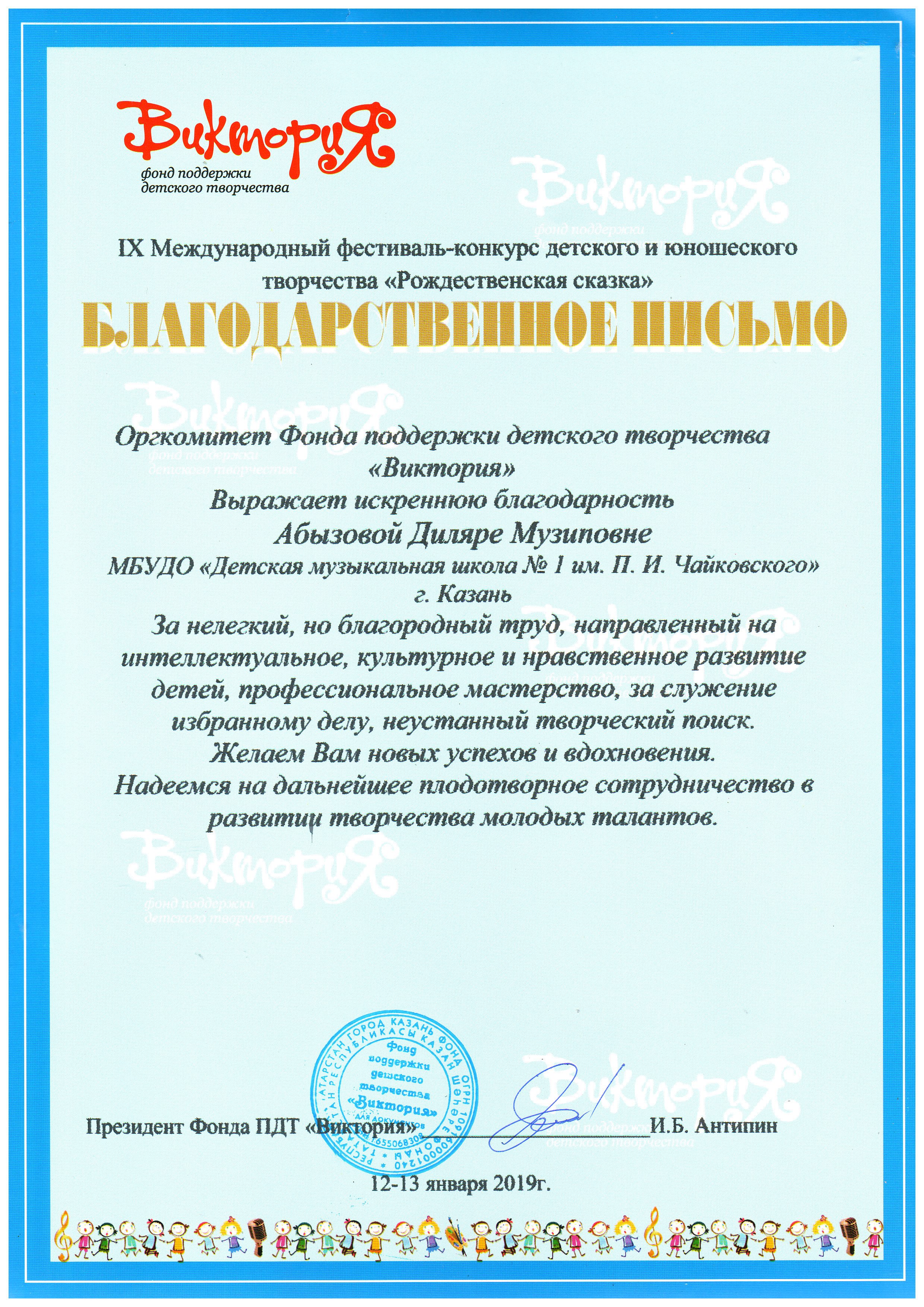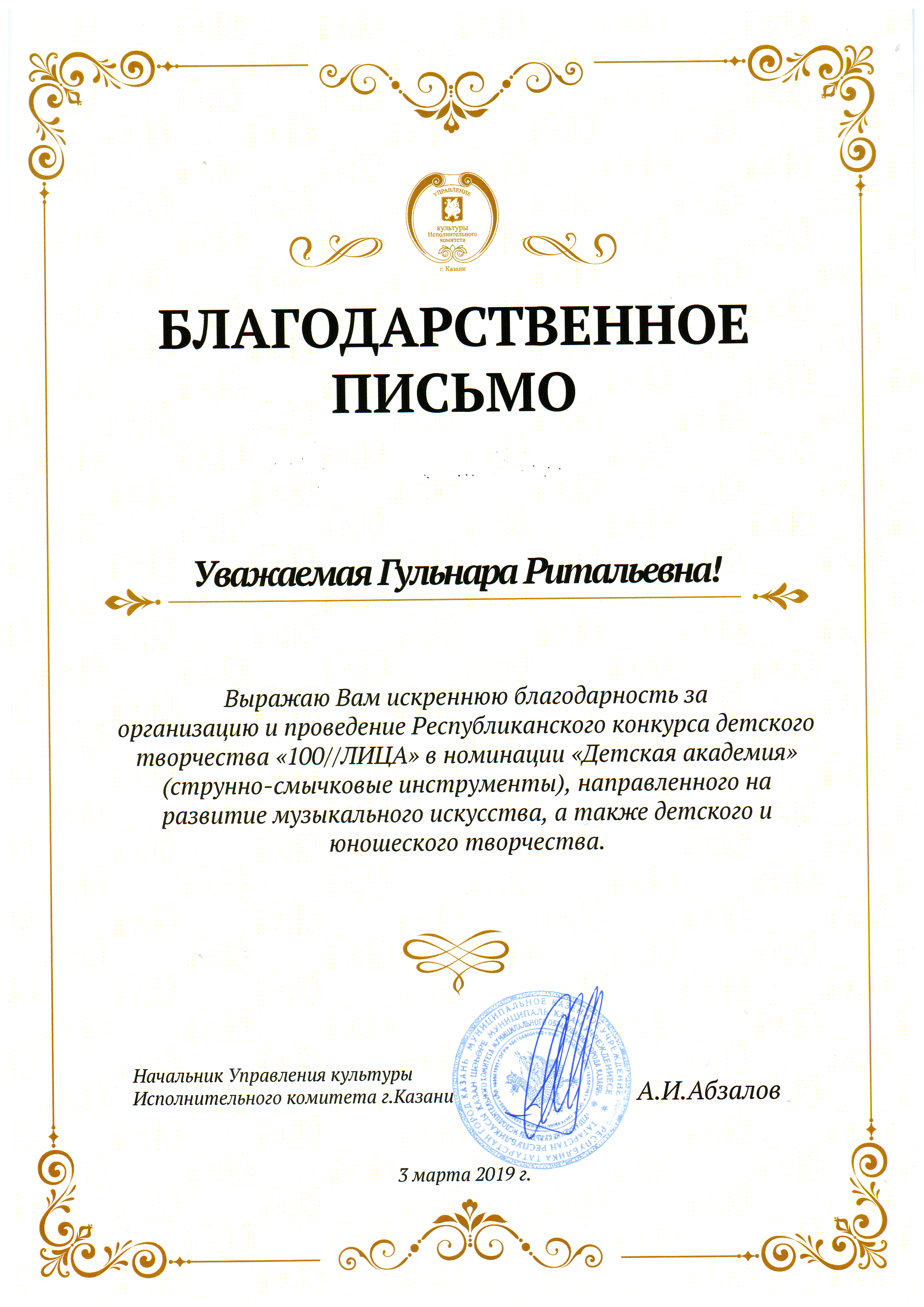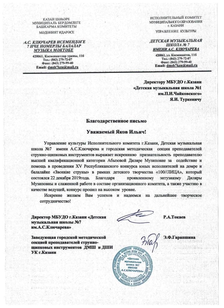 ХV Республиканский конкурс юных исполнителей на домре и балалайке "Звонкие струны" в рамках конкурса детского творчества "100//ЛИЦА"- Благодарственное письмо Абызовой Д.М. за помощь в проведении конкурса;
