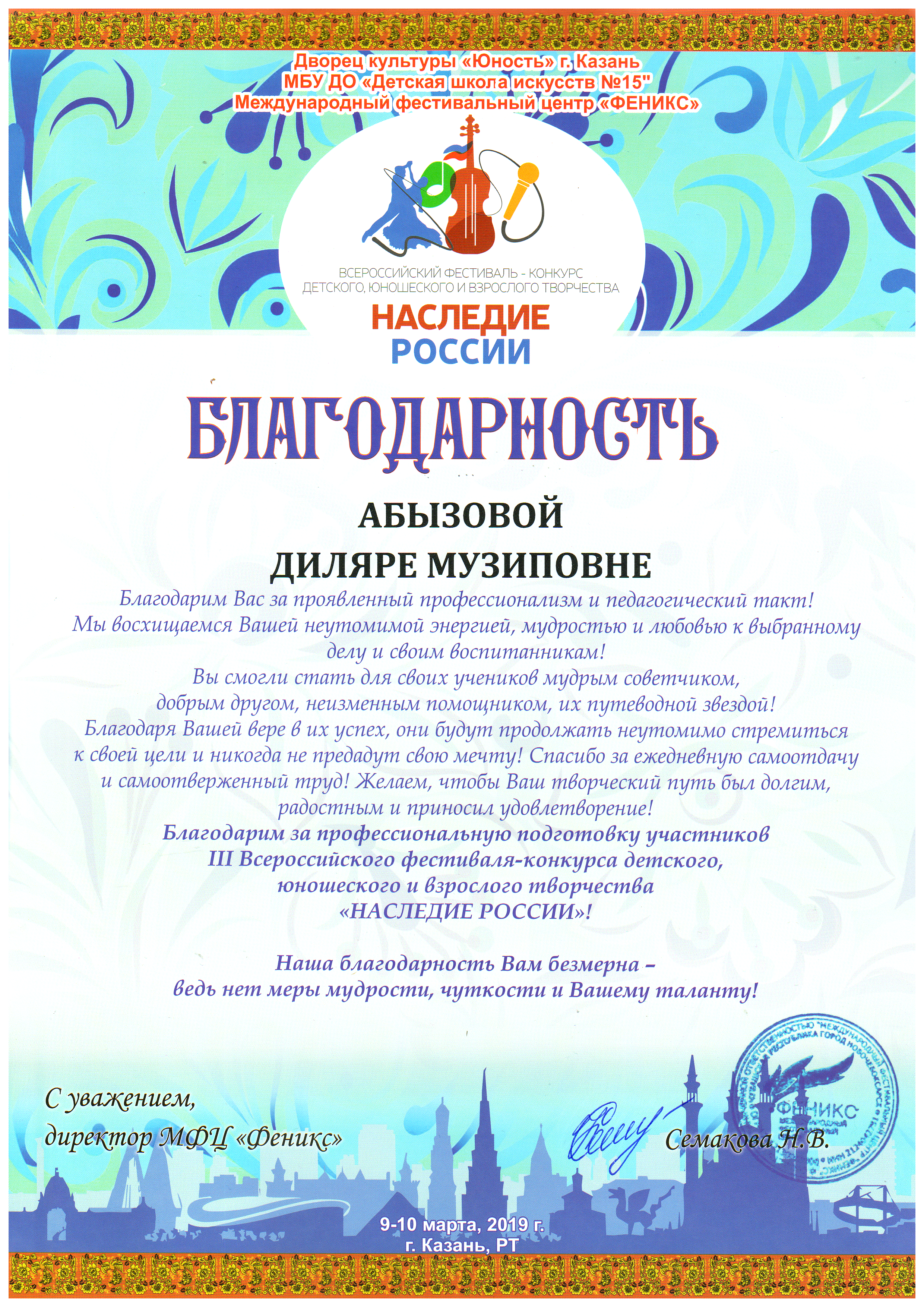 Всероссийский фестиваль детского, юношеского и взрослого творчества "Наследие России" - Абызова Д.М., Благодарность;
