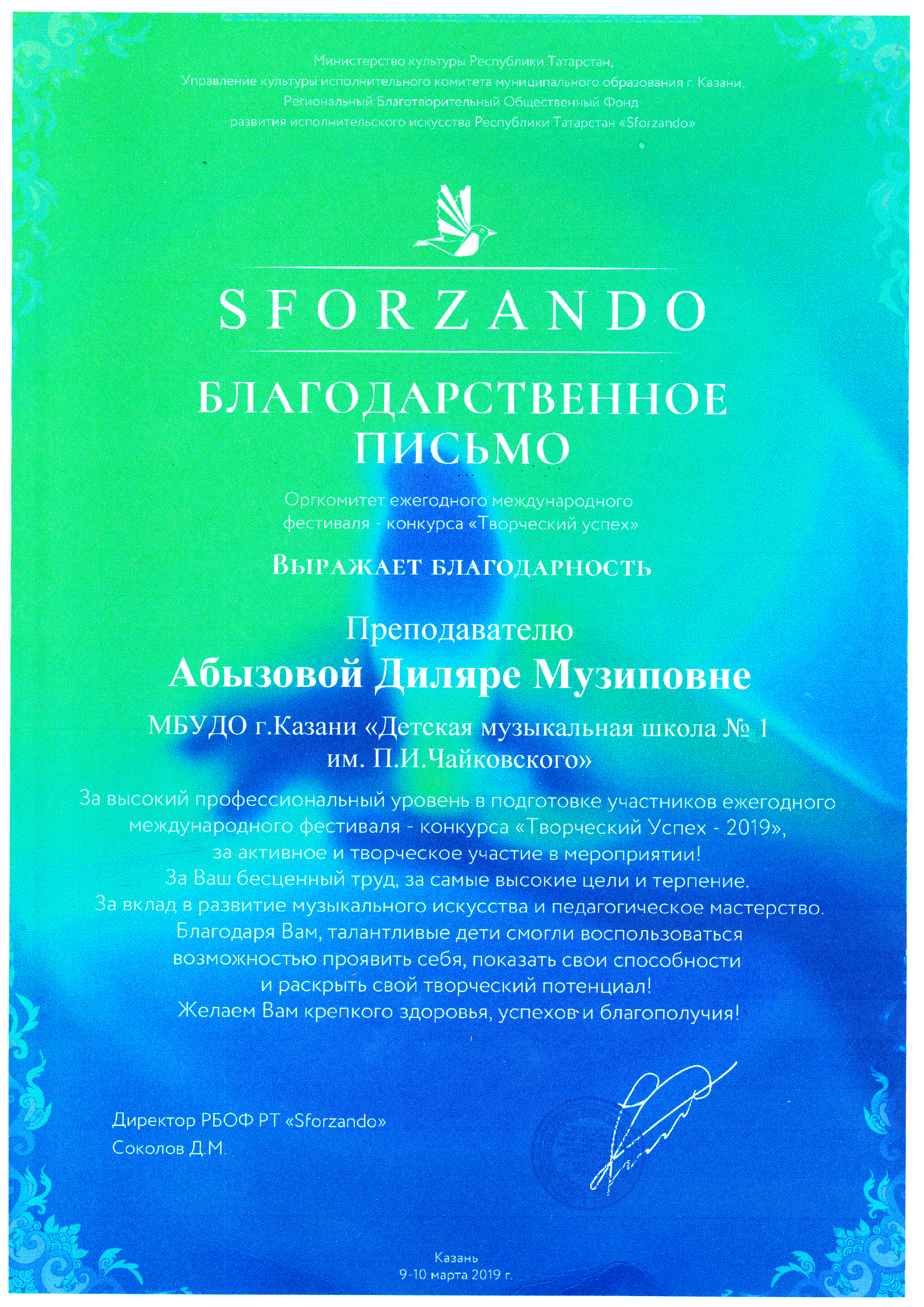 Международный конкурс-фестиваль "Sforzando" - Благодарность Кашаповой Г.М.;