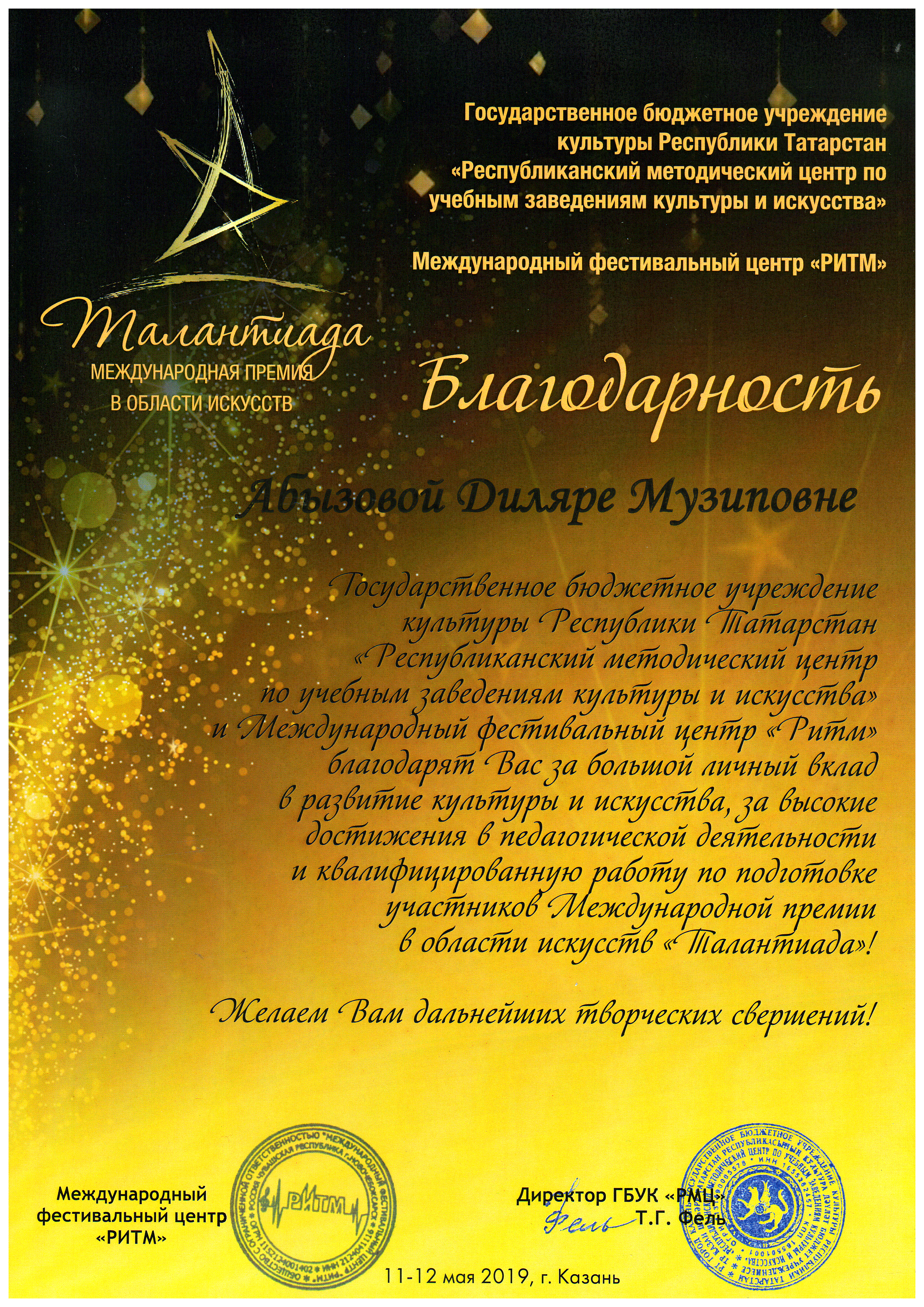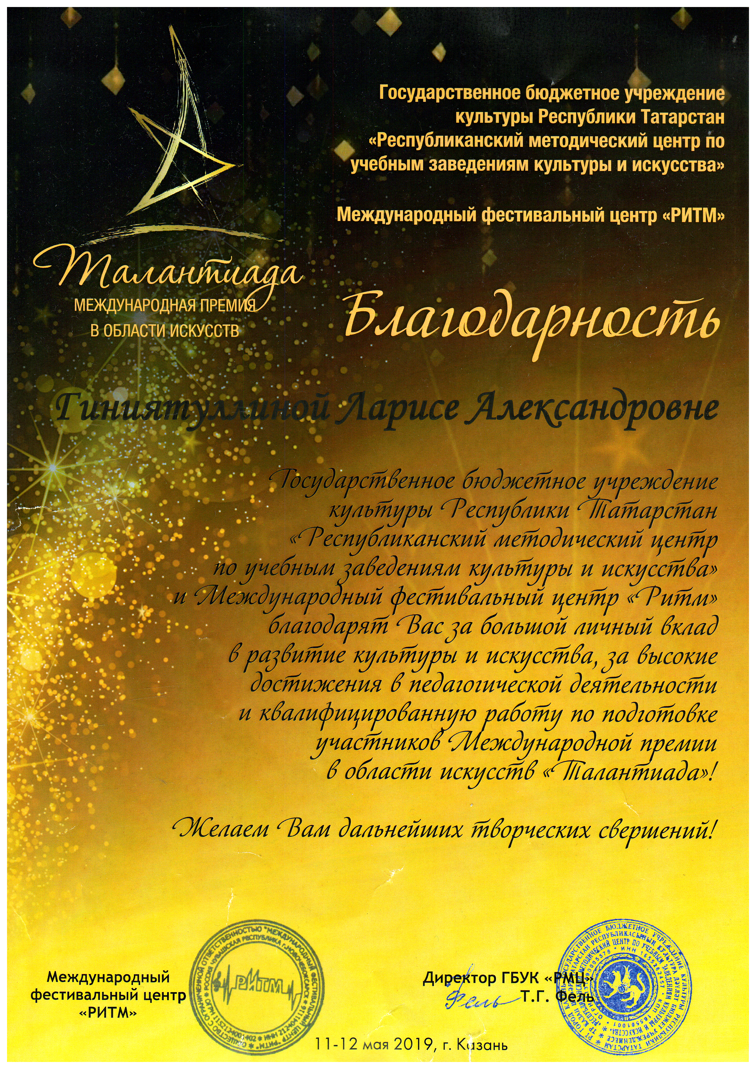 Международная премия в области искусств "Талантиада" - Благодарность Гиниятуллиной Л.А.;