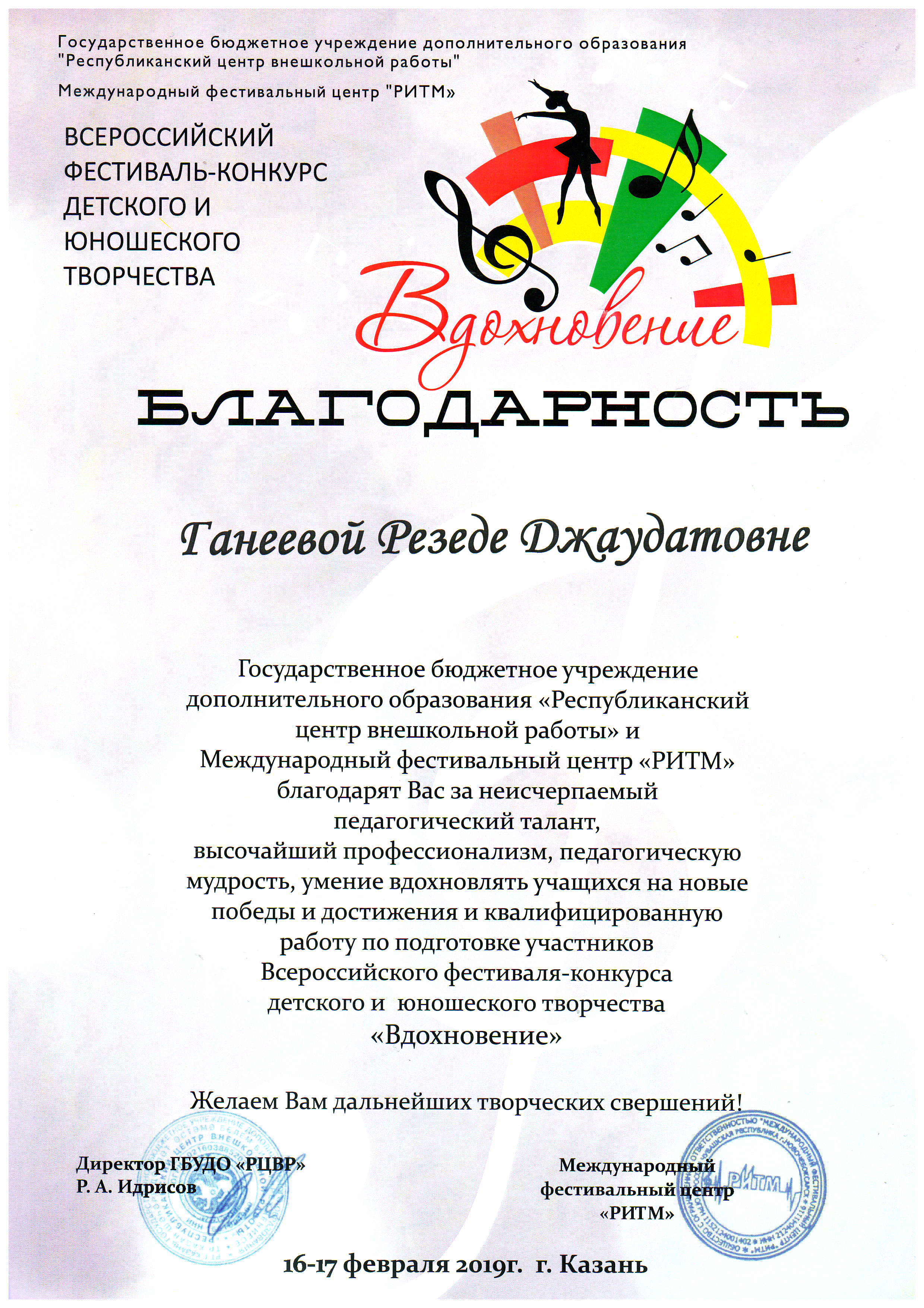 Всероссийский фестиваль-конкурс детского и юношеского творчества "Вдохновение" - Благодарность Ганиевой Р.Д.;