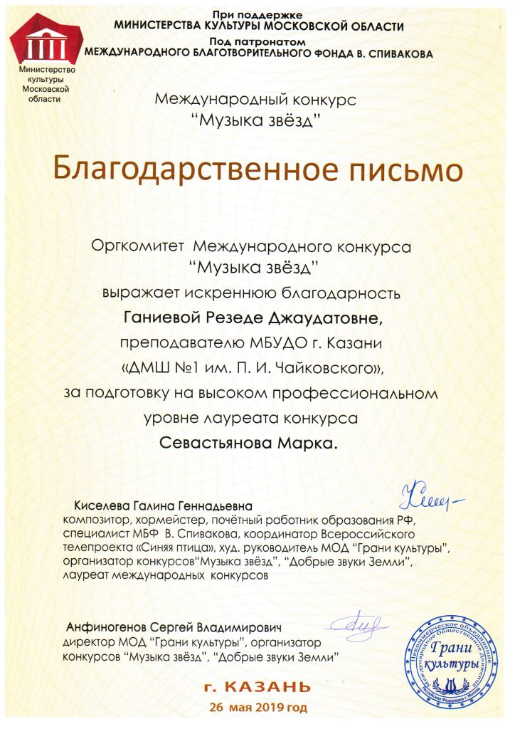 Международный конкурс "Музыка звёзд" - Благодарственное письмо Ганиевой Р.Д.;