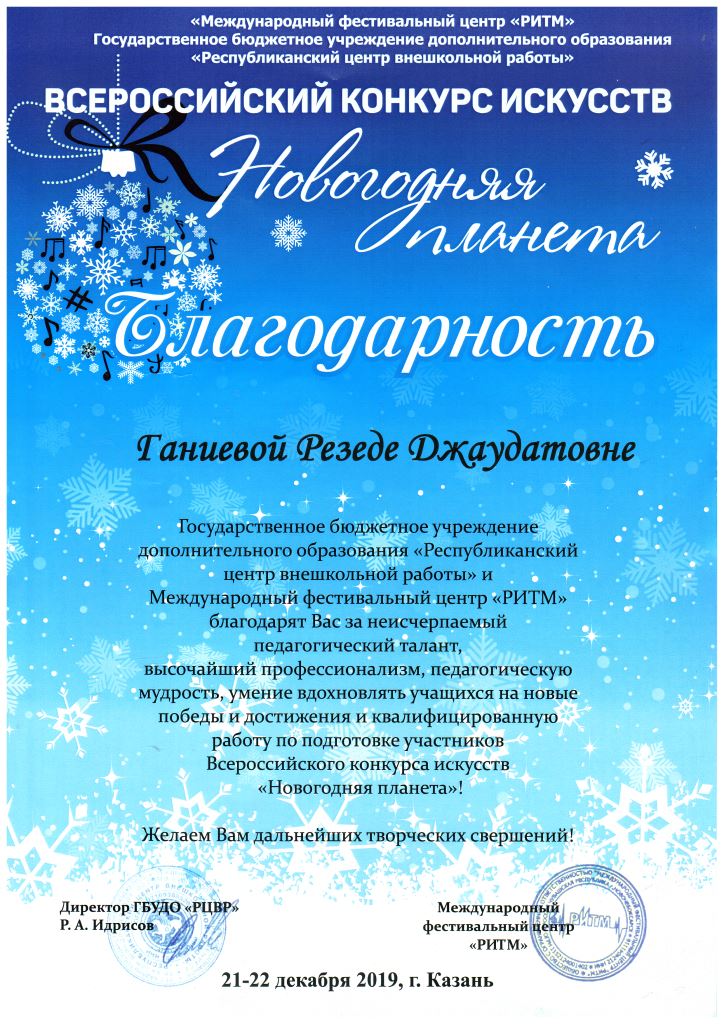 Всероссийский конкурс искусств "Новогодняя планета" - Благодарность Ганиевой Р.Д.;
